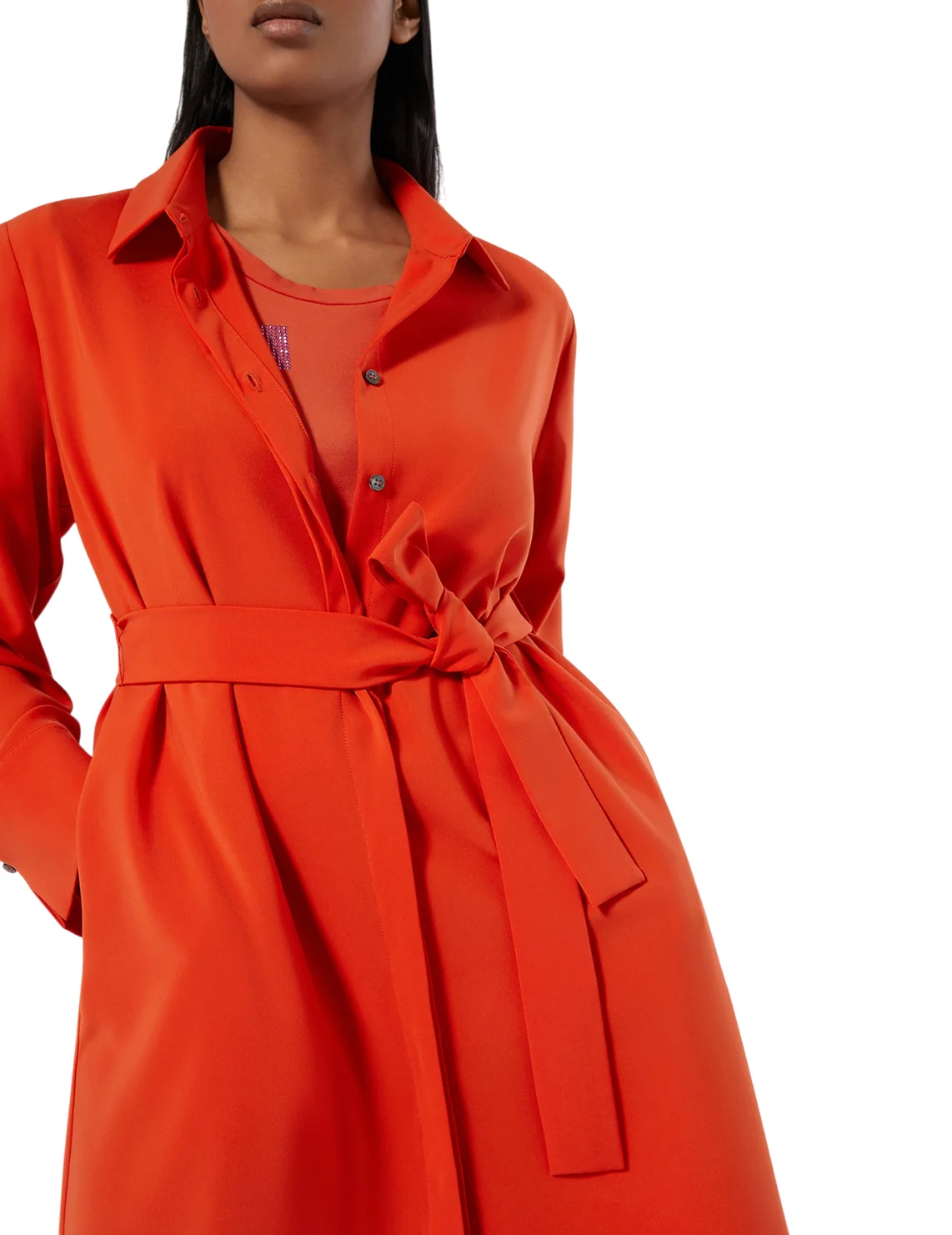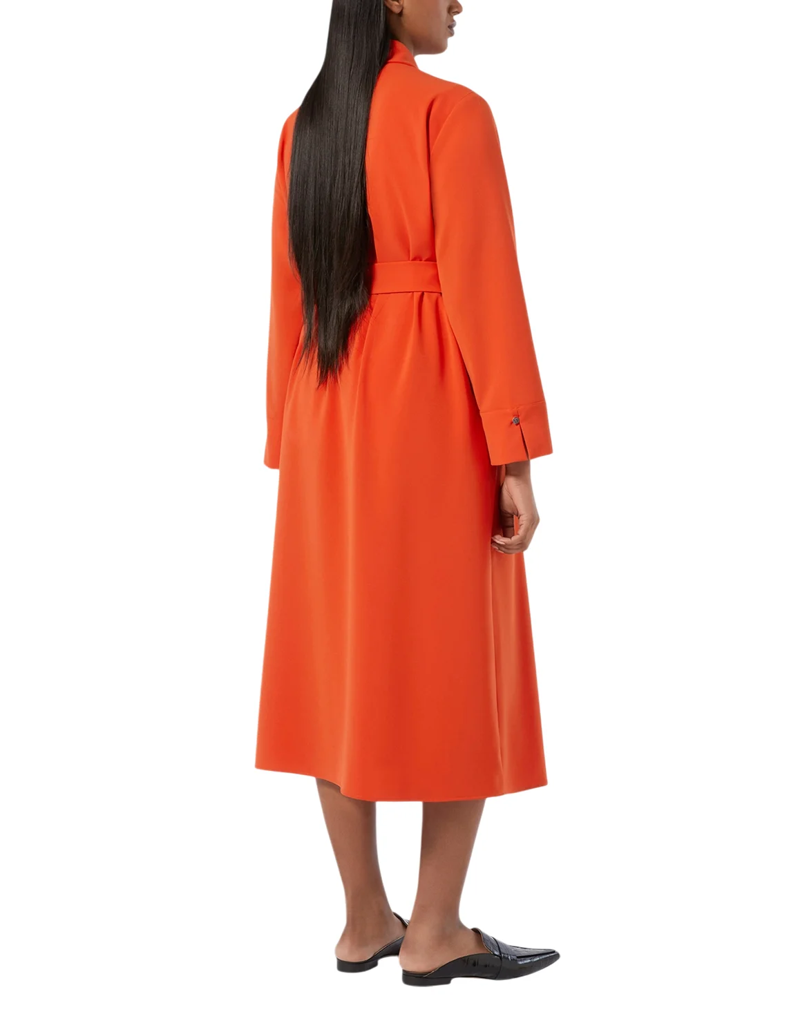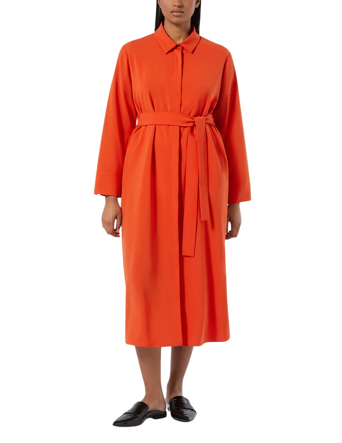 Платье изготовлено из полиэстера и эластана. Модель длины миди выполнена в прямом крое. Имеет отложной воротник, потайную планку с пуговицами, пояс в тон, прорезные карманы и длинные рукава с манжетами.