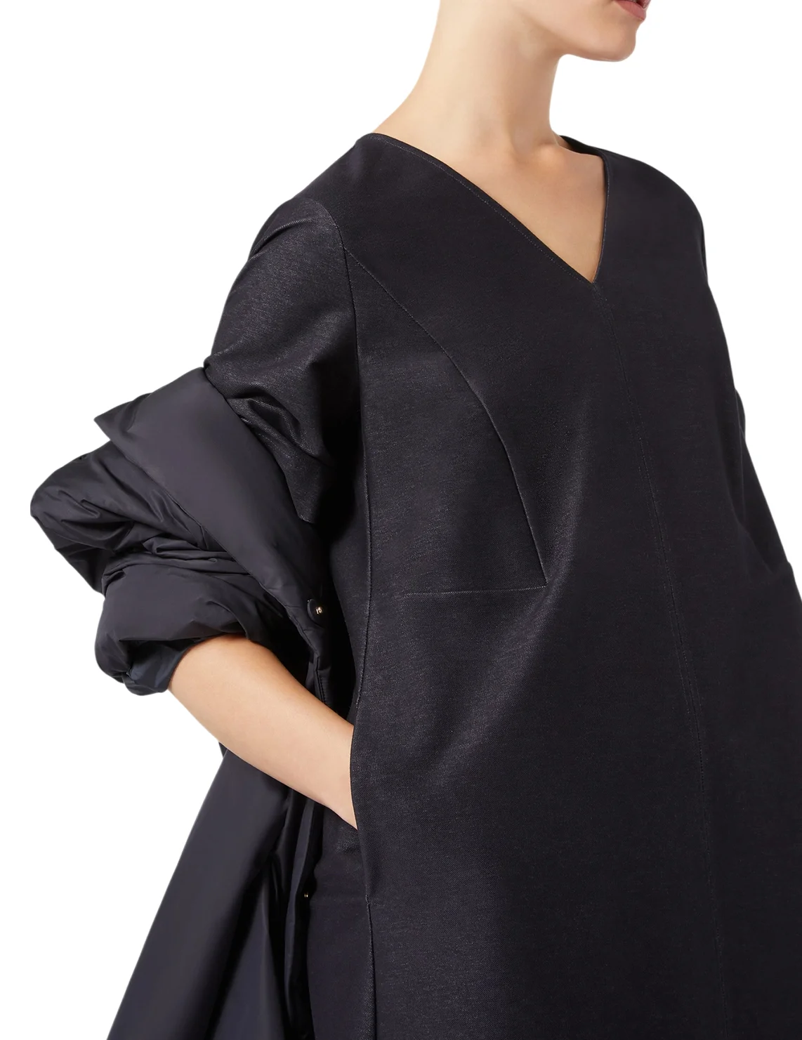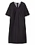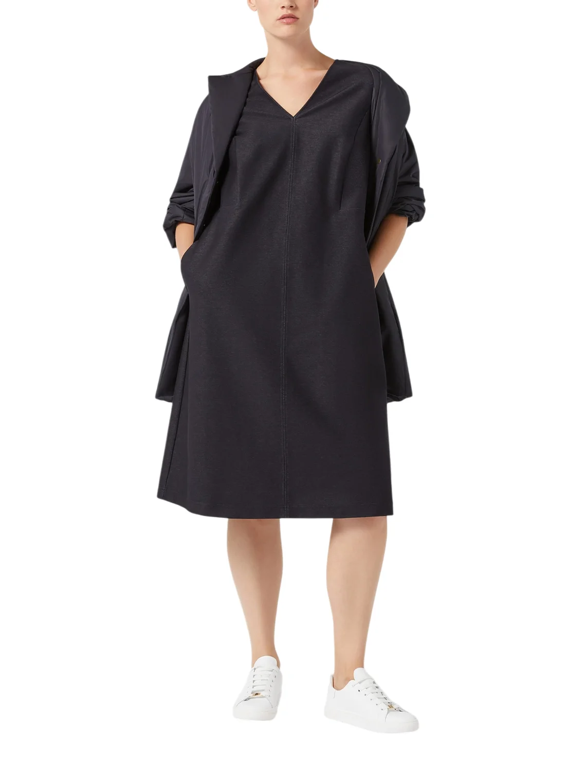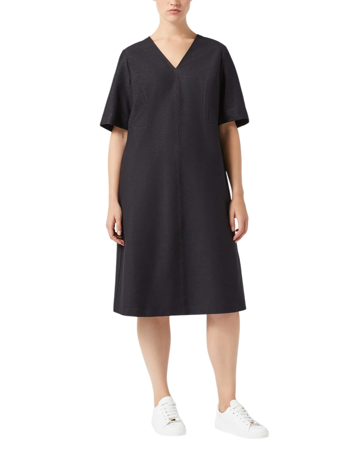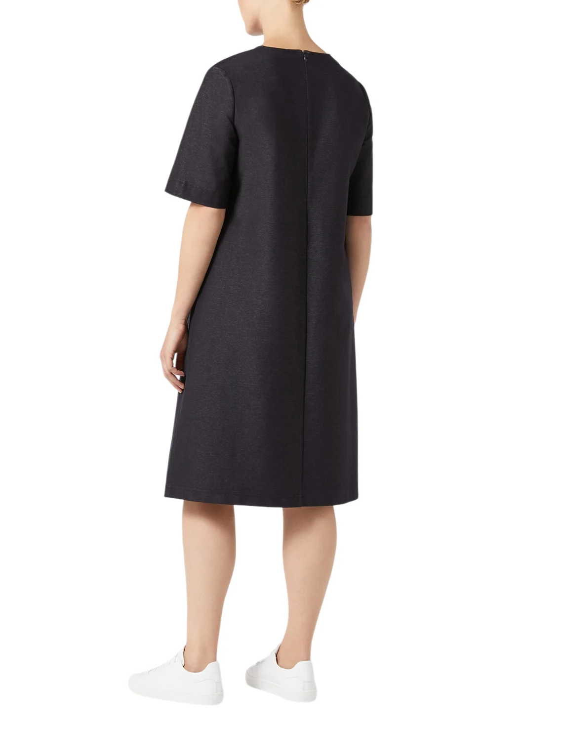Платье изготовлено из хлопка, полиэстера и эластана. Модель длины миди выполнена в прямом крое. Имеет V-образный вырез горловины, прорезные карманы, короткие рукава, застежку-молнию и крючок сзади.