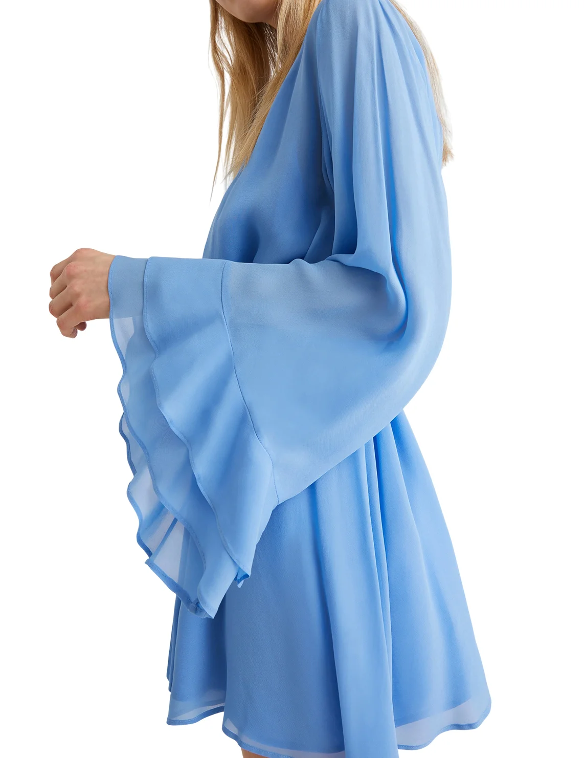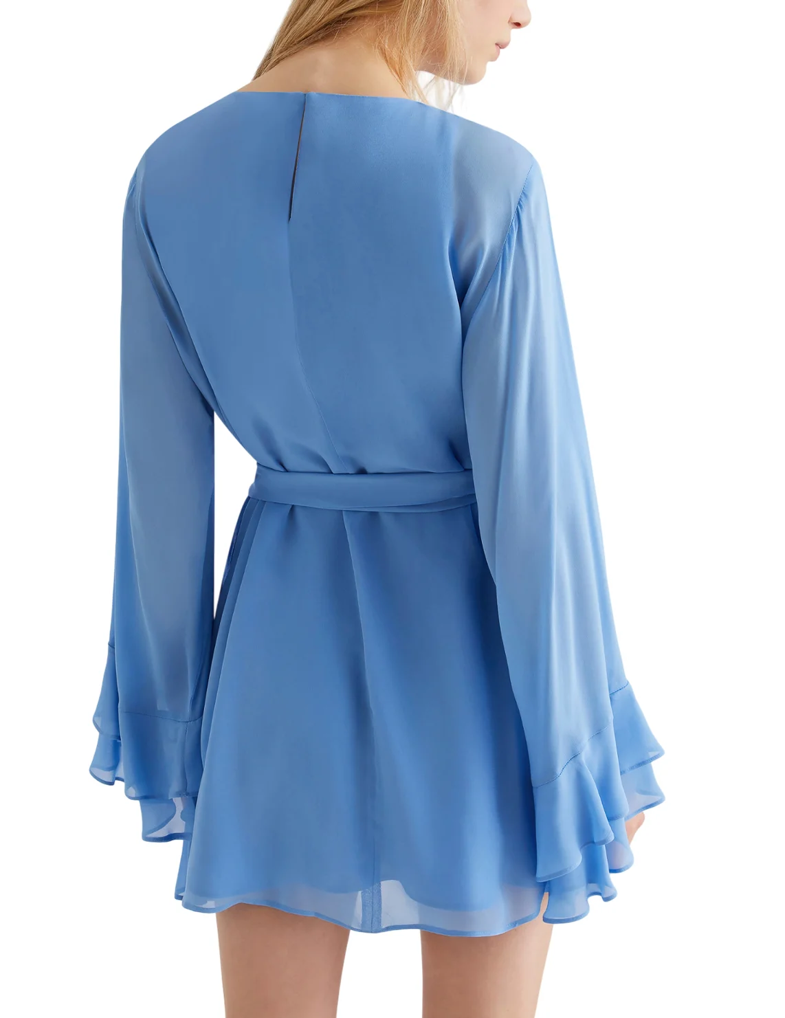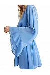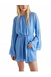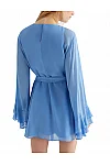 Платье изготовлено из 100% вискозы, подкладка из полиэстера. Модель длины мини выполнена в расклешенном крое. Имеет круглый вырез горловины, пояс в тон, застежку на пуговицу сзади и длинные рукава. Декорировано оборками.