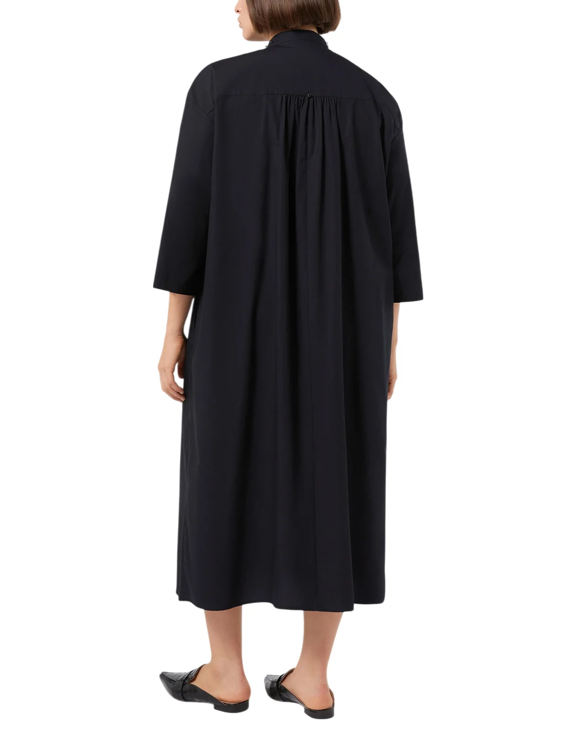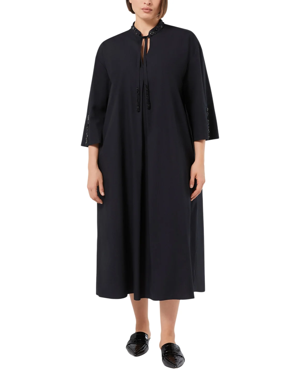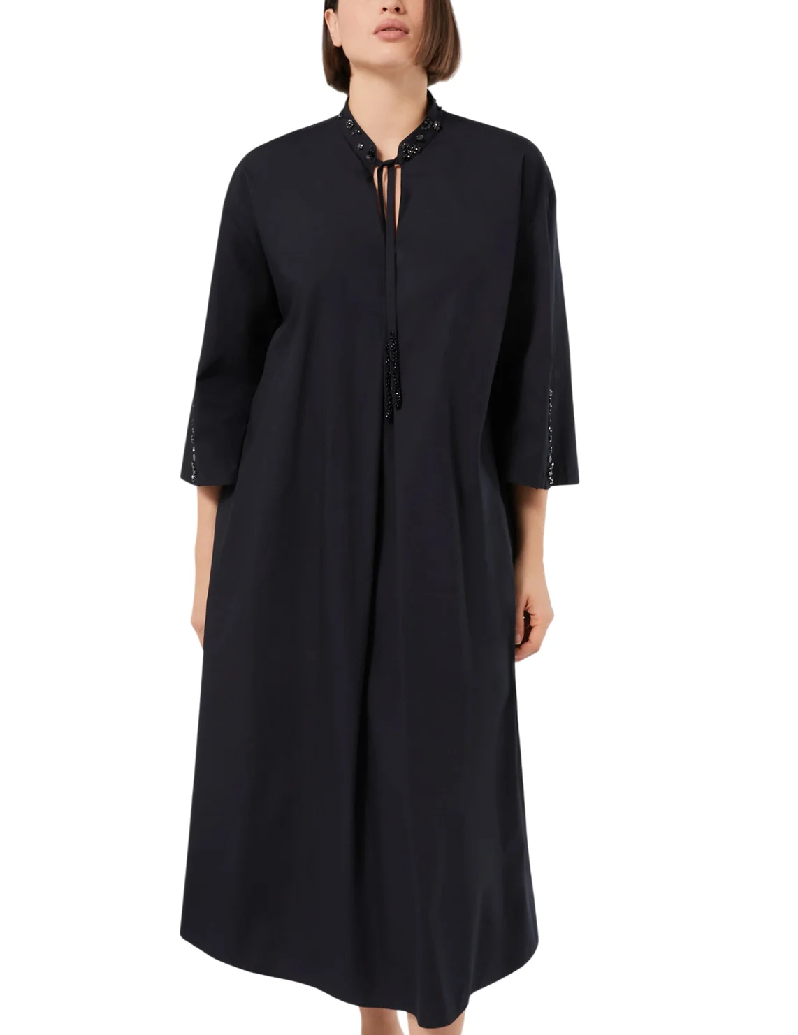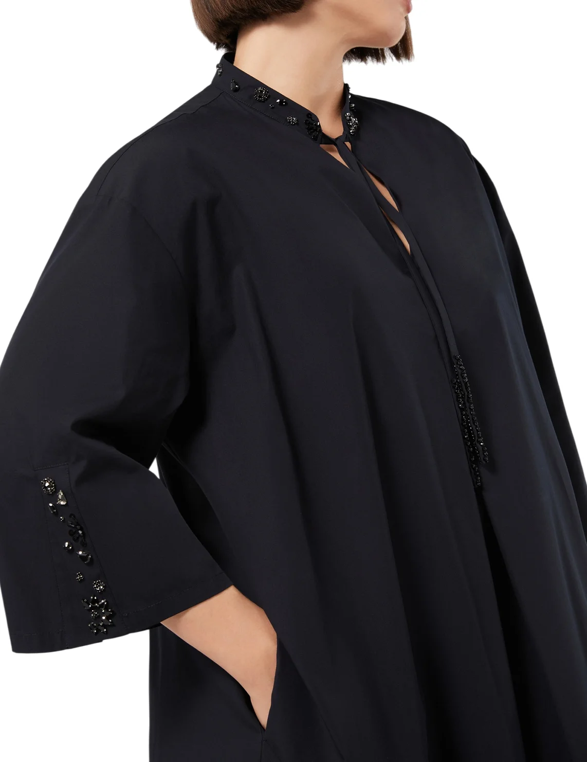 Платье изготовлено из 100% хлопка высокого качества. Модель длины миди выполнена в расклешенном крое. Имеет воротник-стойку с V-образным вырезом и завязками, широкие рукава длиной 3/4 и прорезные карманы. Декорировано стразами.