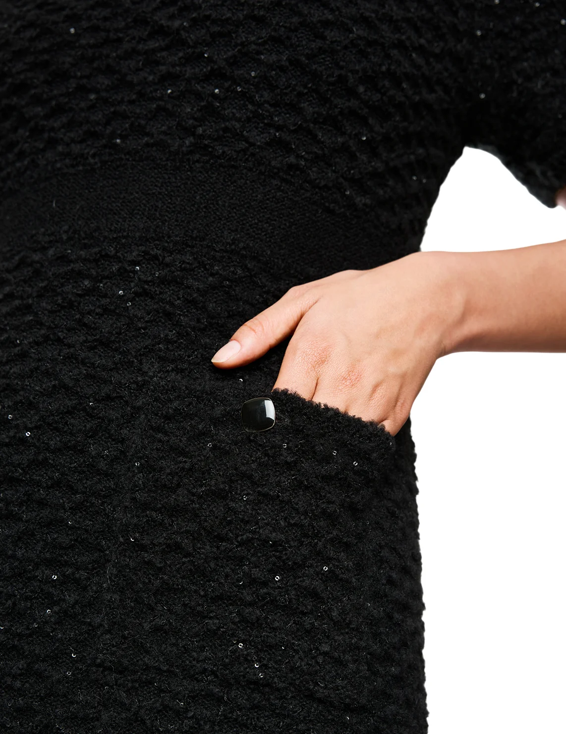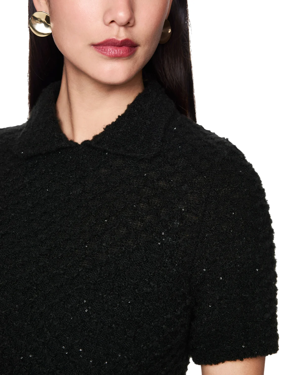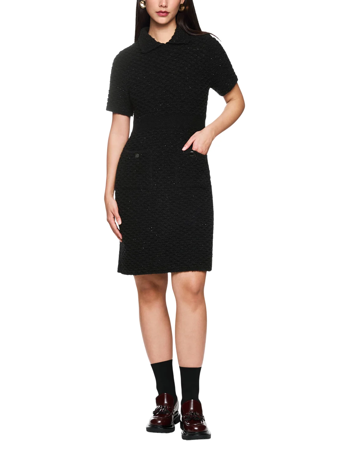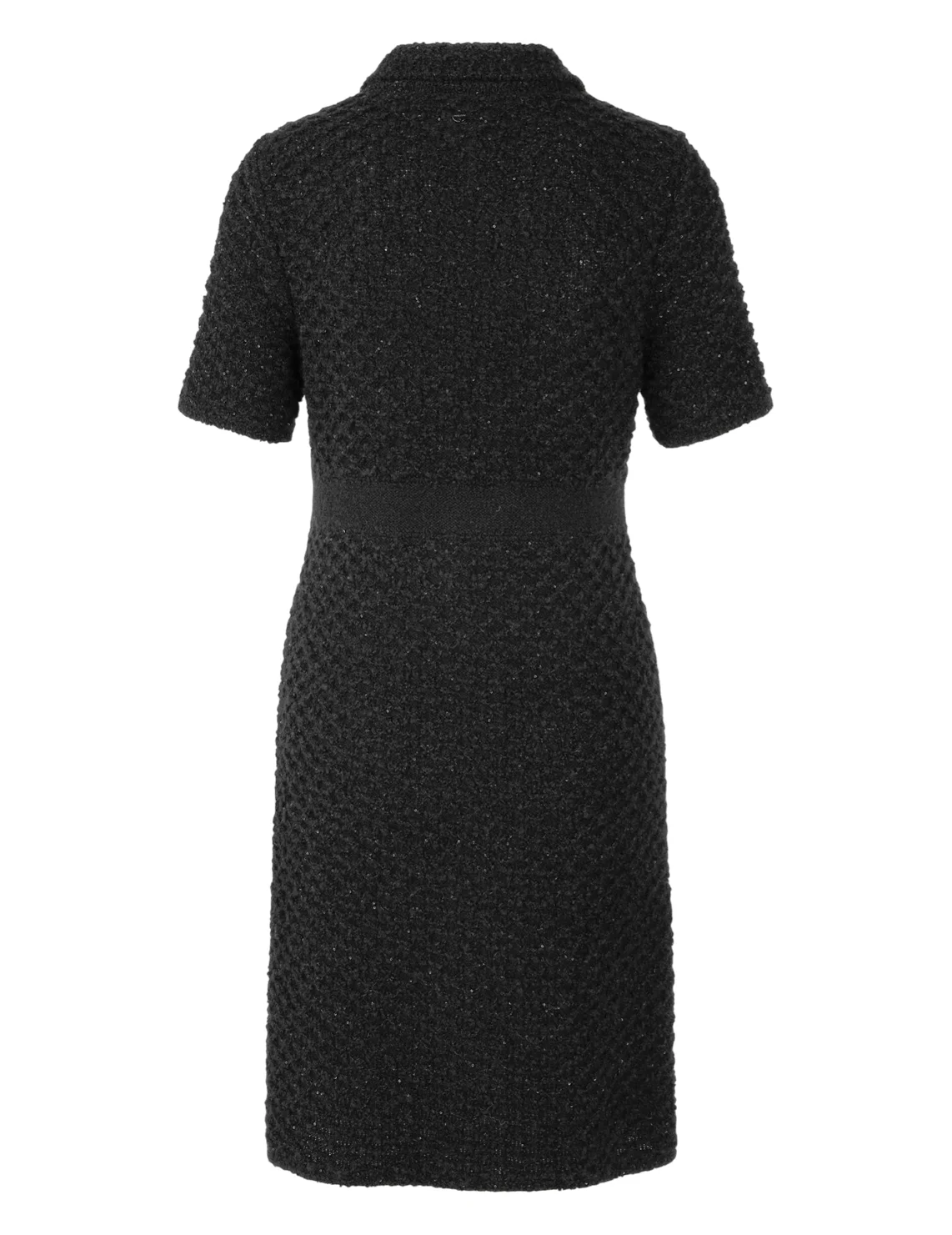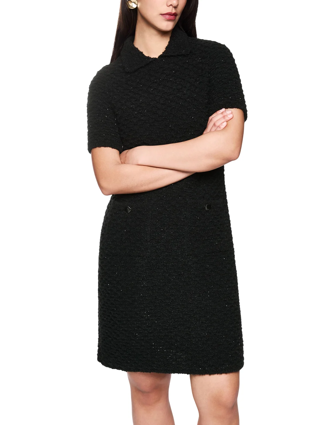 Платье изготовлено из полиамида, акрила, альпаки и шерсти. Модель длины мини выполнена в приталенном крое. Имеет отложной воротник, короткие рукава и накладные карманы. Декорировано пайетками.