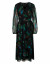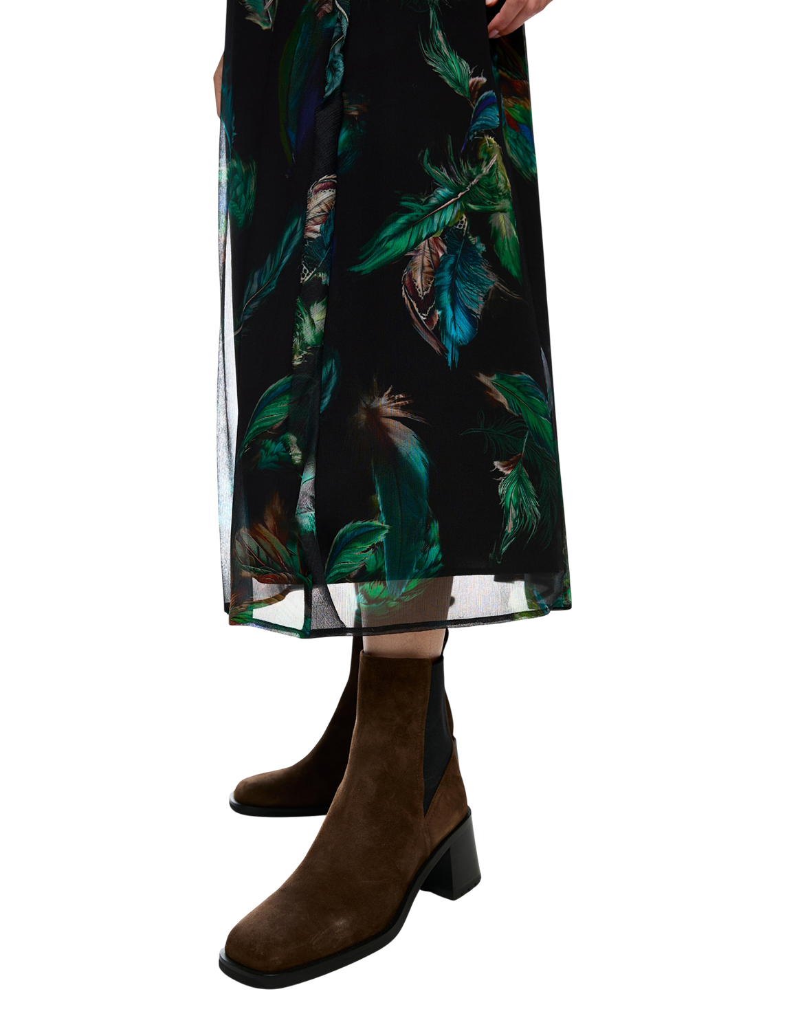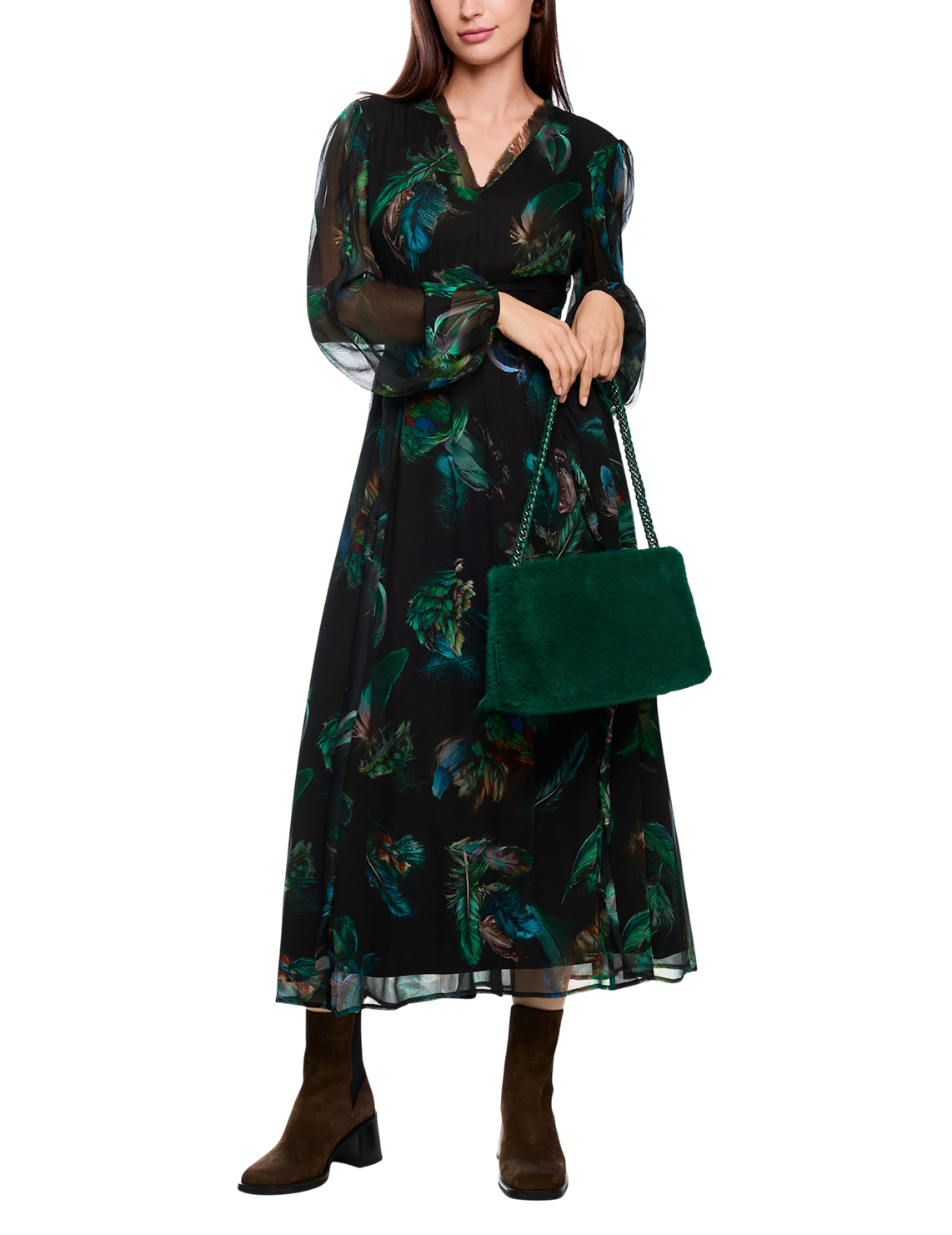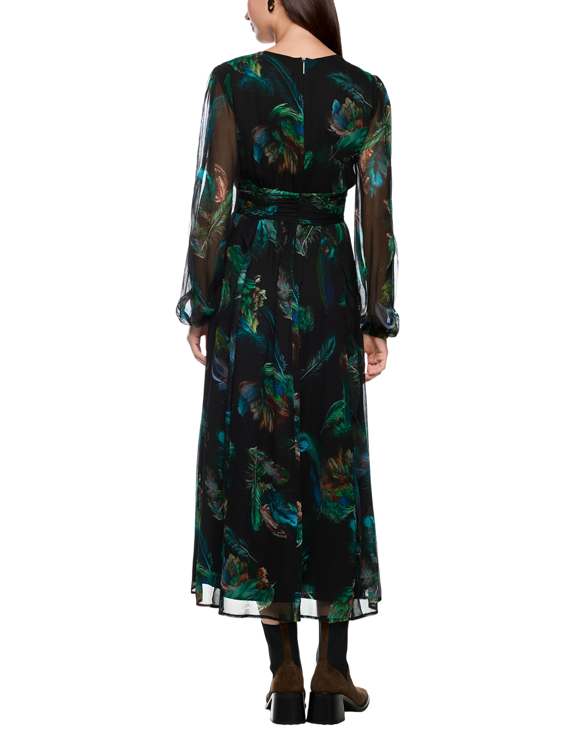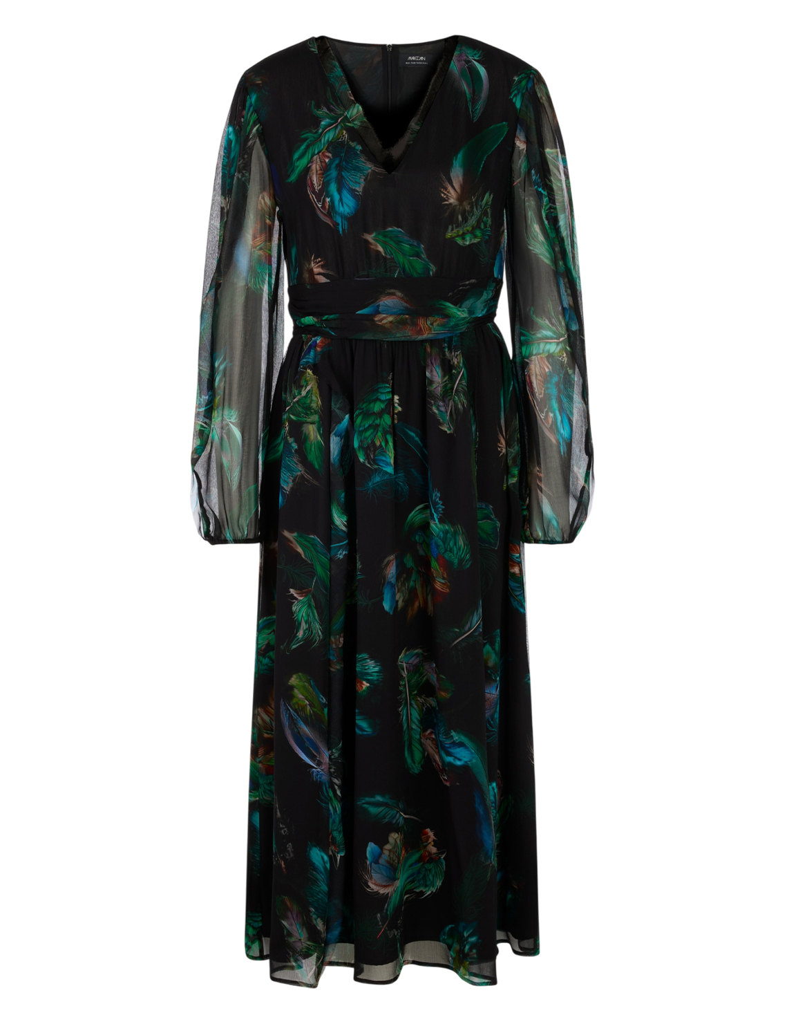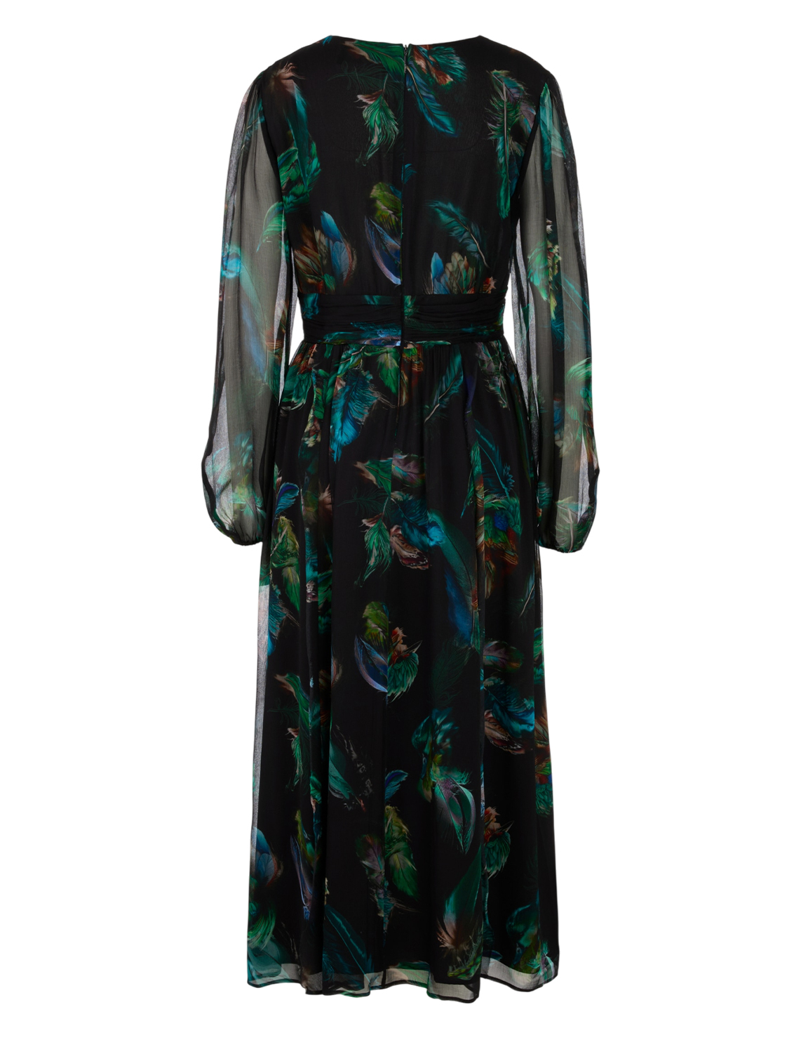 Платье изготовлено из 100% вискозы высокого качества, подкладка из полиэстера. Модель длины миди выполнена в расклешенном крое. Имеет V-образный вырез горловины, застежку на молнии сзади и полупрозрачные длинные рукава с манжетами. Декорировано оригинальным принтом.