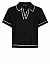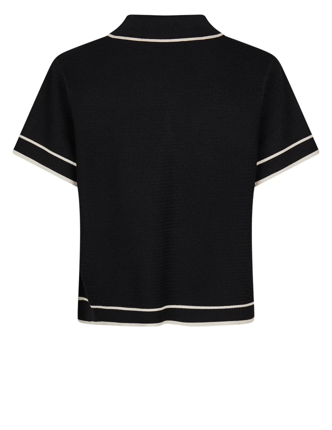 Поло изготовлено из вискозы и полиамида. Модель выполнена в прямом крое. Имеет V-образный вырез горловины, отложной воротник и короткие рукава. Декорировано контрастными полосами.