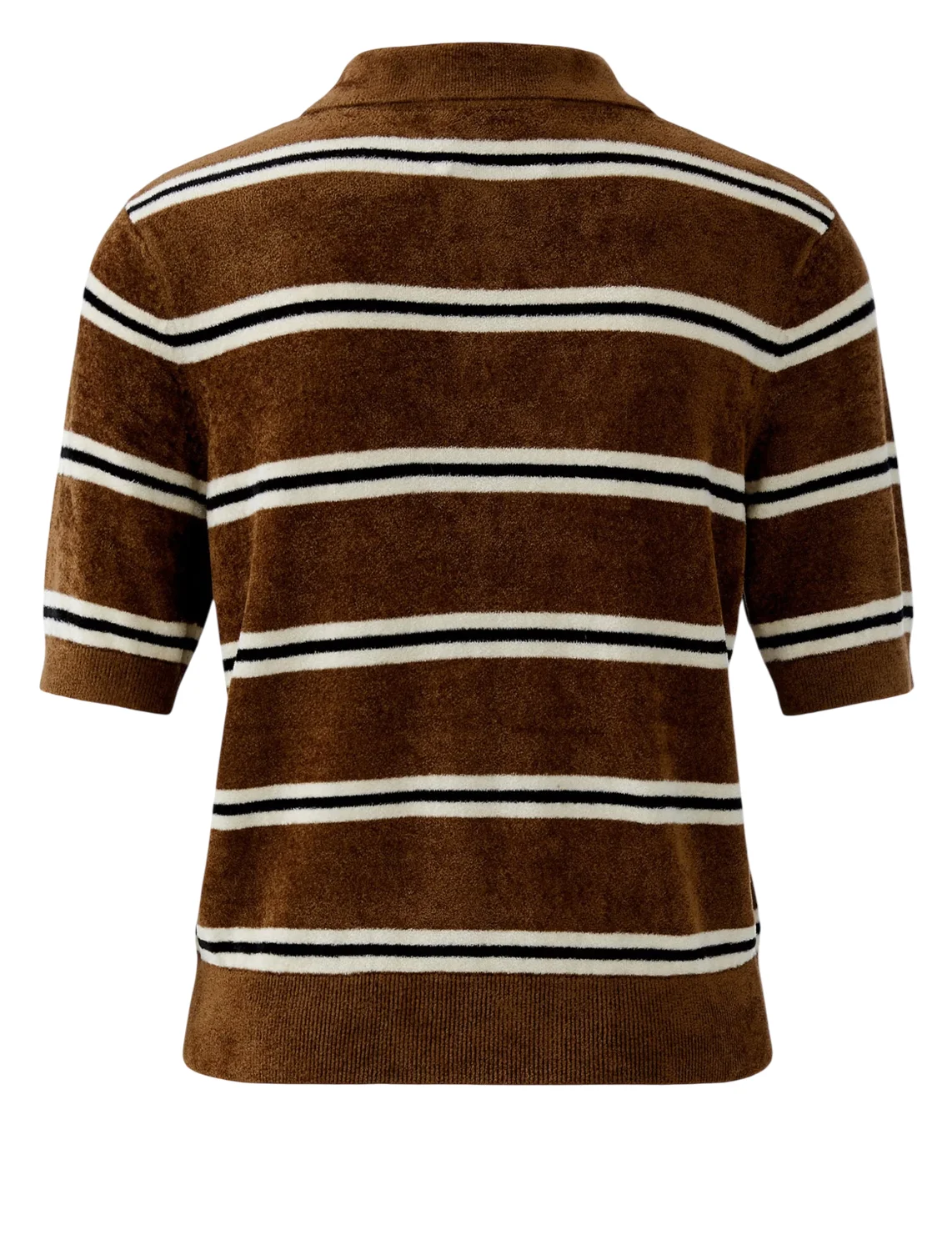 Поло изготовлено из полиамида и вискозы. Модель выполнена в прямом крое. Имеет отложной воротник с застежкой на пуговицах и короткие рукава с манжетами. Декорировано принтом в полоску и вышивкой с логотипом бренда.