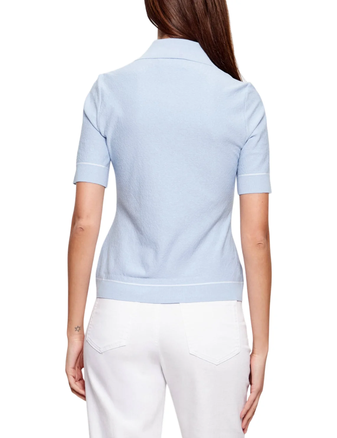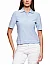 Поло изготовлено из вискозы и полиэстера. Модель выполнена в прямом, слегка приталенном крое. Имеет V-образный вырез горловины, отложной воротник с планкой на пуговицы и короткие рукава с манжетами. Декорирован контрастными полосами и оригинальной текстурой.
