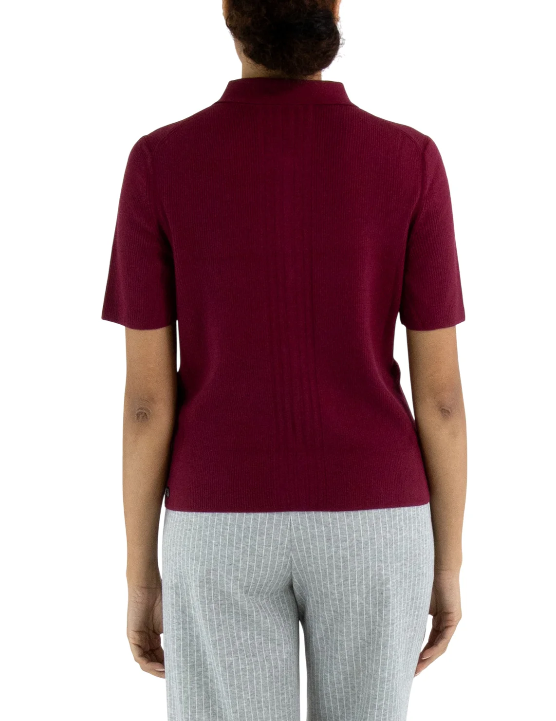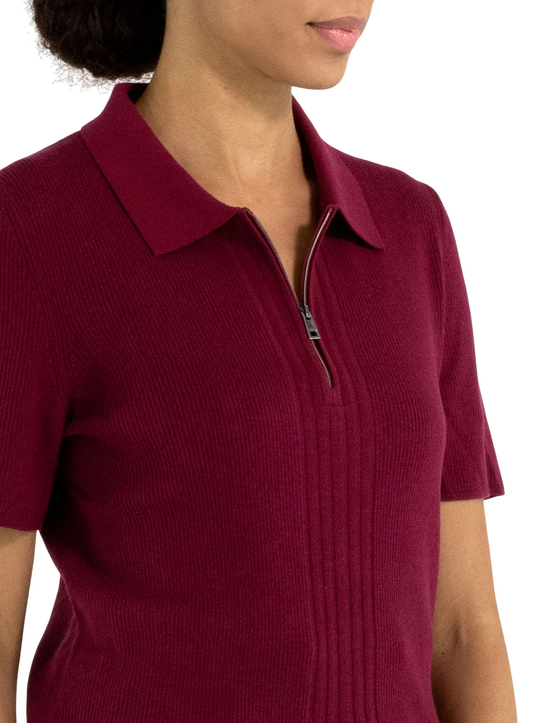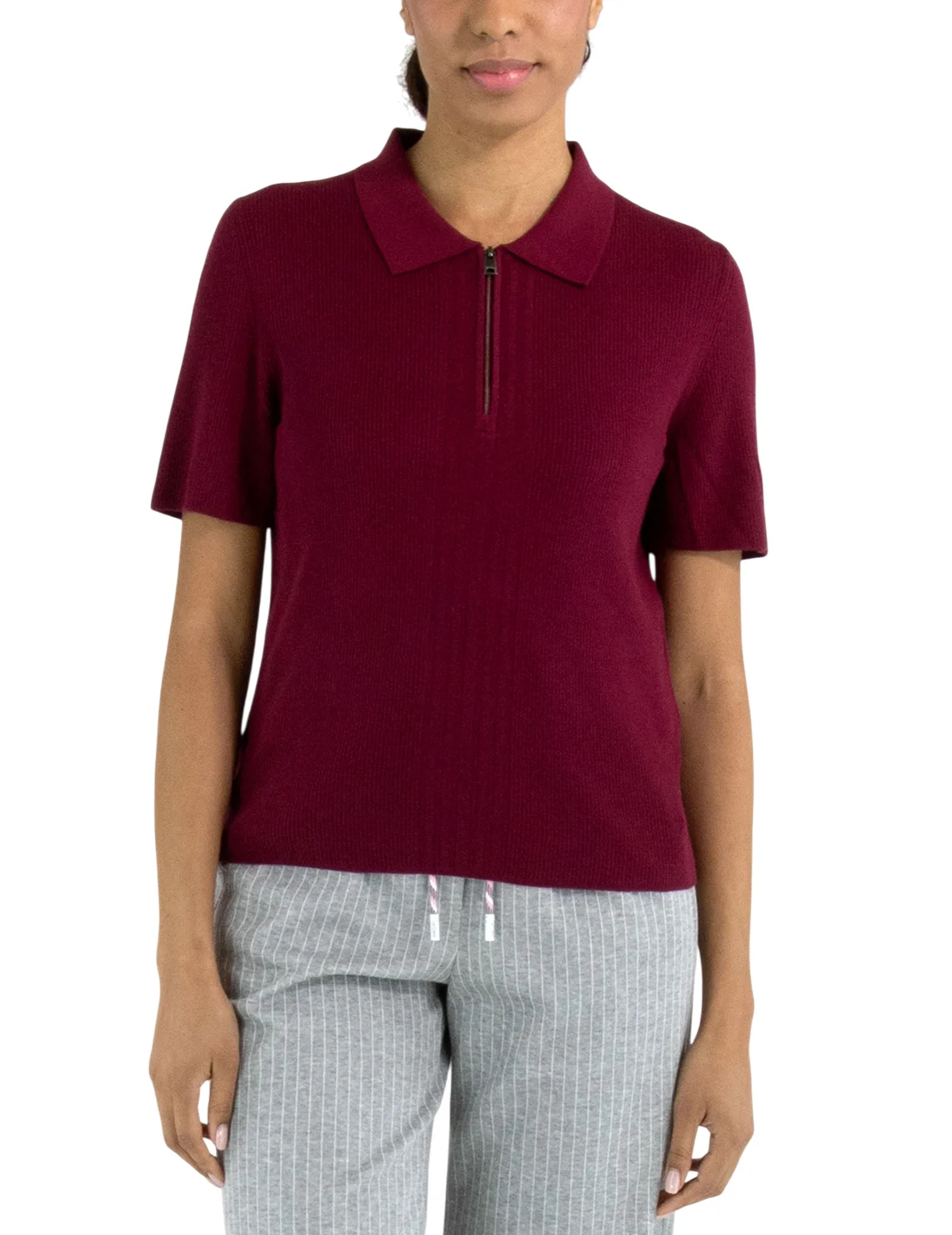Поло изготовлено из шерсти, вискозы, полиамида и кашемира. Модель выполнена в прямом крое. Имеет отложной воротник с застежкой на молнии и короткие рукава.