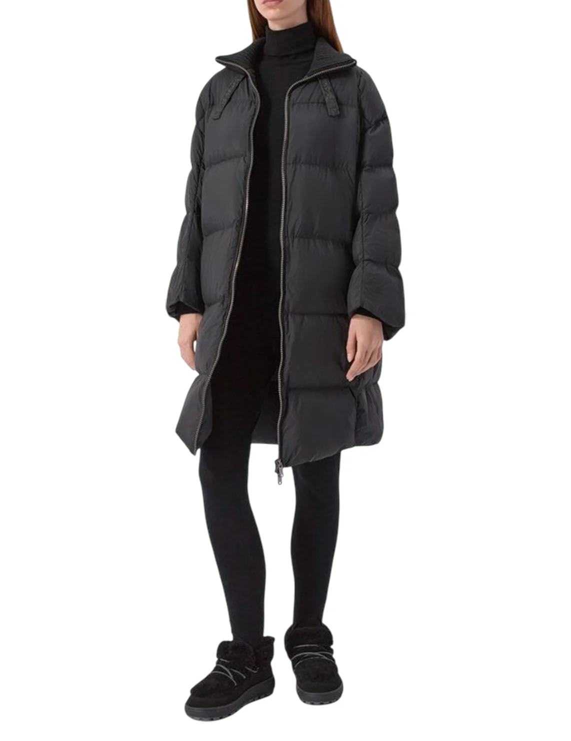 Пуховик изготовлен из 100% полиамида, наполнитель - 90% пух, 10% перо. Модель выполнена в свободном крое. Имеет отложной воротник с кулиской, прорезные карманы, двустороннюю застежку-молнию и длинные рукава.