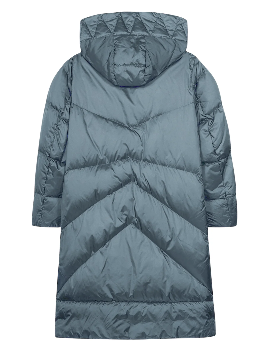 Пуховик изготовлен из 100% полиамида, наполнитель - 90% пух и 10% перо. Модель выполнена в свободном крое. Имеет капюшон с кулиской, длинные рукава, боковые разрезы на кнопках, прорезные карманы на молниях, застежку-молнию и кнопки.