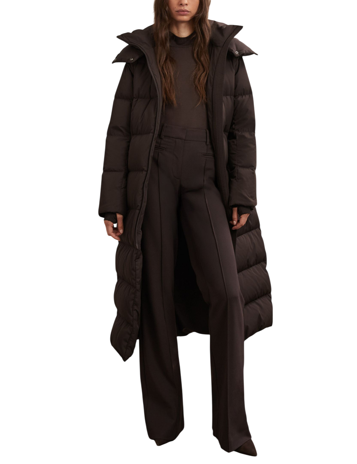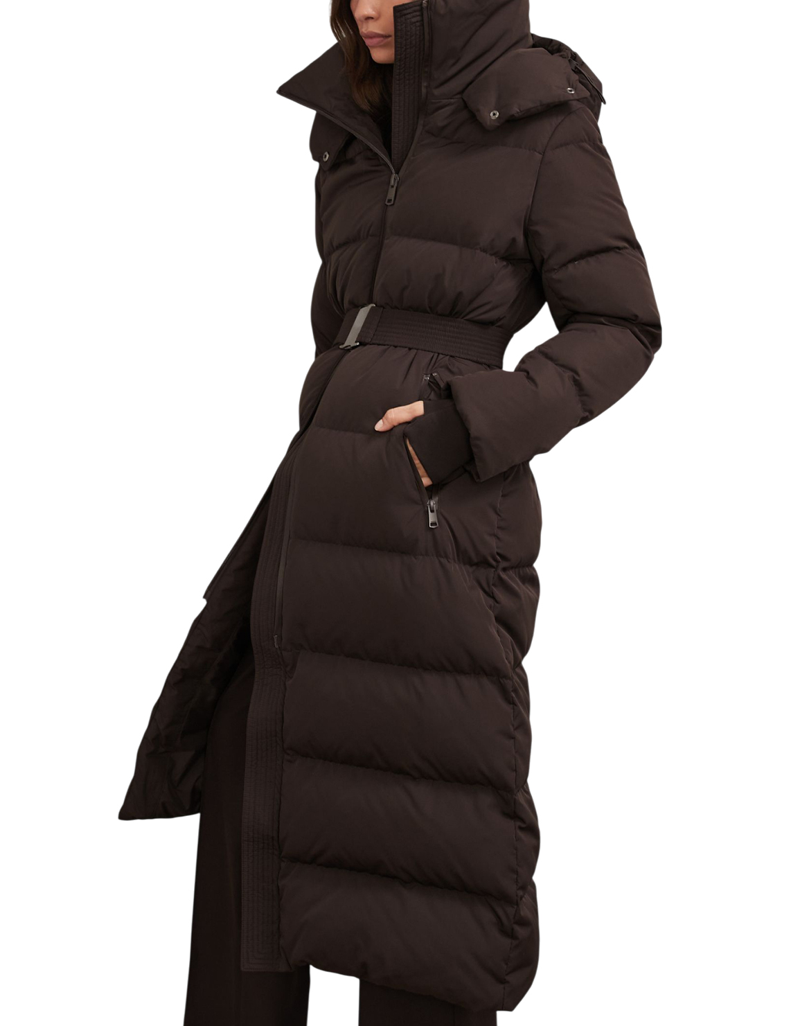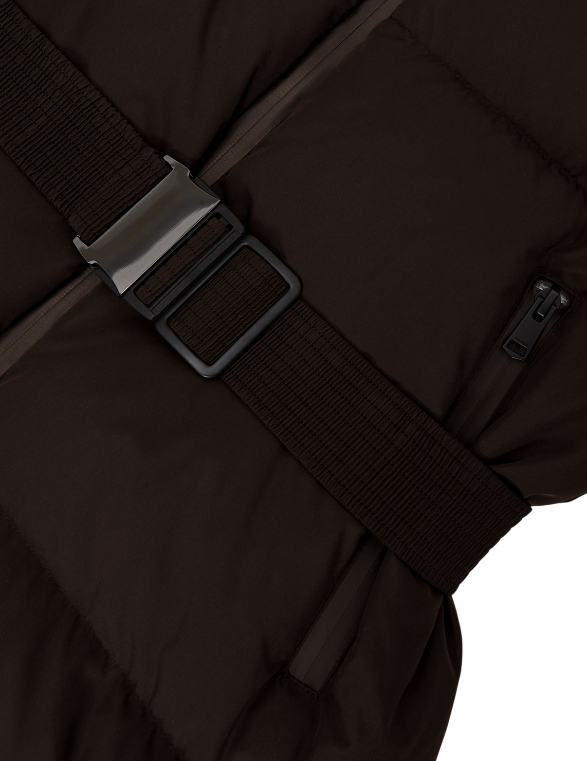 Пуховик изготовлен из 100% полиэстера, наполнитель - 100% полиэстер. Модель выполнена в свободном крое. Имеет съемный капюшон с кулиской на кнопках, прорезные карманы на молниях, застежку-молнию, пояс в тон с пряжкой, длинные рукава и манжеты с отверстиями для больших пальцев.