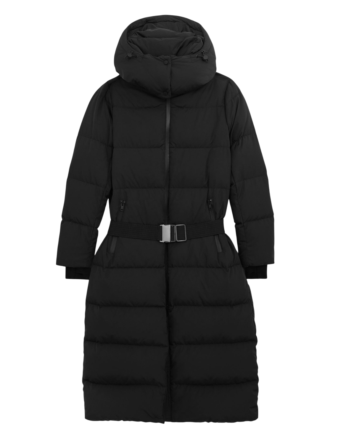 Пуховик изготовлен из 100% полиэстера, наполнитель - 100% полиэстер. Модель выполнена в свободном крое. Имеет съемный капюшон с кулиской на кнопках, прорезные карманы на молниях, застежку-молнию, пояс в тон с пряжкой, длинные рукава и манжеты с отверстиями для больших пальцев.
