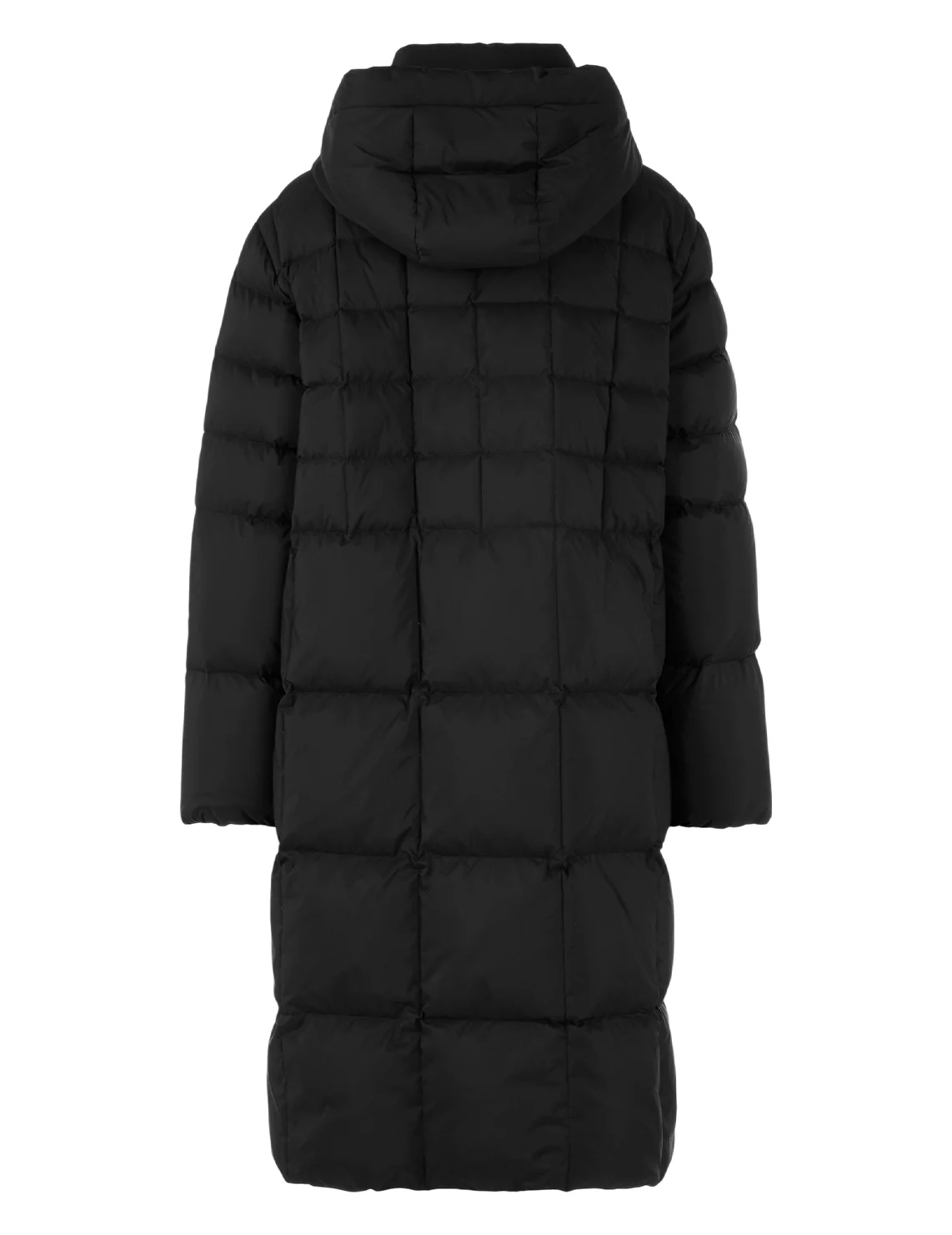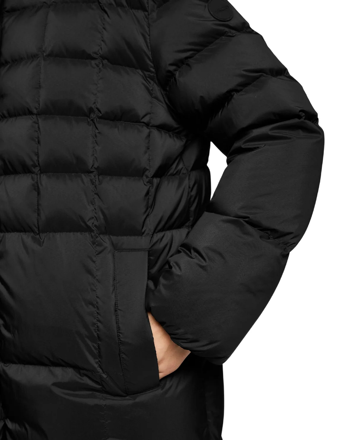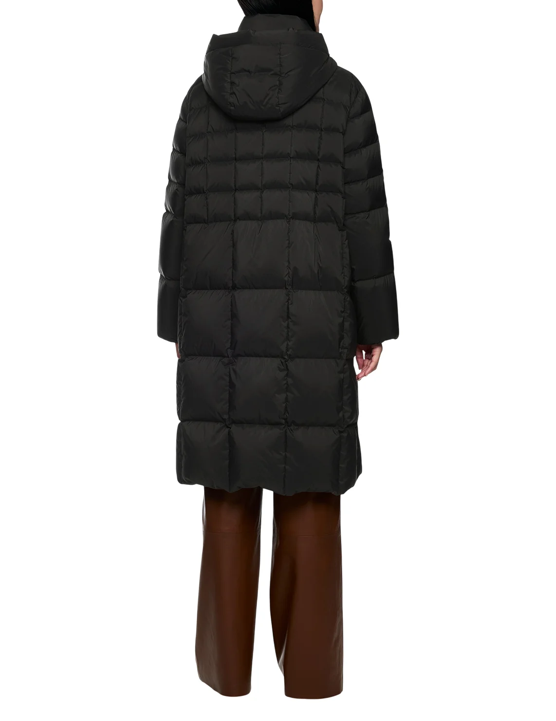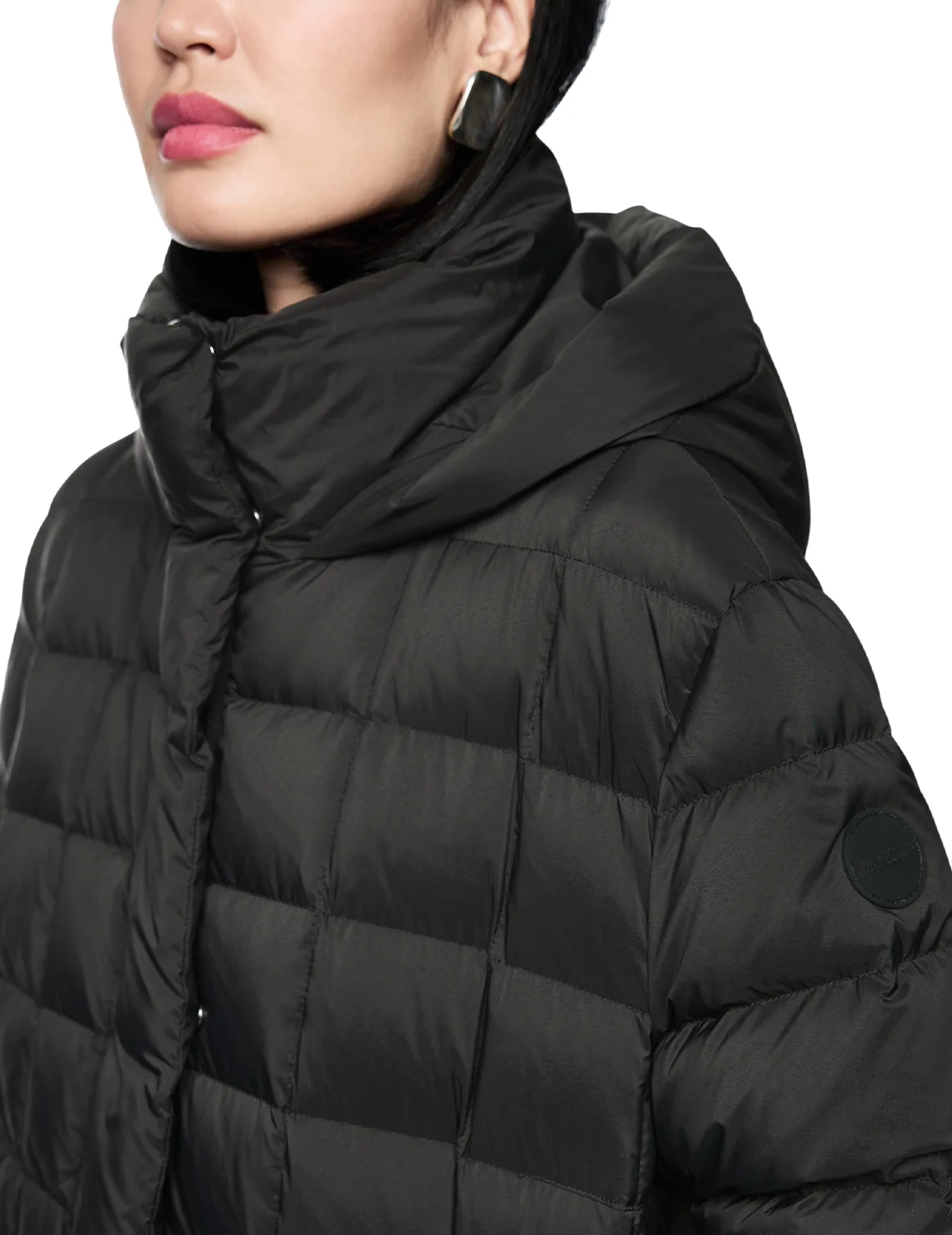 Пуховик изготовлен из 100% полиамида, наполнитель - 90% пух, 10% перо. Модель выполнена в свободном крое. Имеет воротник-стойку, капюшон, длинные рукава, прорезные карманы, двустороннюю застежку на молнии и кнопках.