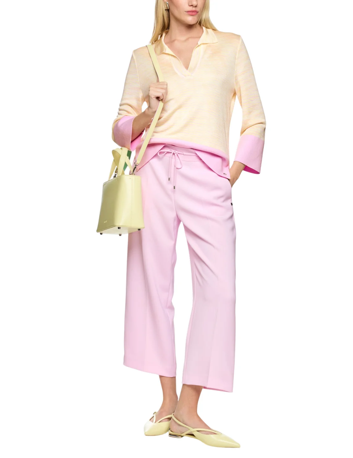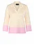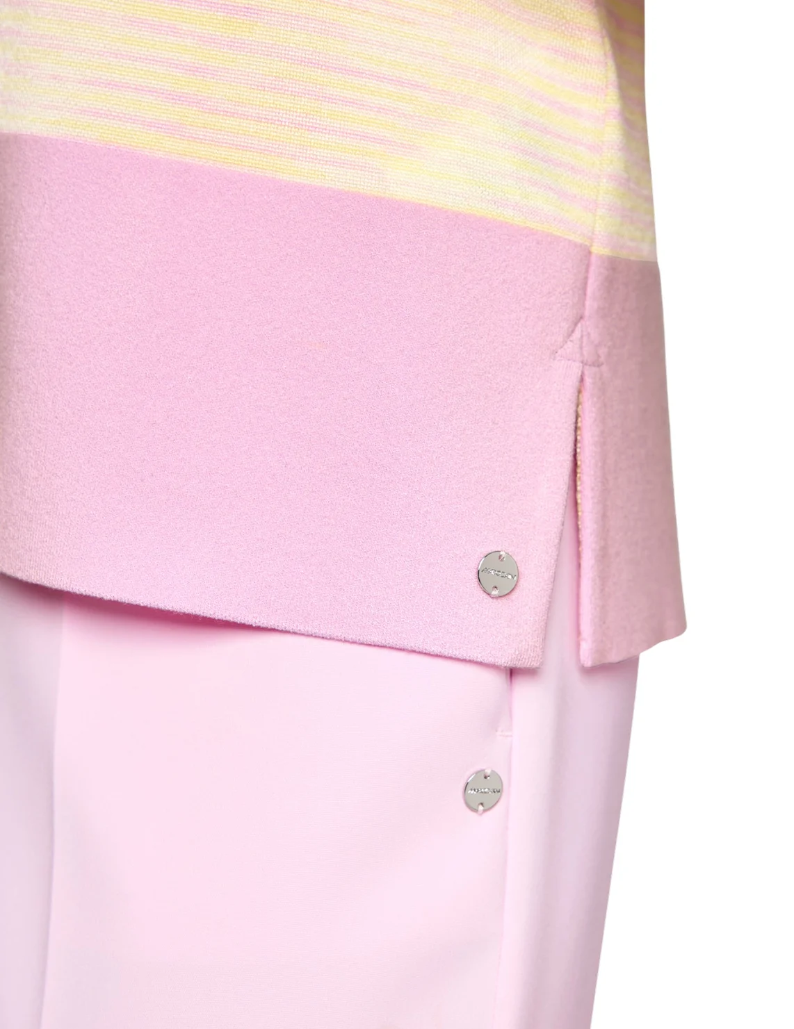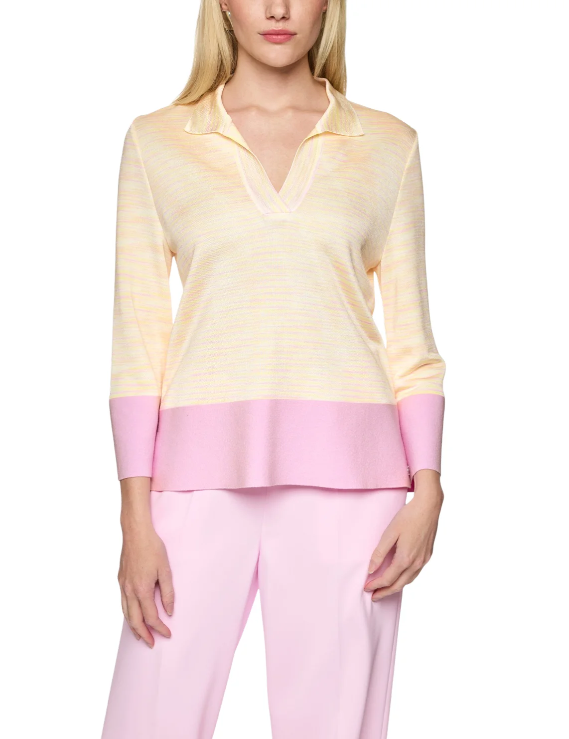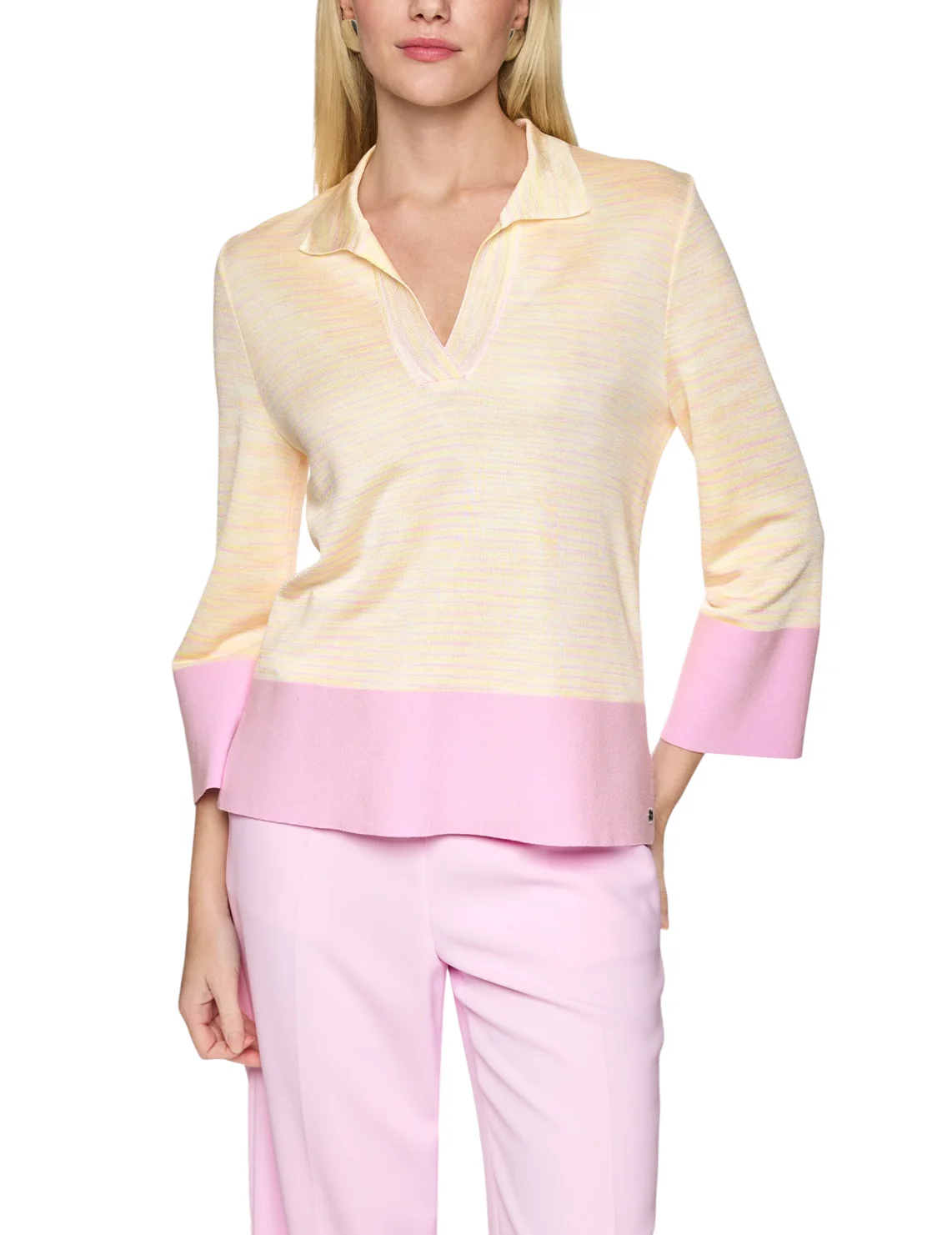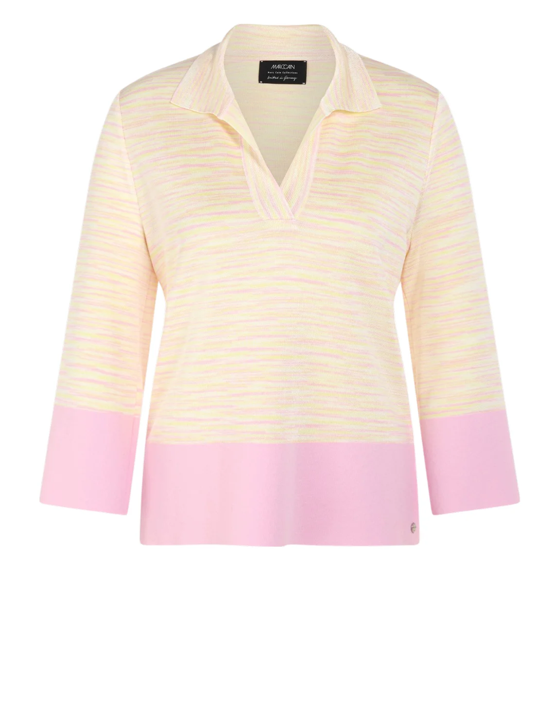 Пуловер изготовлен из вискозы, хлопка и полиэстера. Модель выполнена в прямом крое. Имеет V-образный вырез горловины, боковые разрезы, отложной воротник и рукава длиной 3/4. Декорирован принтом в полоску.