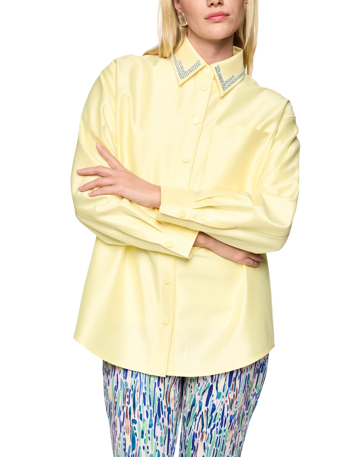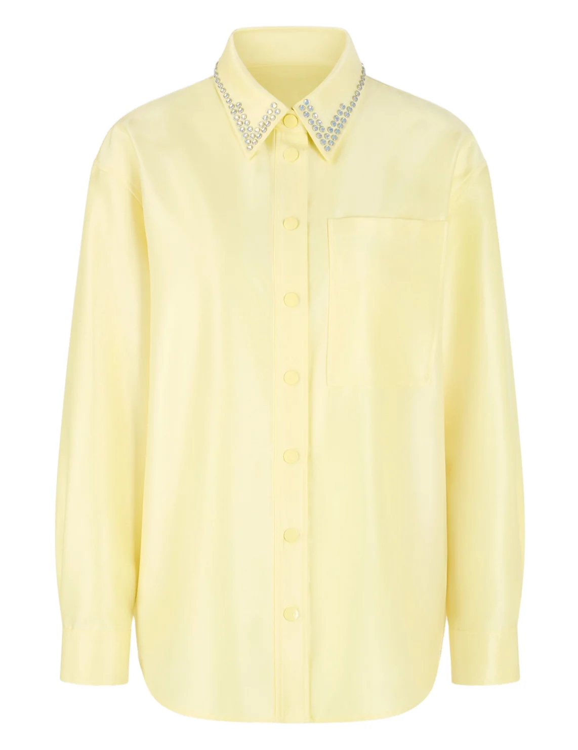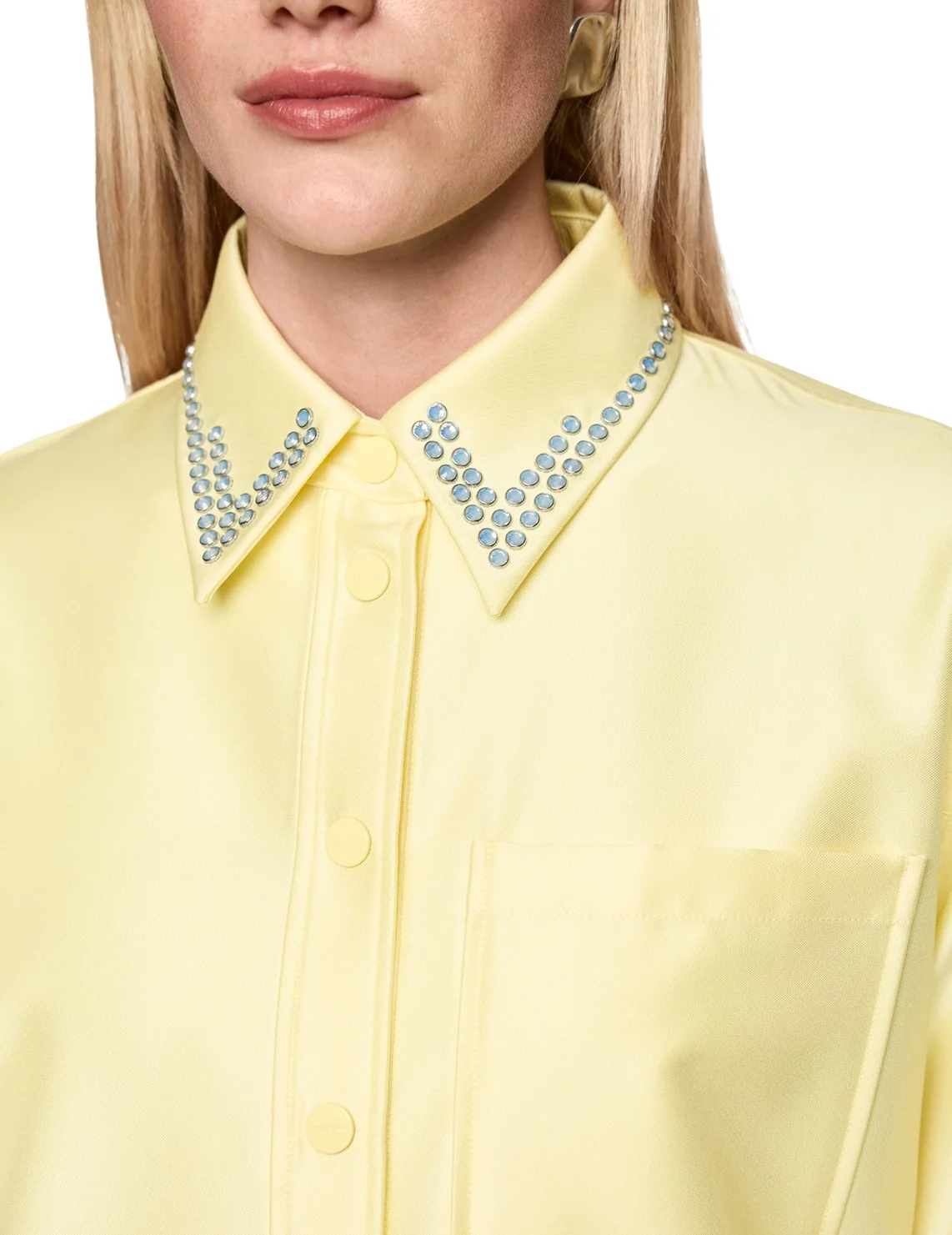 Рубашка изготовлена из полиэстера и вискозы. Модель выполнена в свободном крое. Имеет отложной воротник со стразами, планку на кнопках, нагрудный карман и длинные рукава с манжетами.