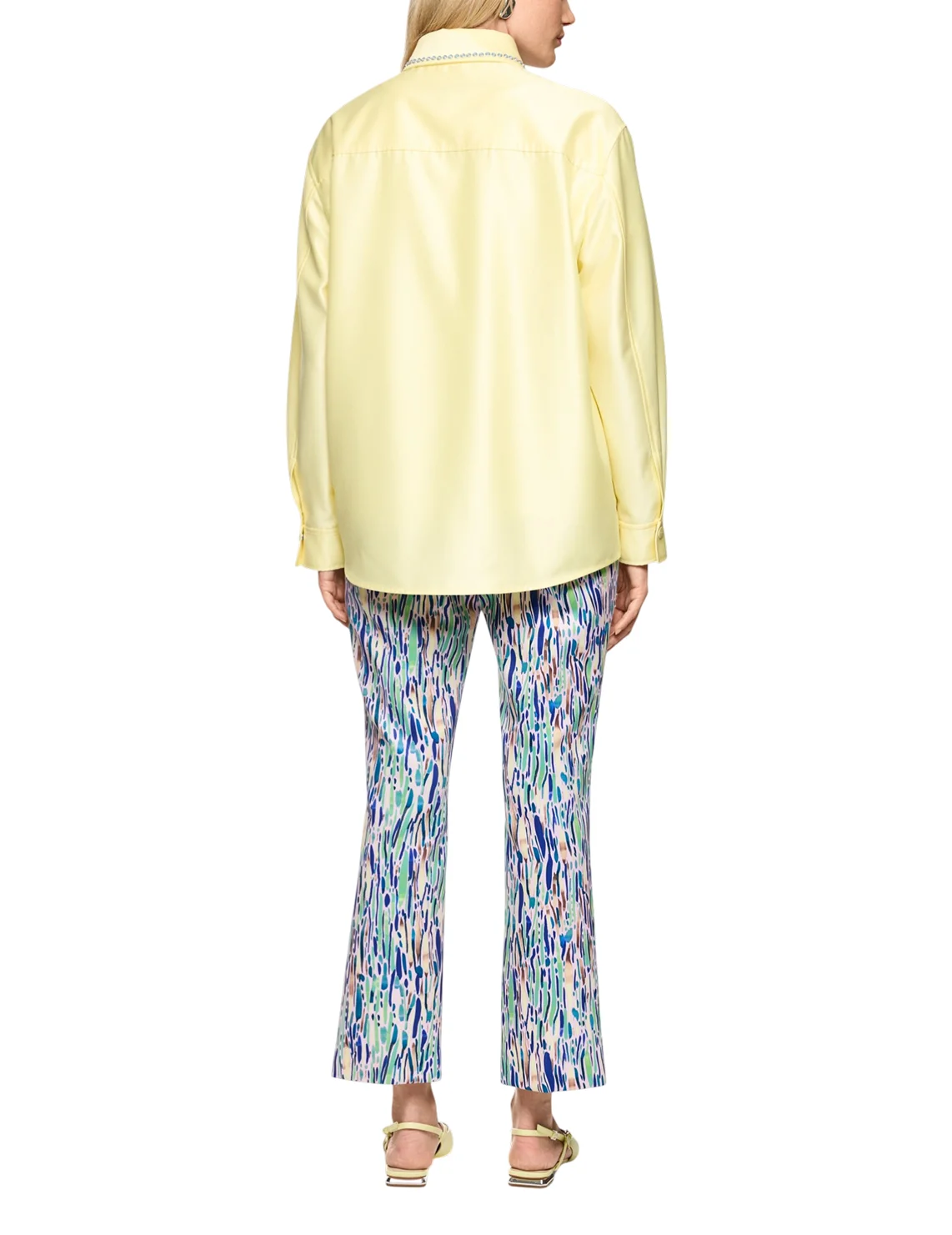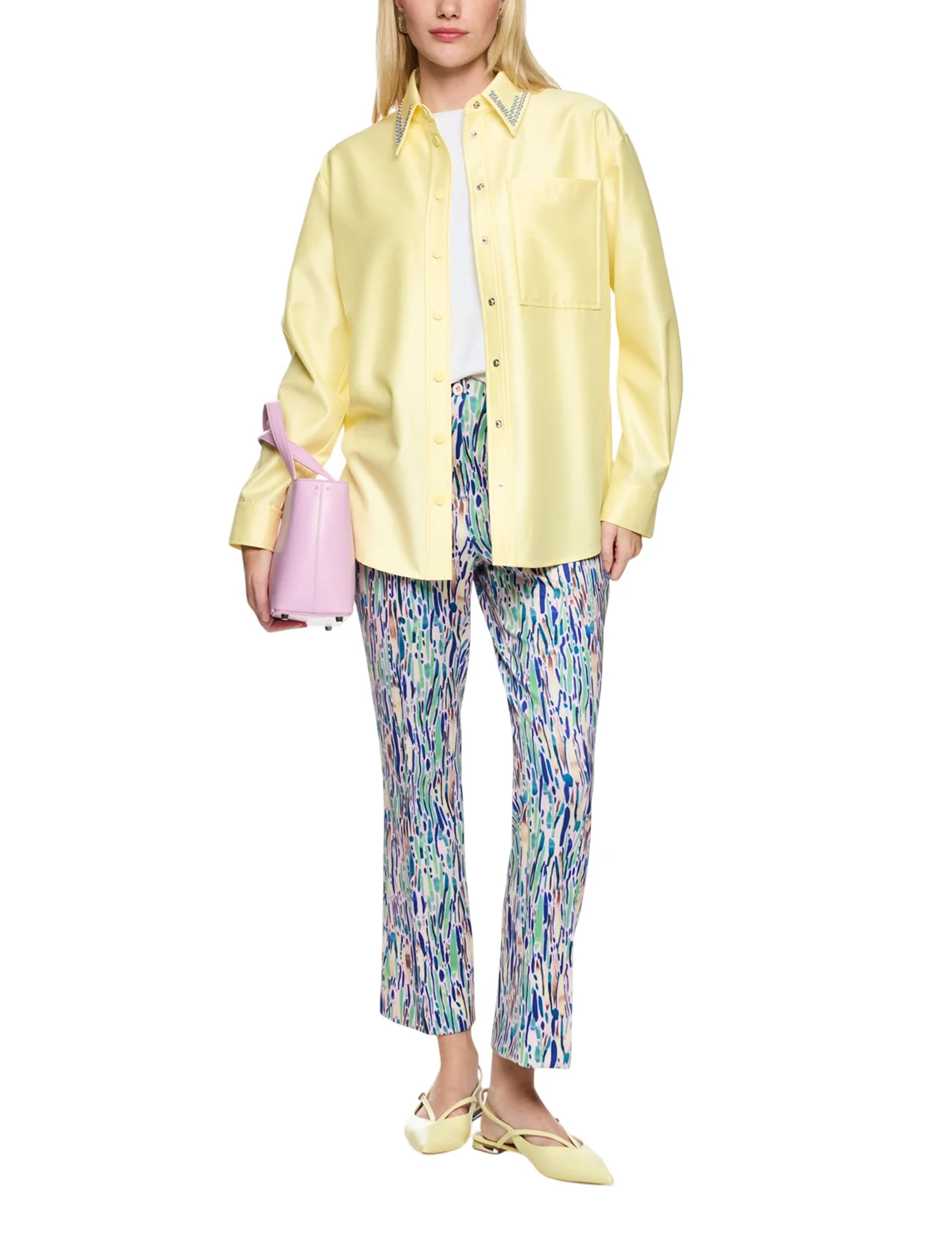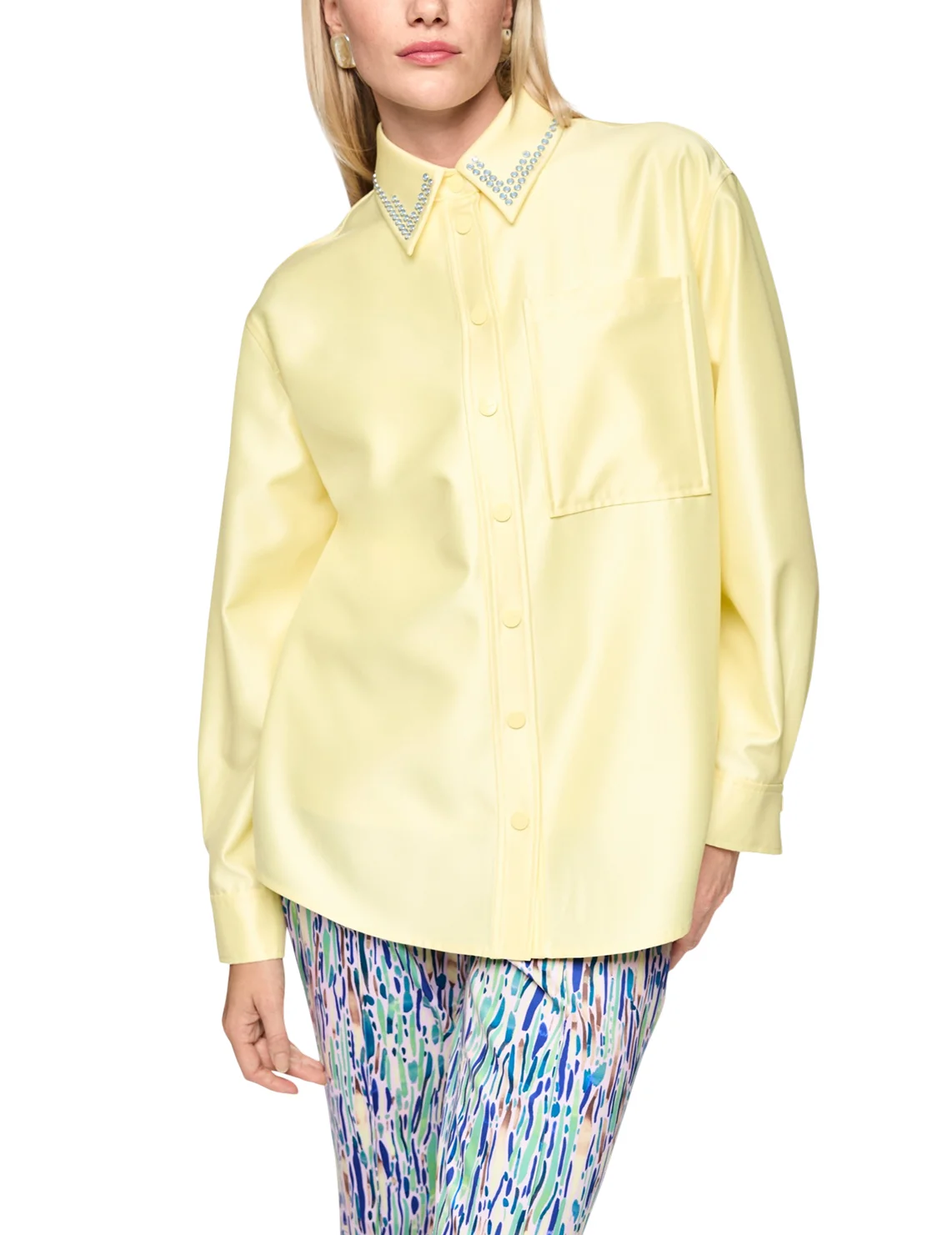 Рубашка изготовлена из полиэстера и вискозы. Модель выполнена в свободном крое. Имеет отложной воротник со стразами, планку на кнопках, нагрудный карман и длинные рукава с манжетами.