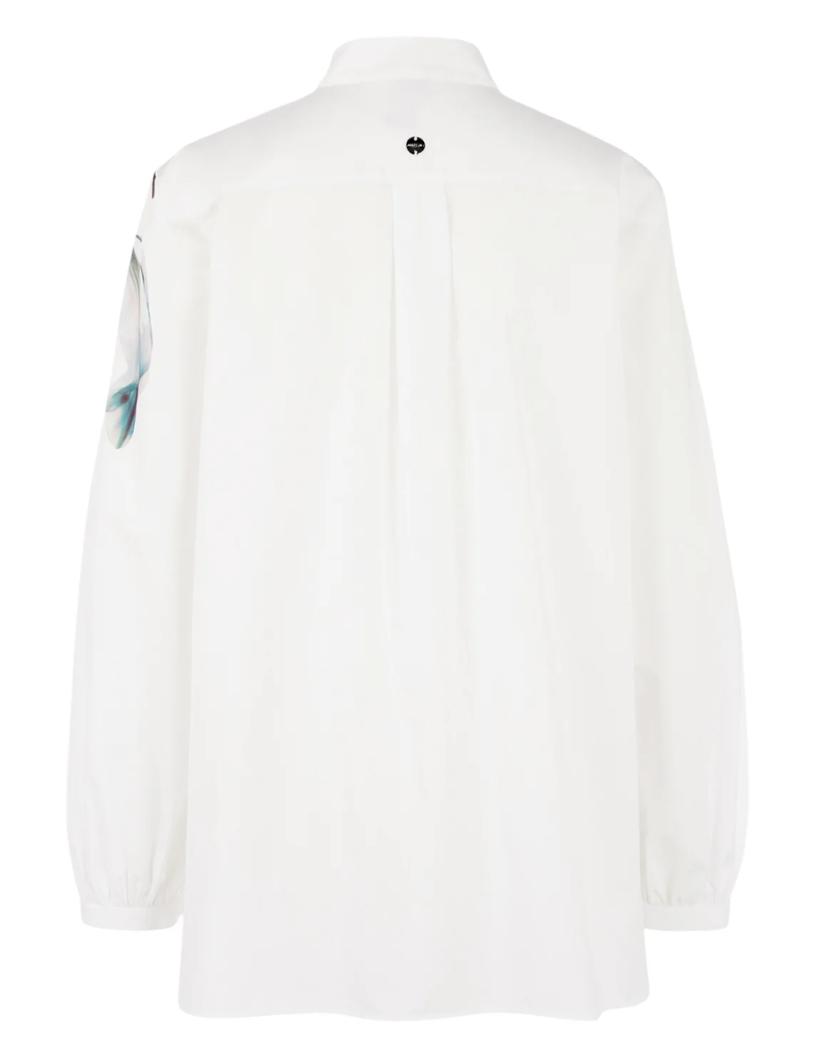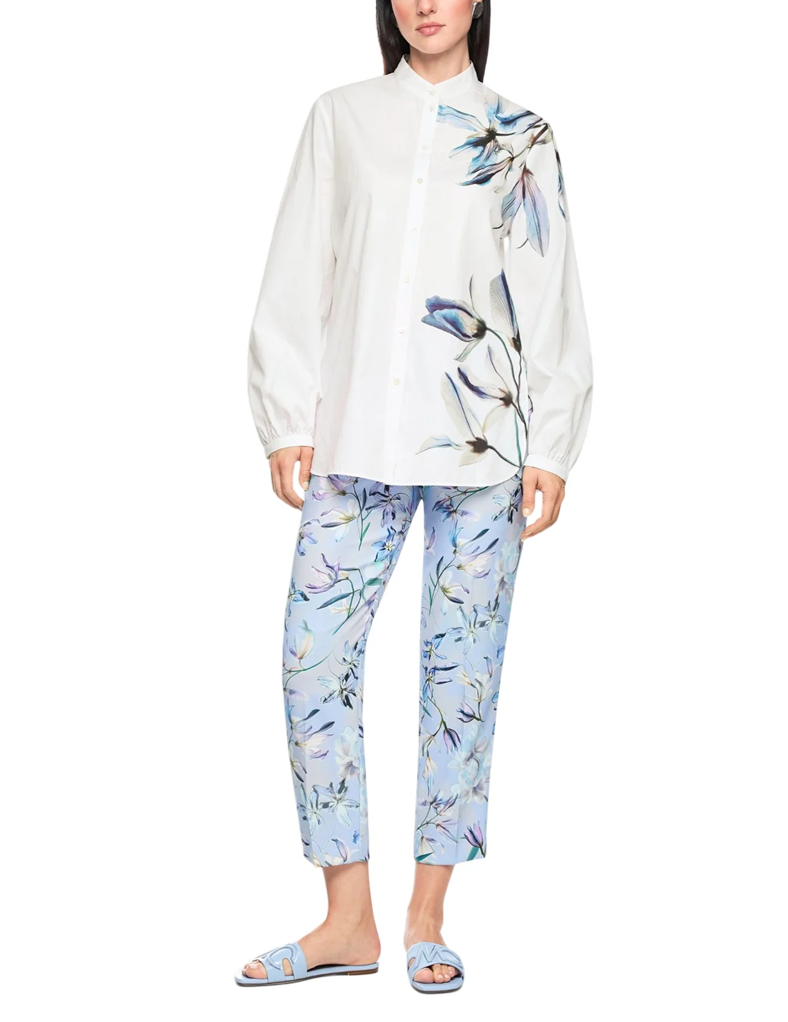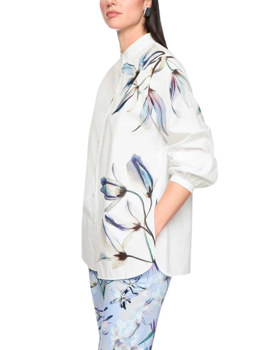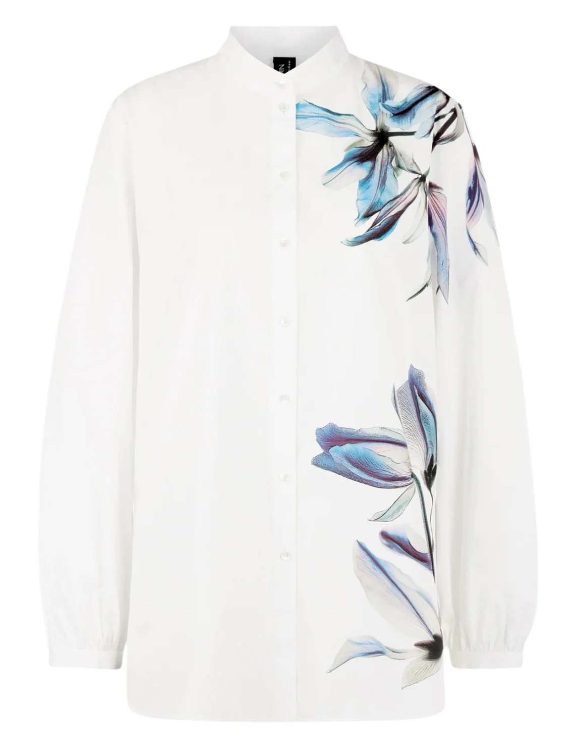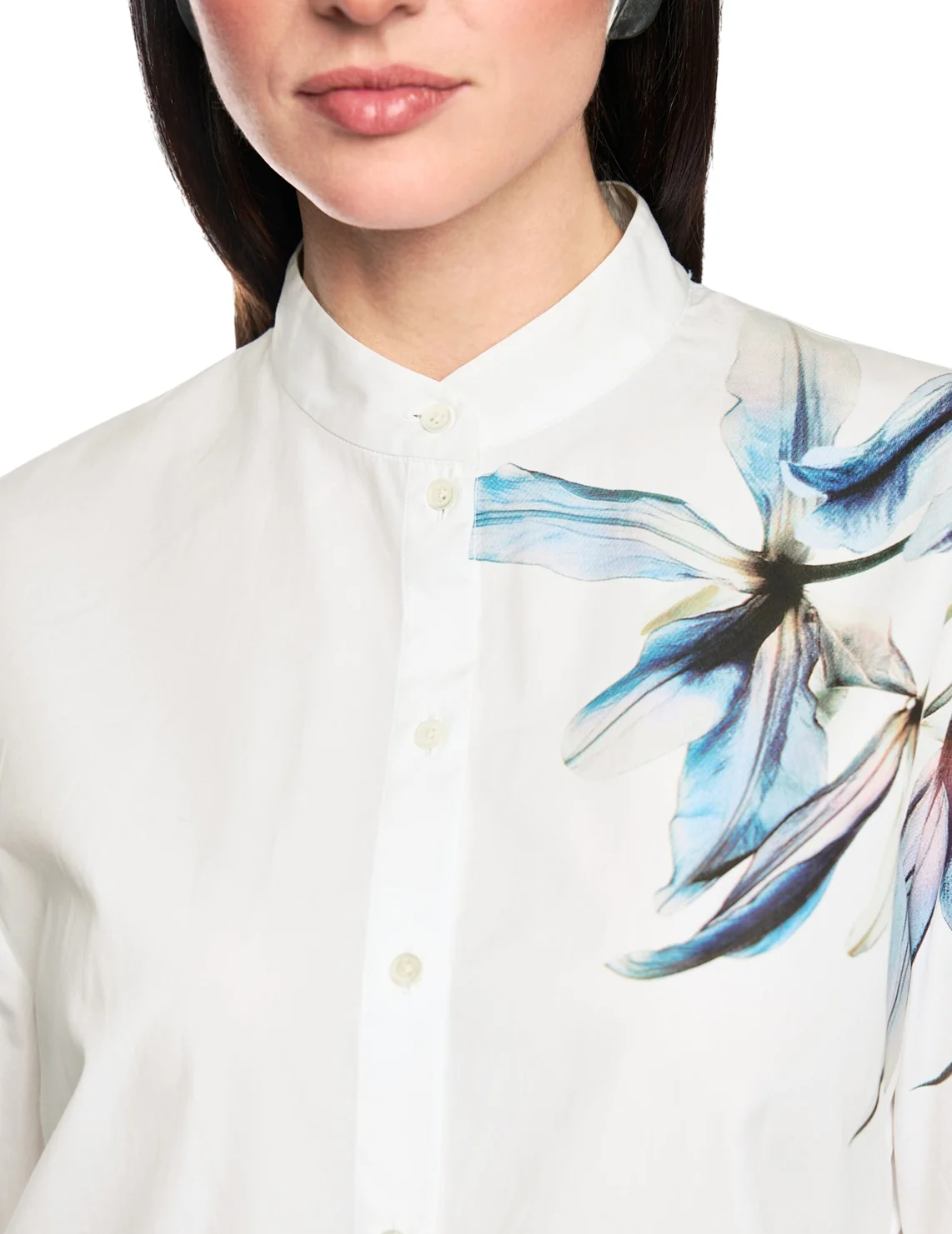 Рубашка изготовлена из хлопка высокого качества. Модель выполнена в свободном крое. Имеет воротник-стойку, планку с пуговицами, боковые разрезы и длинные рукава с манжетами. Декорирована цветочным принтом.
