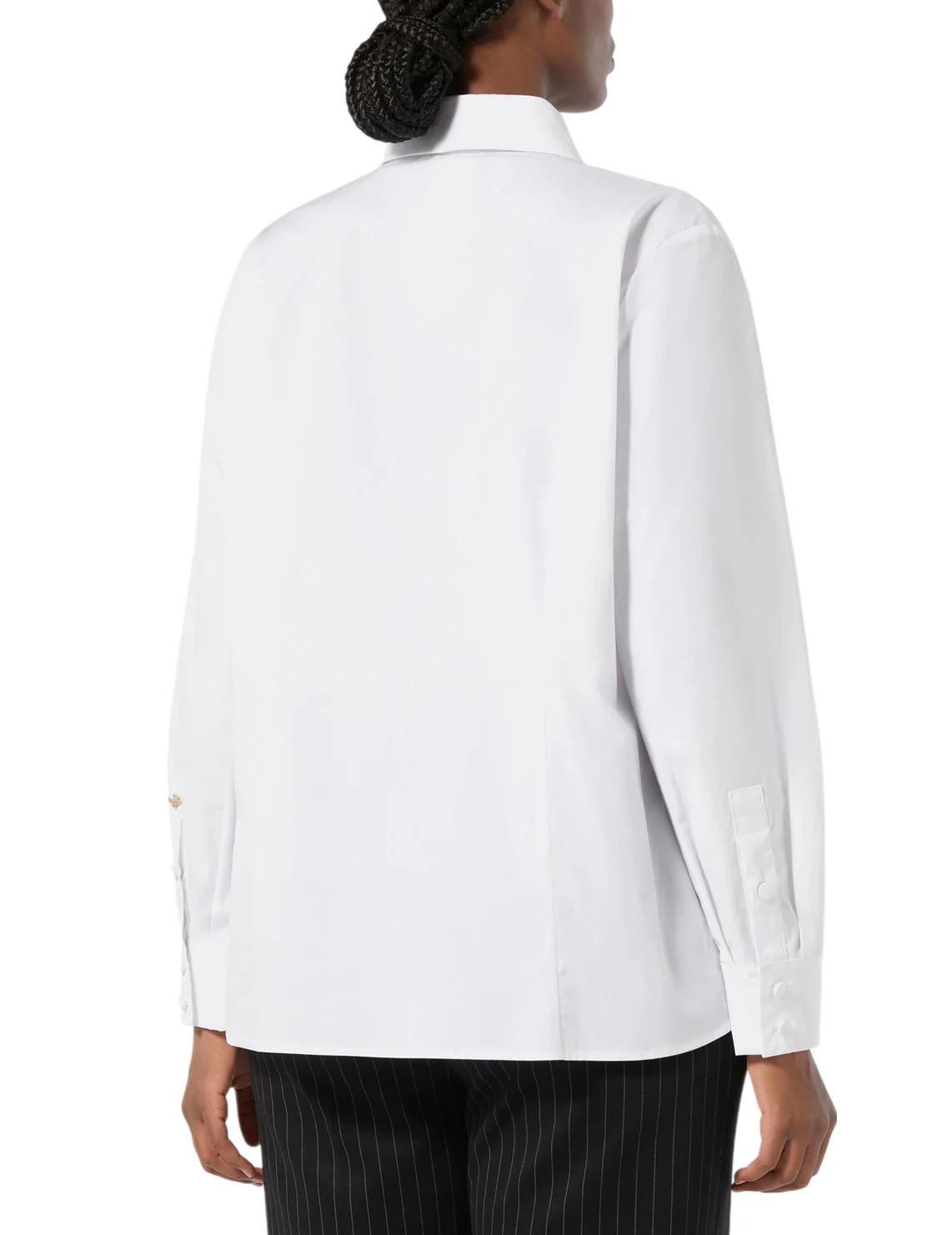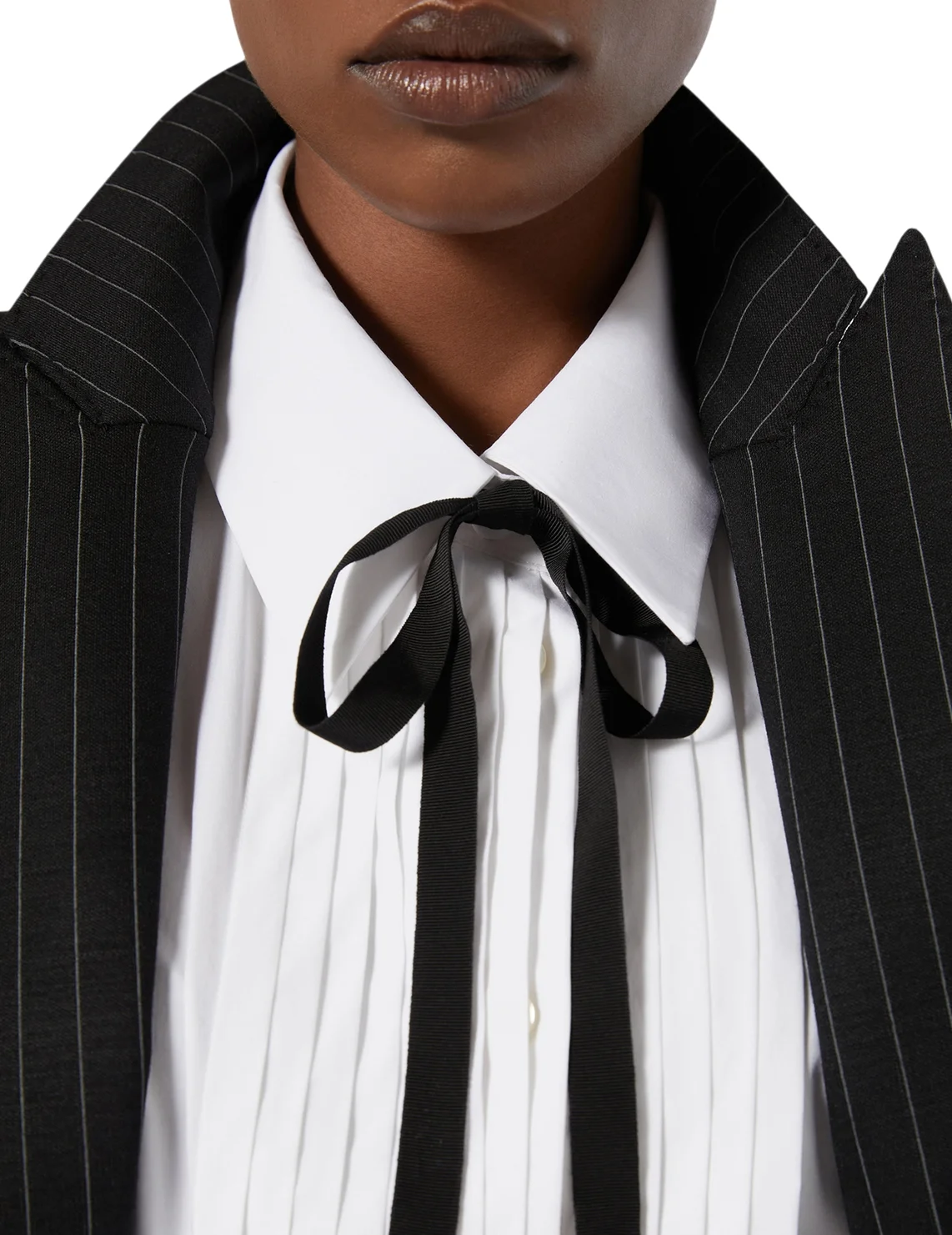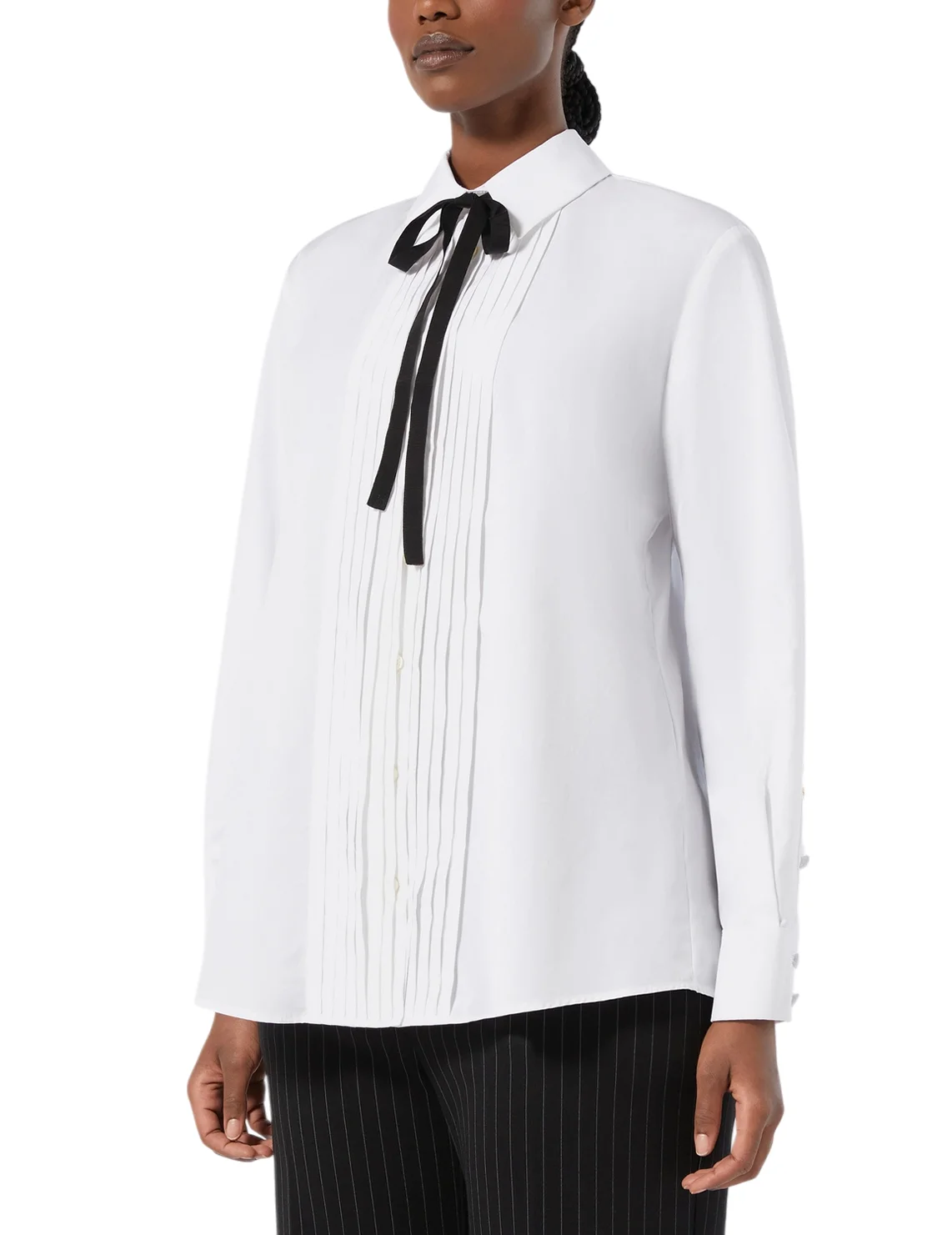Рубашка изготовлена из хлопка и эластана. Модель выполнена в прямом крое. Имеет отложной воротник, завязки, потайную планку с пуговицами и длинные рукава с манжетами. Декорирована складками.
