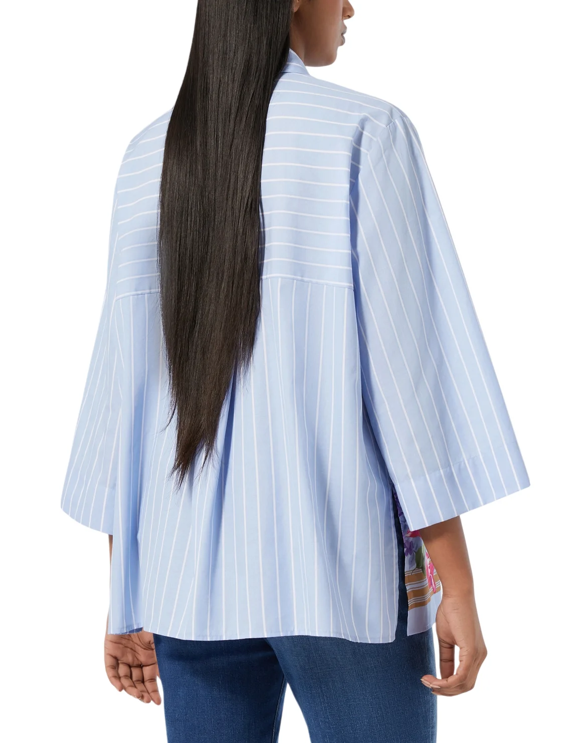 Рубашка изготовлена из 100% хлопка высокого качества. Модель прямого кроя. Имеет потайную планку с пуговицами, боковые разрезы, отложной воротник и рукава длиной 3/4. Декорирована оригинальным принтом.