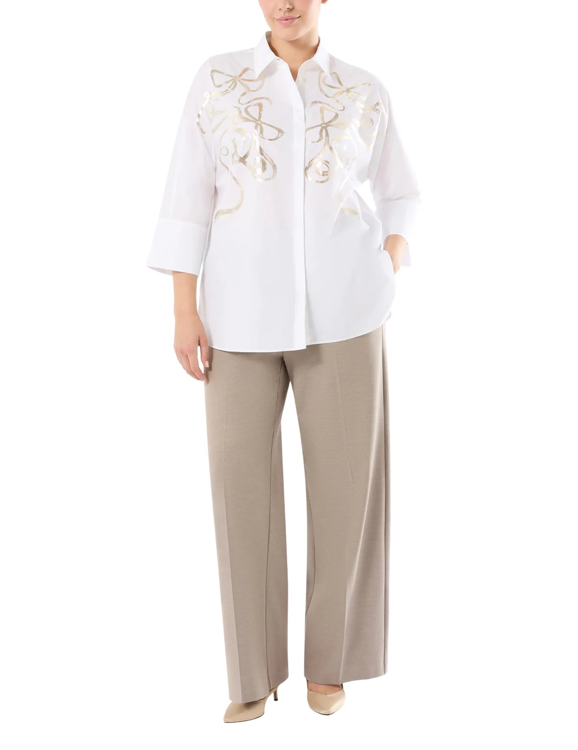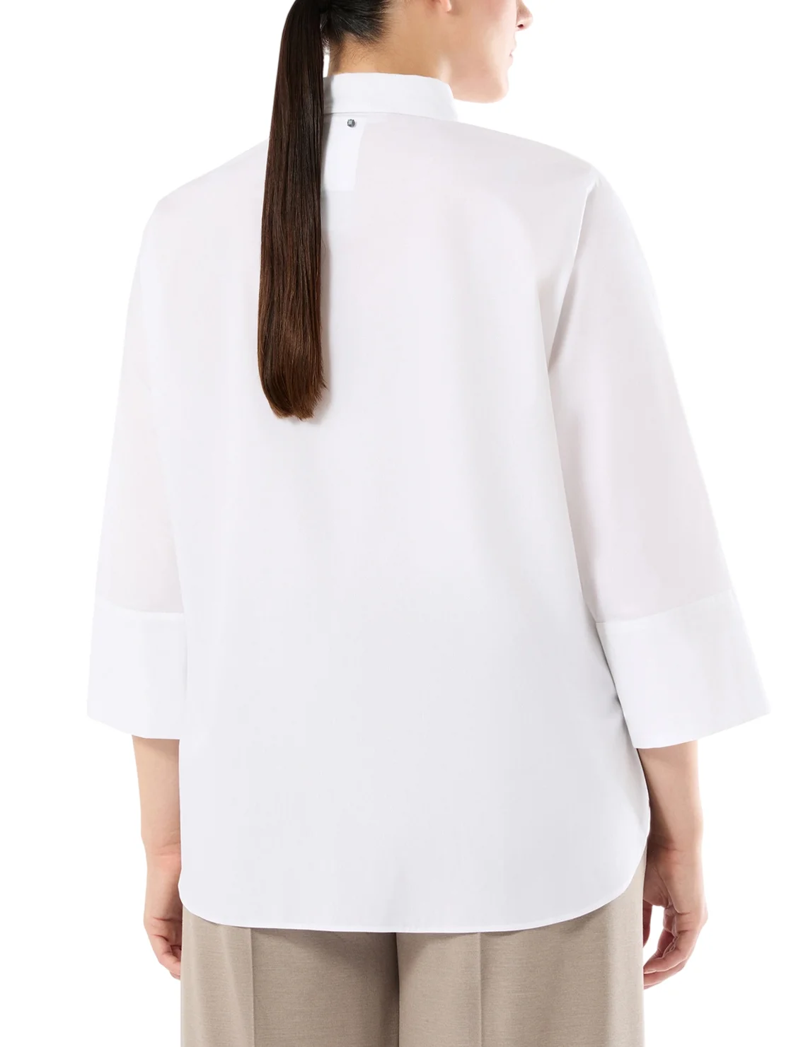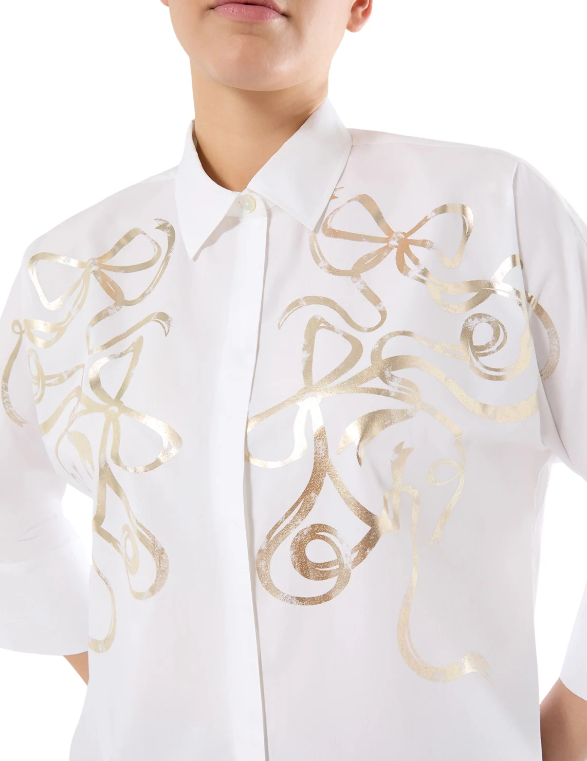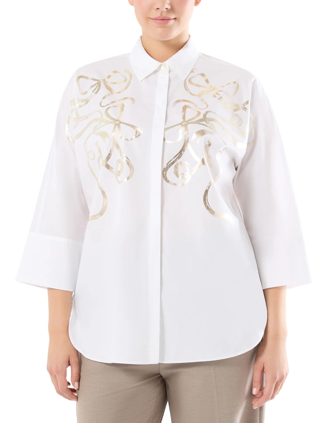 Рубашка изготовлена из 100% хлопка. Модель выполнена в свободном крое. Имеет отложной воротник, скрытую планку с пуговицами, боковые разрезы и рукава длиной 3/4. Декорирована оригинальным принтом.