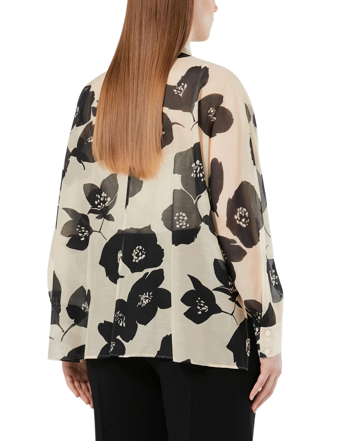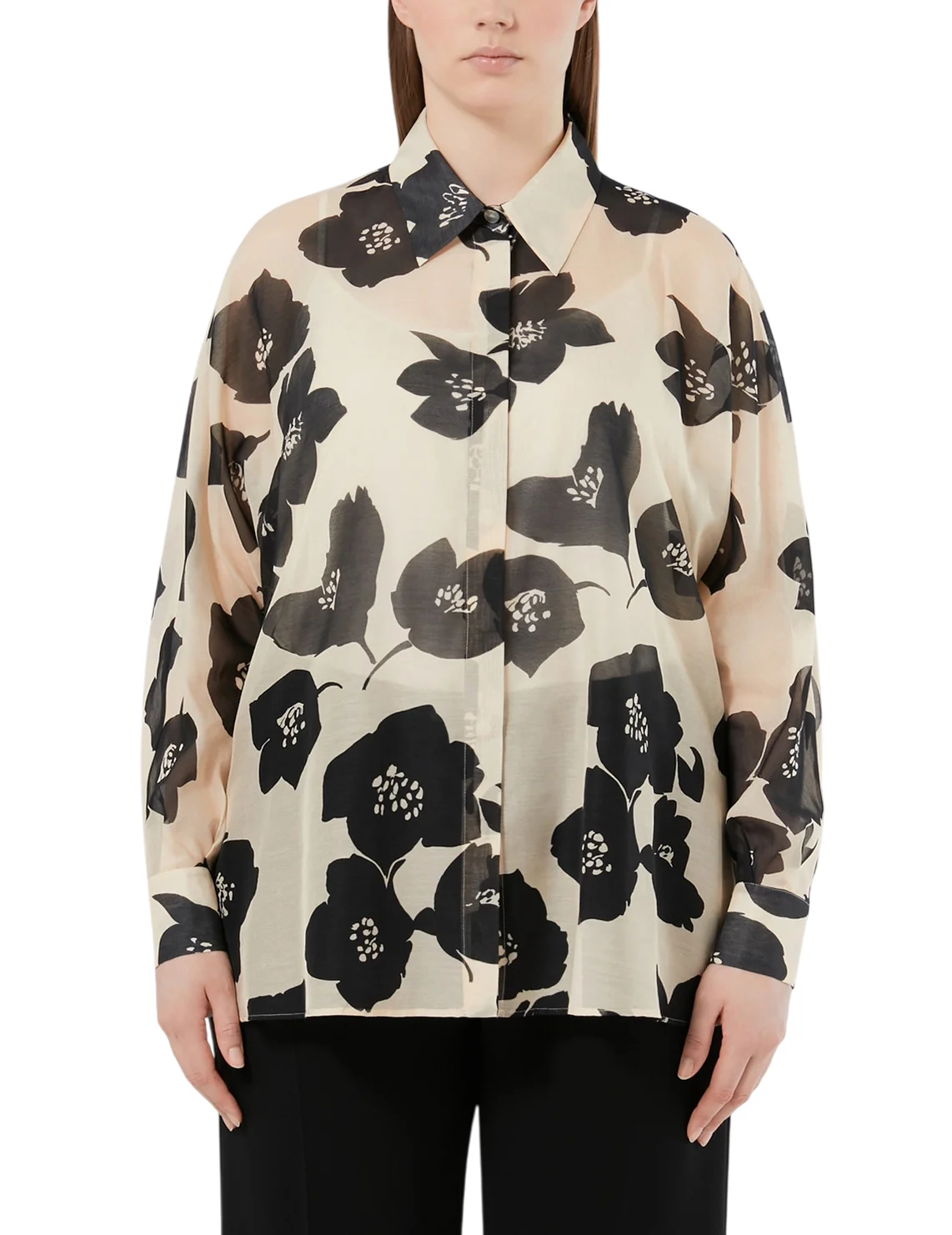 Рубашка изготовлена из хлопка и шелка. Модель выполнена в свободном крое. Имеет отложной воротник, боковые разрезы, потайную планку с пуговицами, длинные рукава с манжетами и цветочный принт.