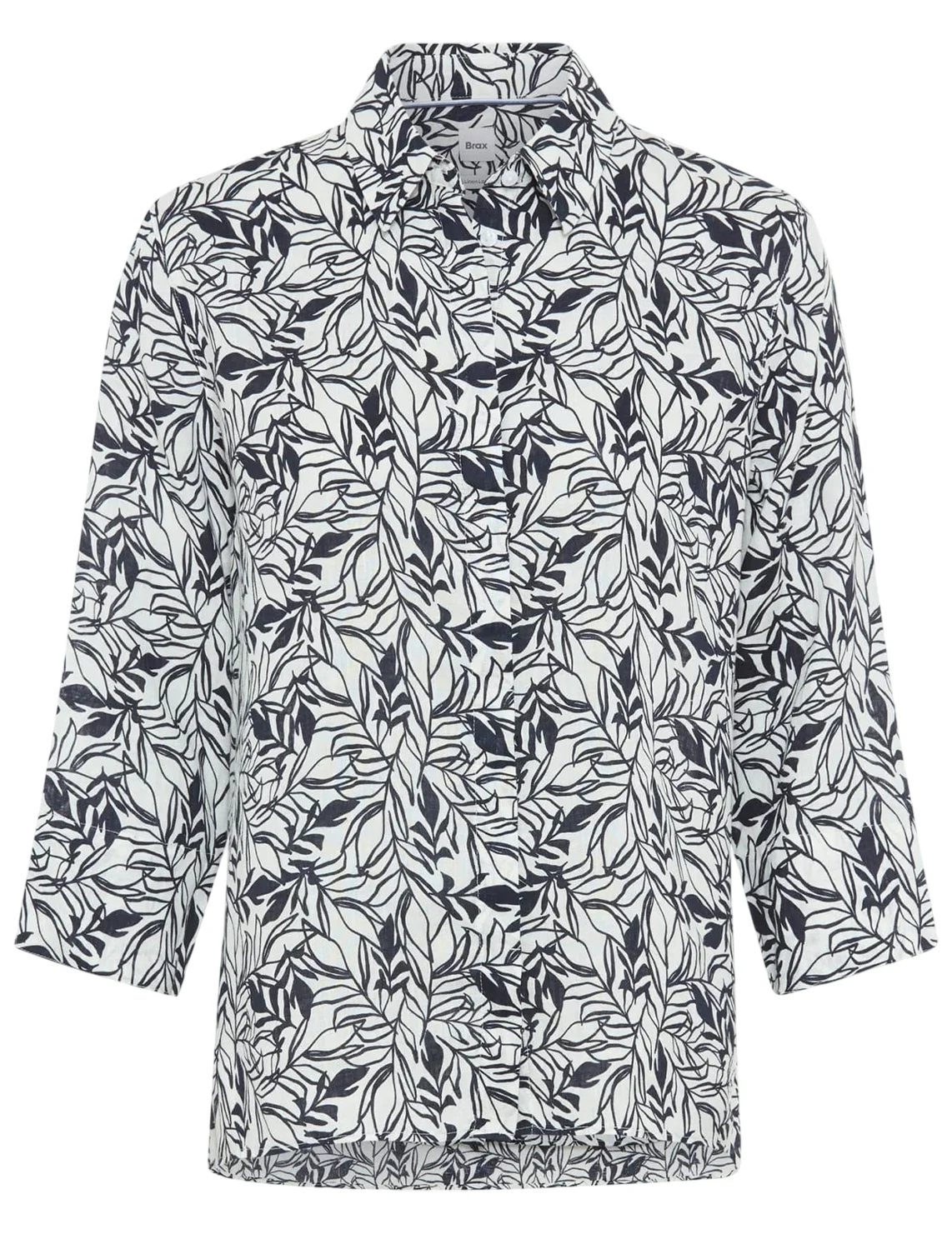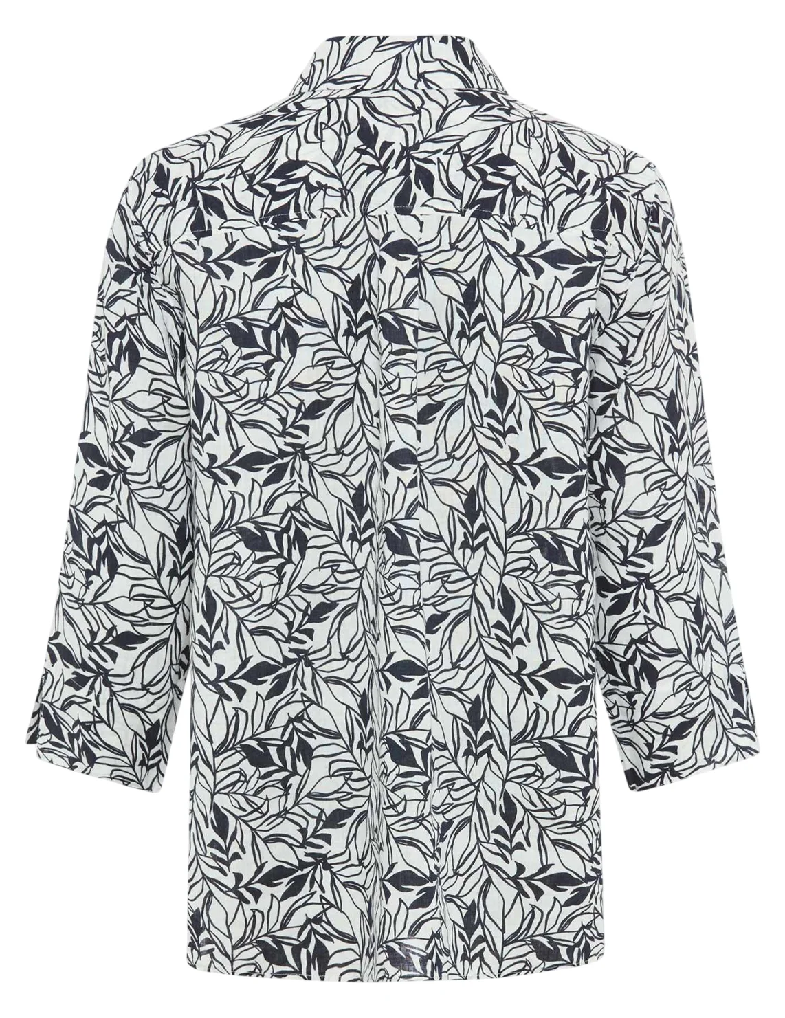 Рубашка изготовлена из 100% льна. Модель выполнена в прямом крое. Имеет отложной воротник, рукава длиной 3/4 и застежку на скрытую планку с пуговицами. Декорированная абстрактным принтом.