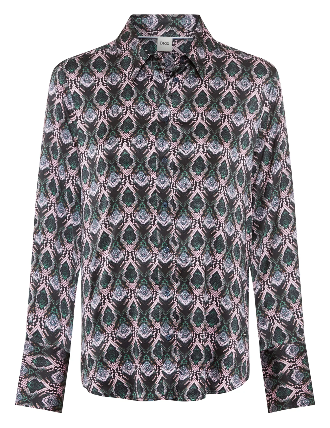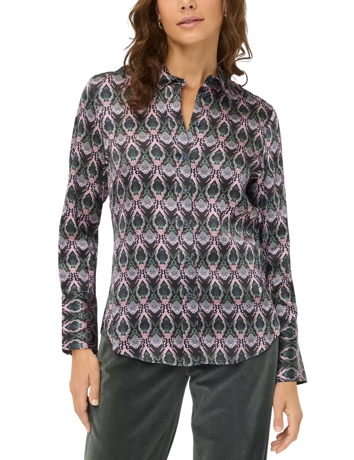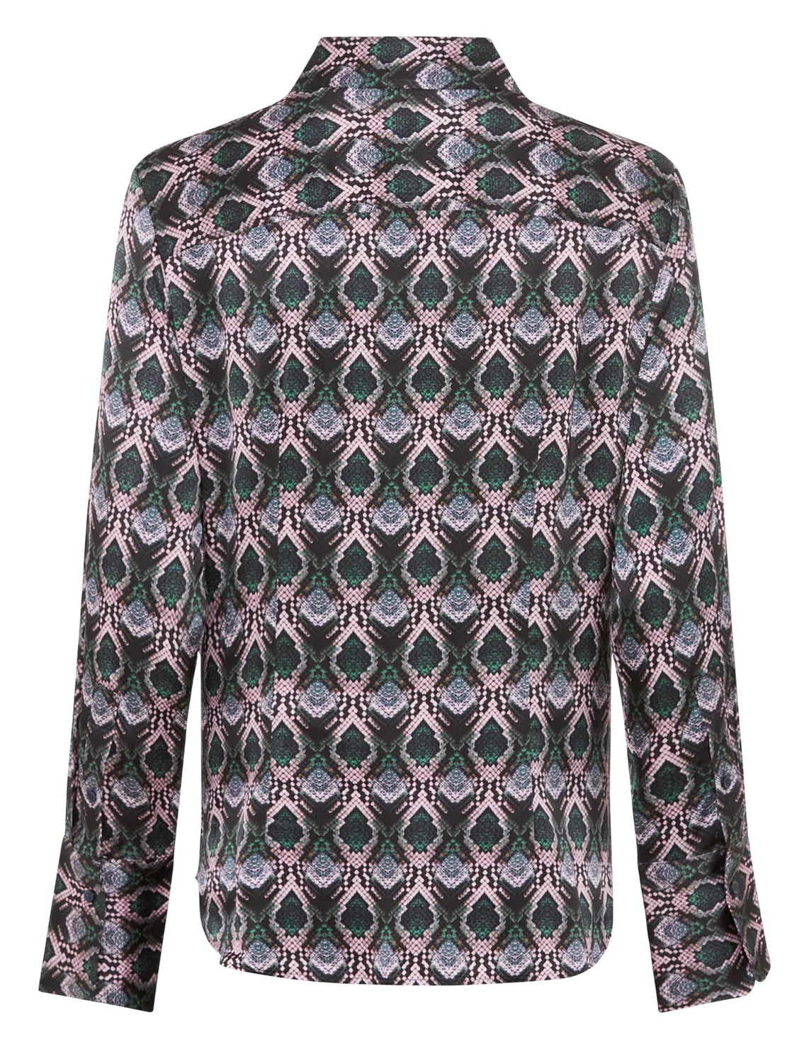 Рубашка изготовлена из вискозы и эластана. Модель выполнена в приталенном крое. Имеет классический отложной воротник, планку с пуговицами и длинные рукава с манжетами. Декорирована анималистичным принтом.