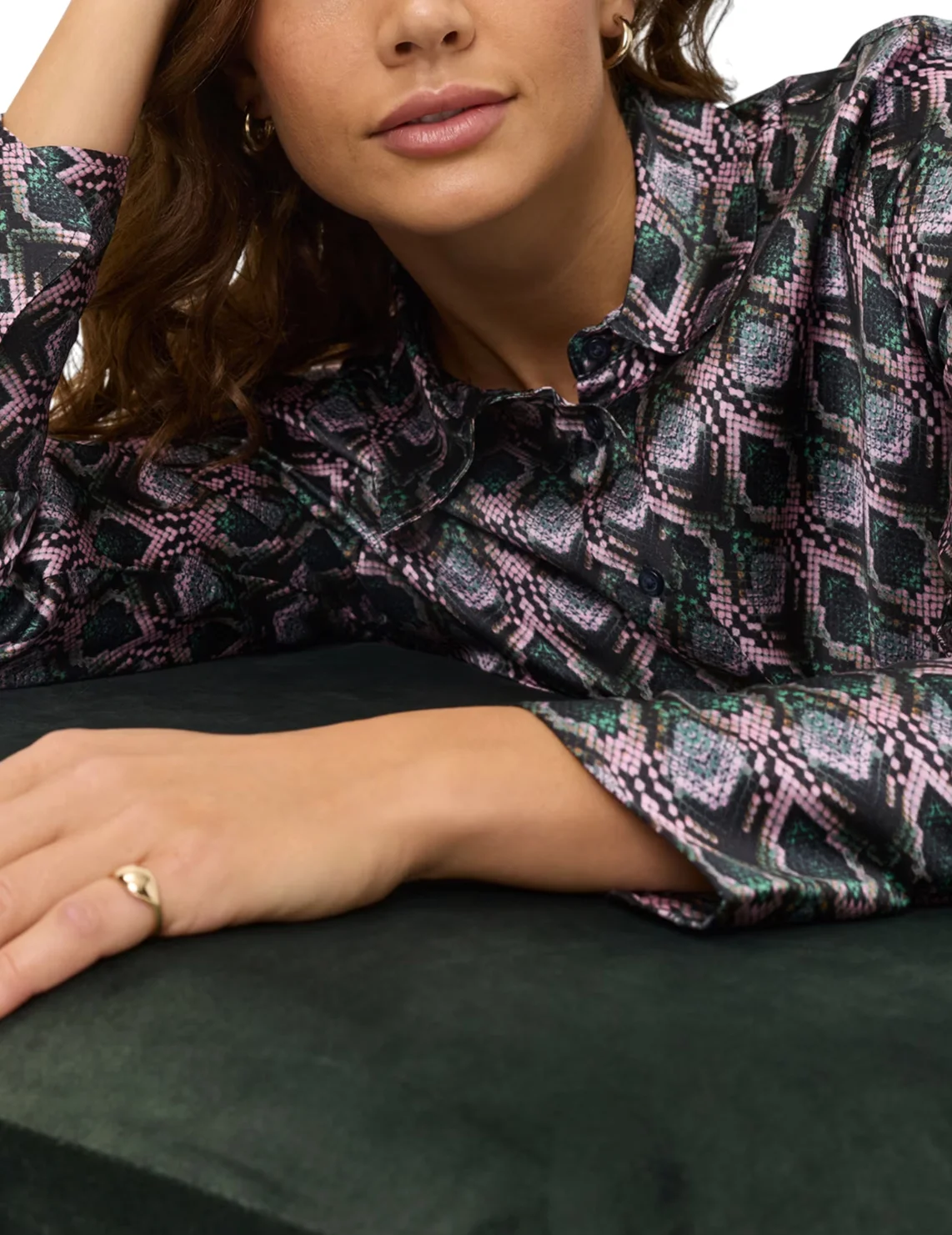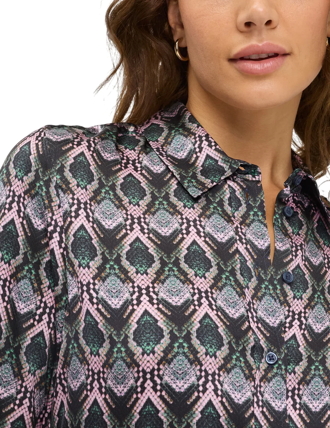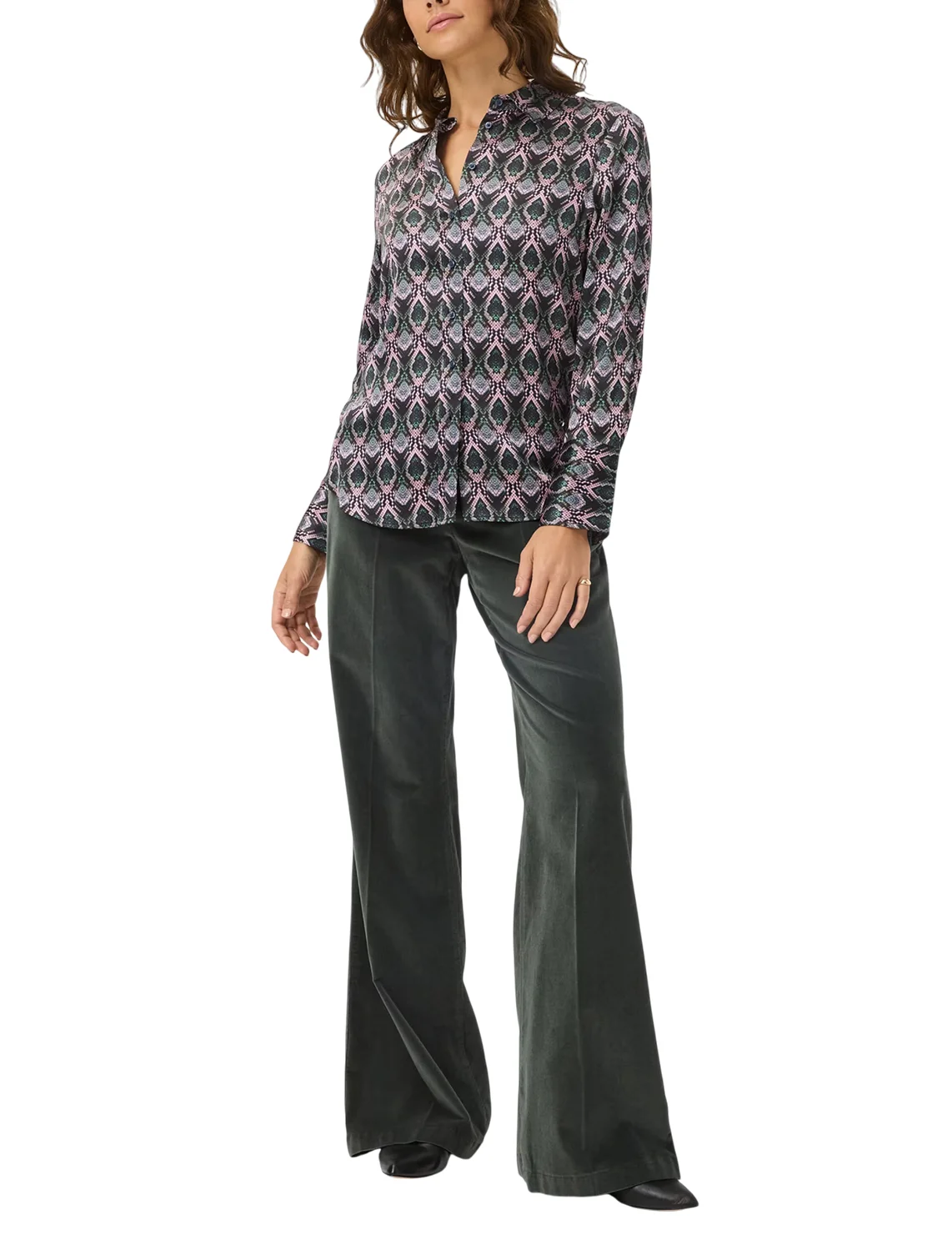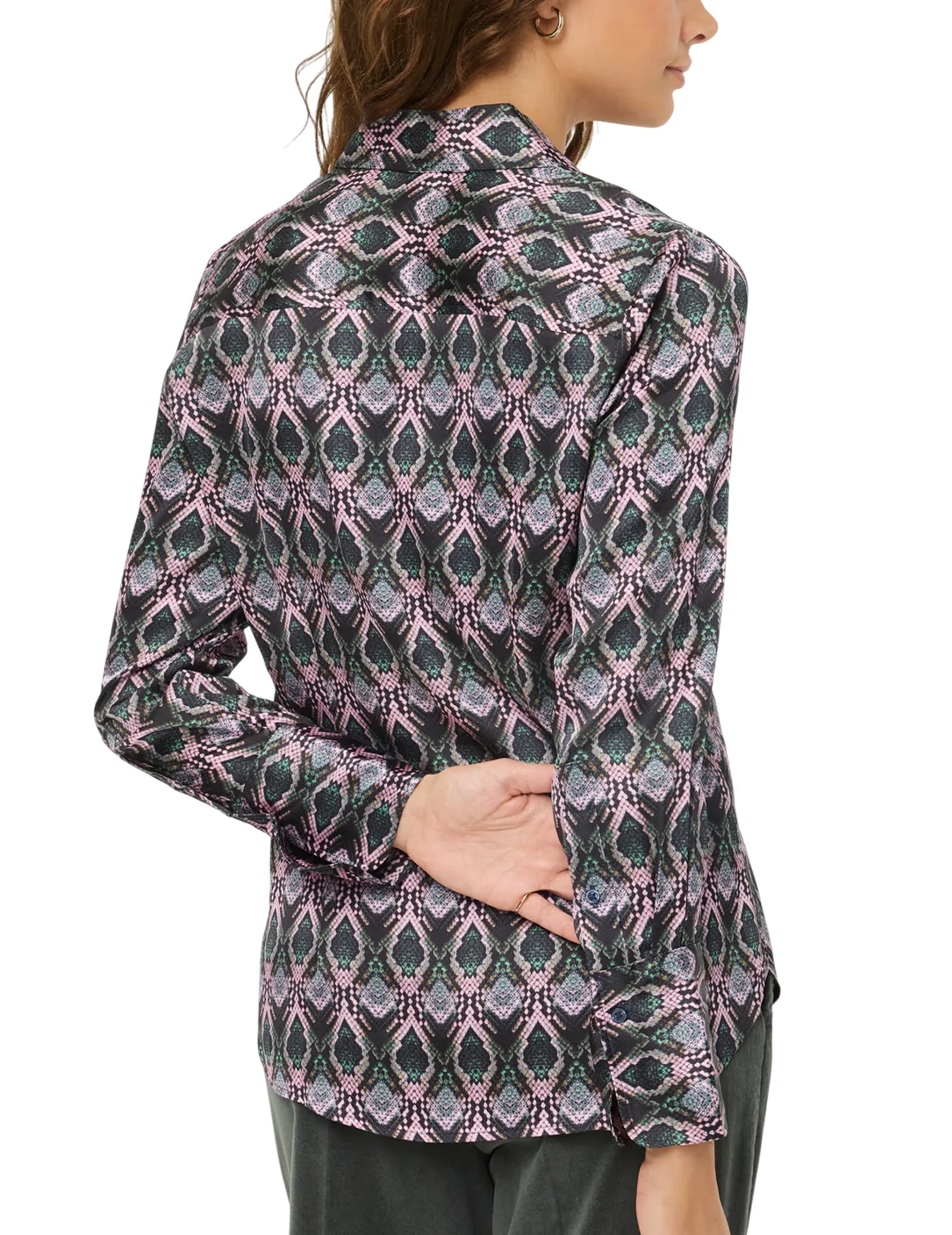 Рубашка изготовлена из вискозы и эластана. Модель выполнена в приталенном крое. Имеет классический отложной воротник, планку с пуговицами и длинные рукава с манжетами. Декорирована анималистичным принтом.