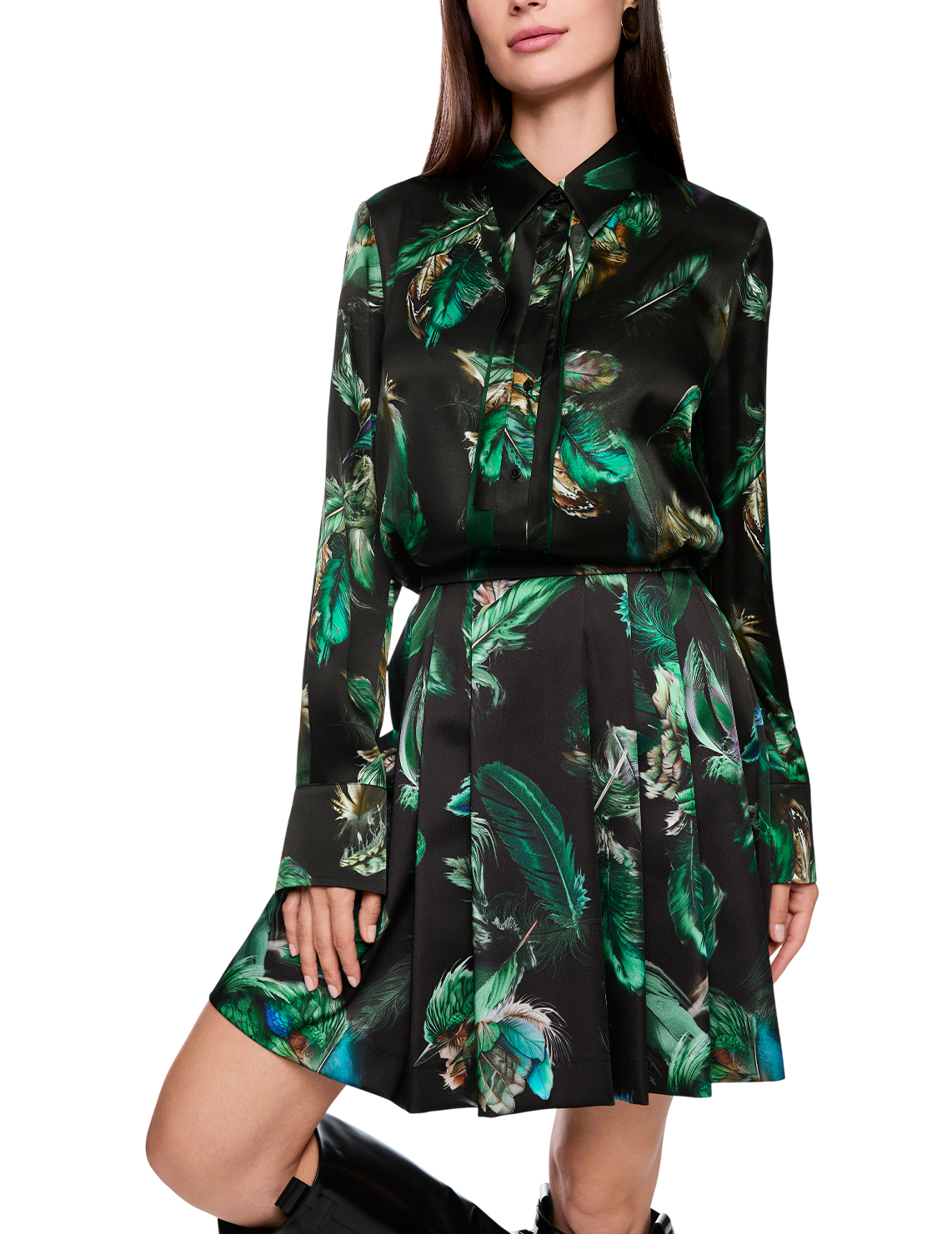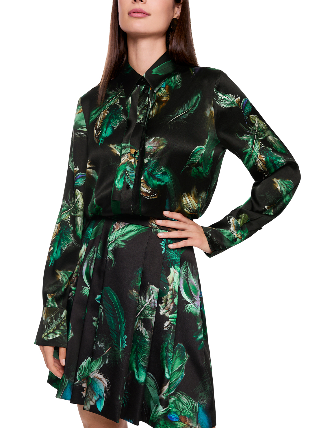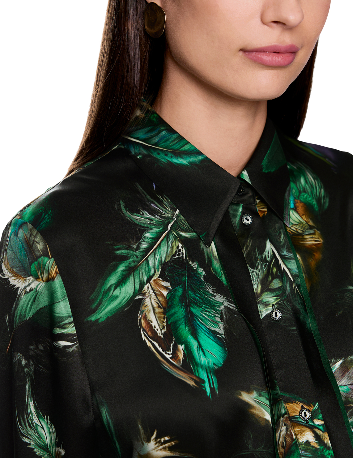 Рубашка изготовлена из шелка и эластана. Модель выполнена в свободном крое. Имеет отложной воротник, планку с пуговицами и длинные рукава с манжетами. Декорирована оригинальным принтом.