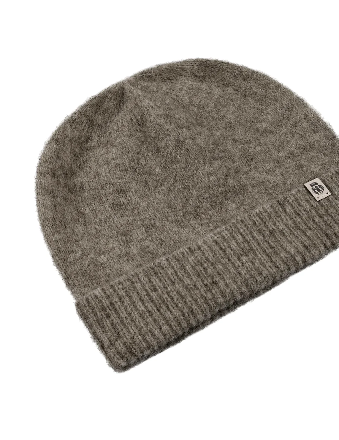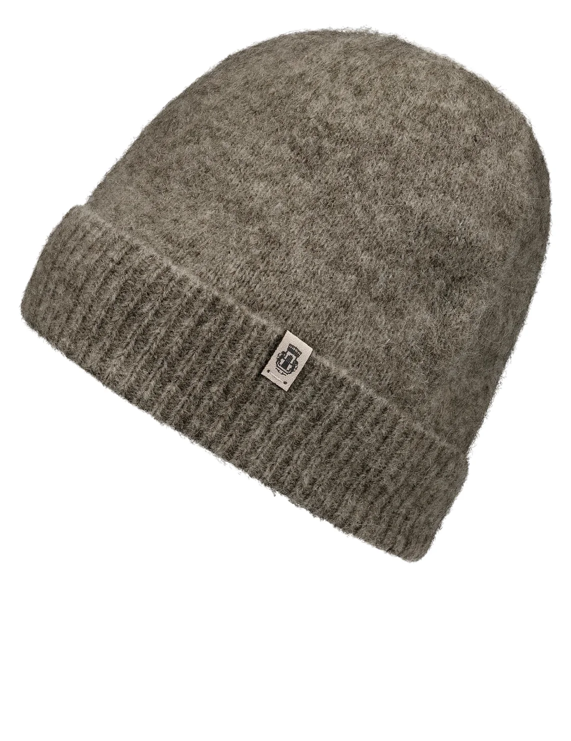 Шапка изготовлена из шерсти, альпаки, полиамида и эластана. Модель имеет классический отворот и декоративную нашивку с логотипом бренда.