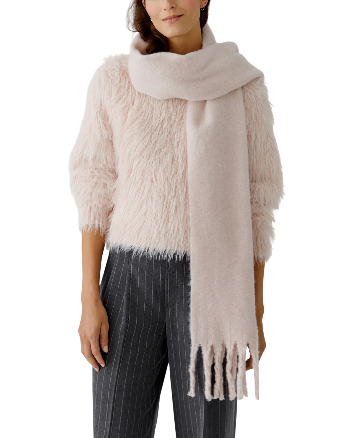 Шарф изготовлен из 100% полиэстера. Модель имеет нашивку с надписью бренда и бахрому по краям.