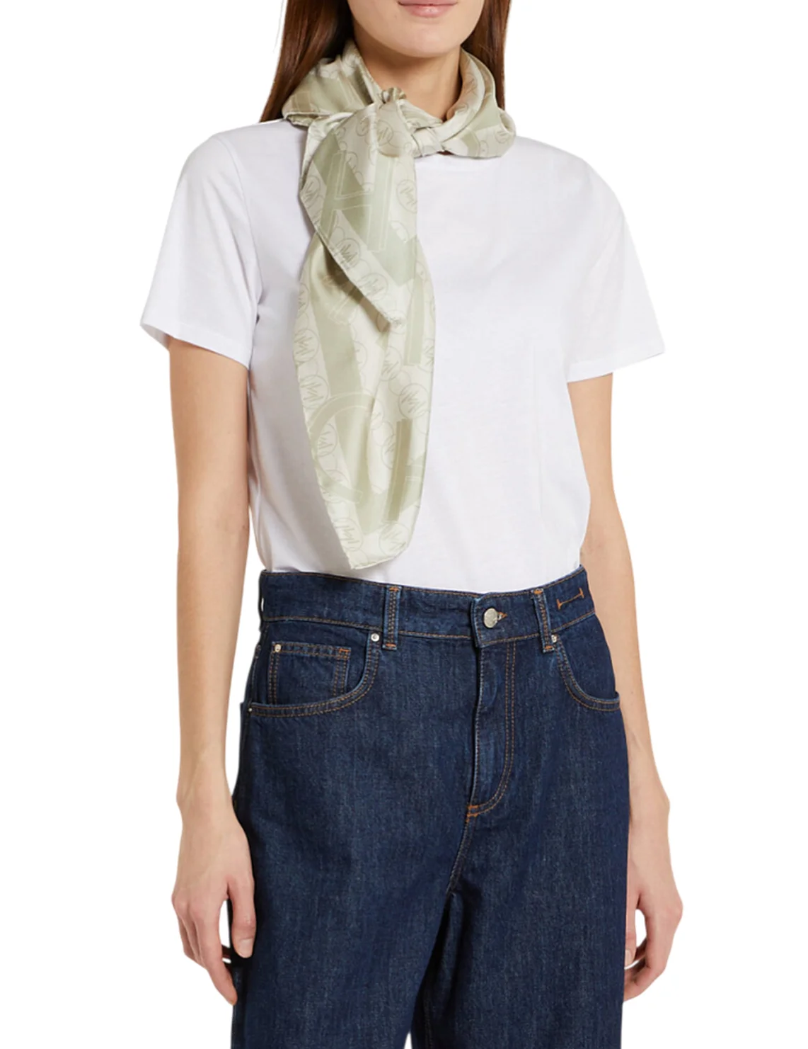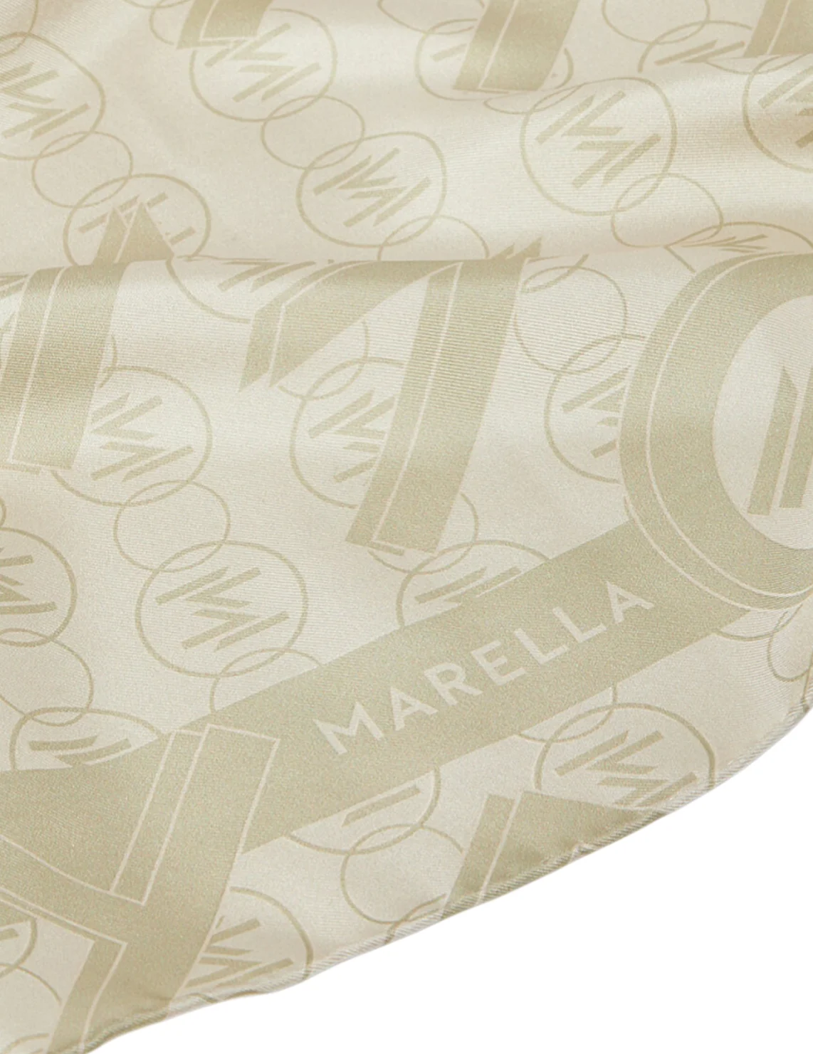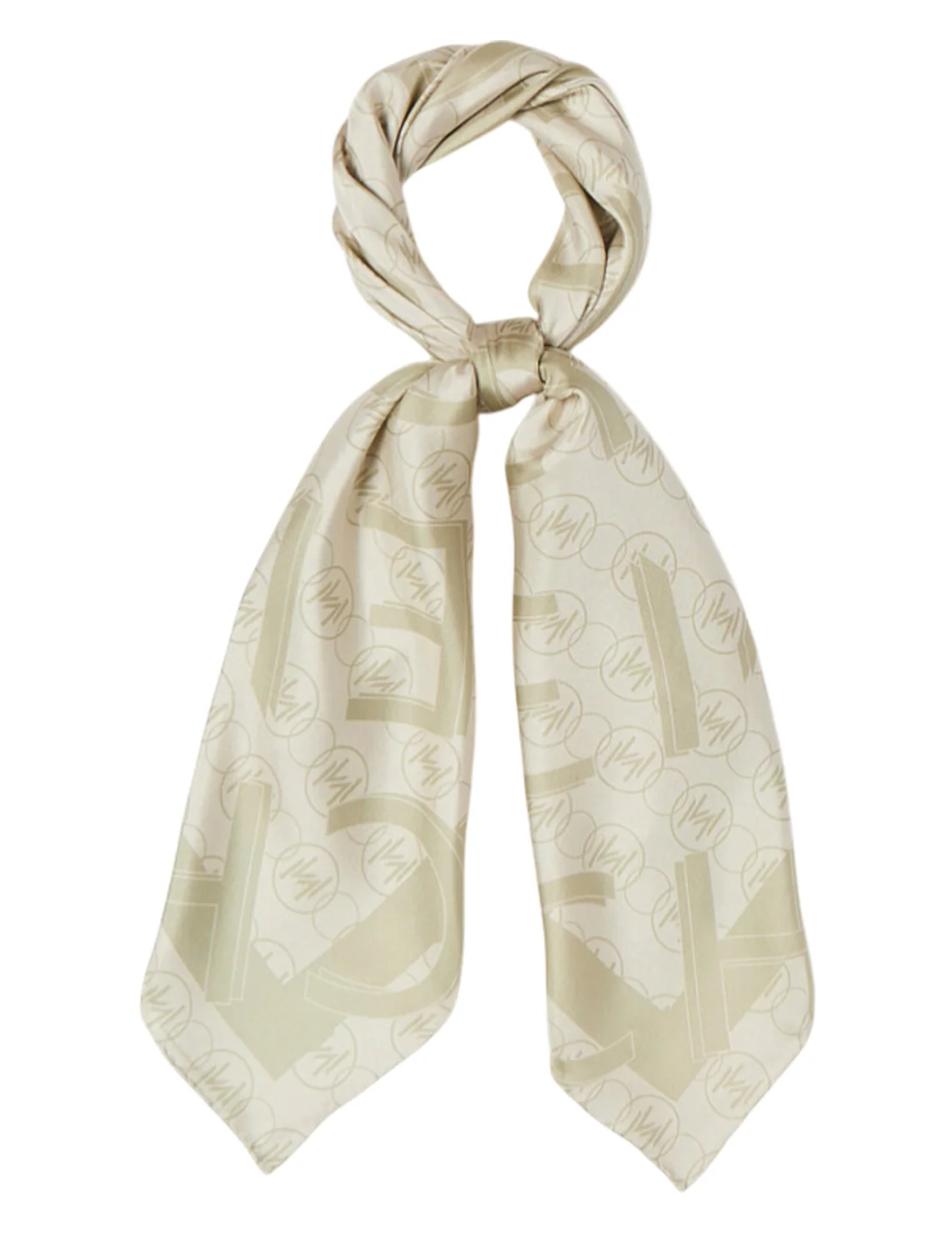 Платок изготовлен из 100% шелка высокого качества. Модель имеет оригинальный принт с надписью.