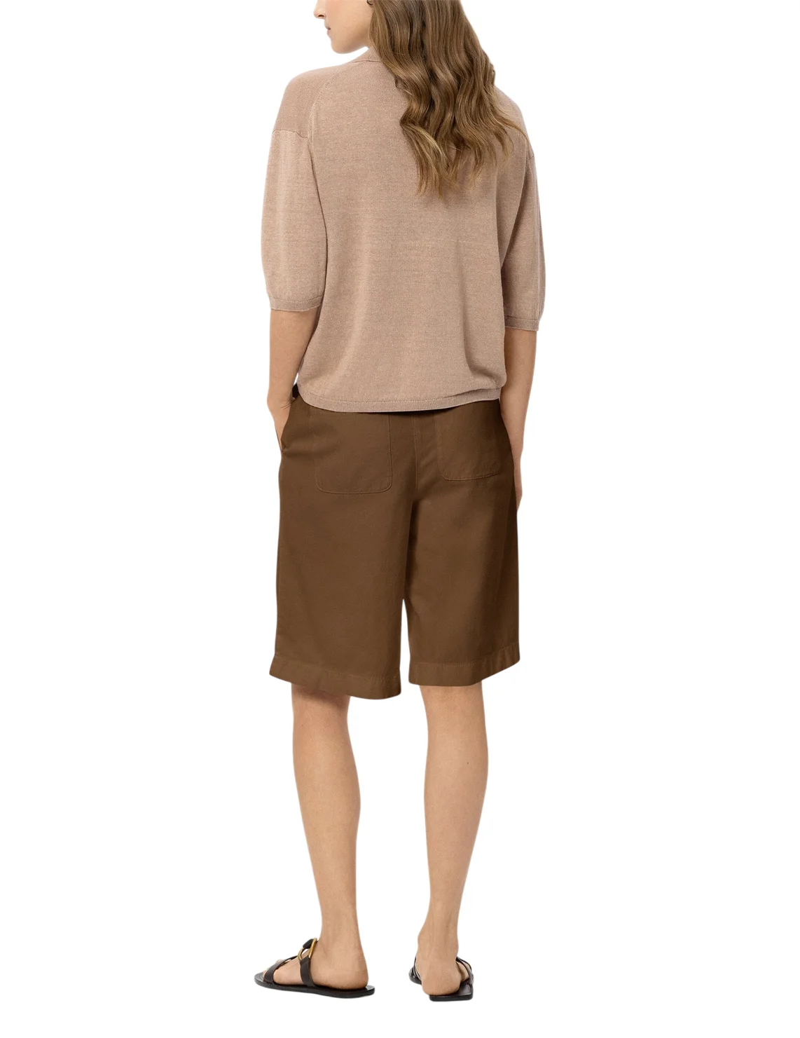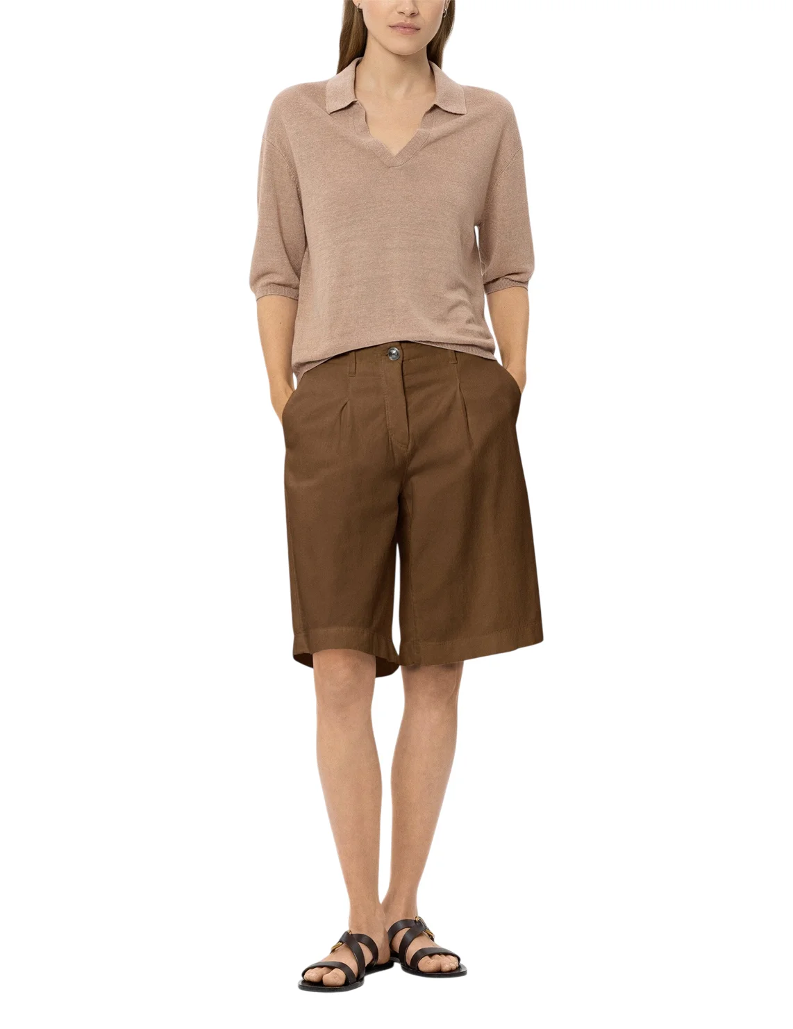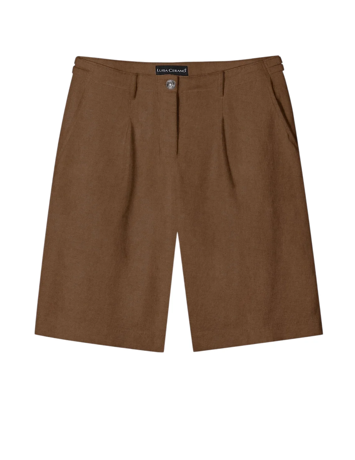 Шорты изготовлены из хлопка, льна, лиоцелла и эластана. Модель выполнена в широком крое. Имеет по два прорезных и накладных кармана, складки, шлевки для ремня. Застегивается на пуговицу и молнию.