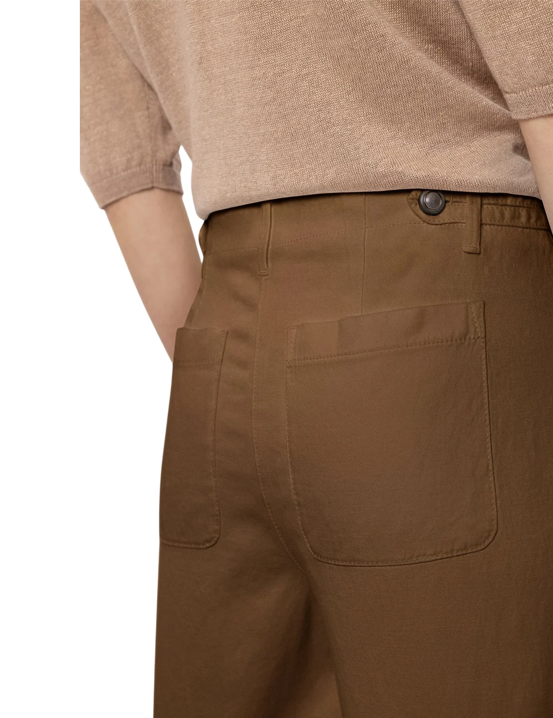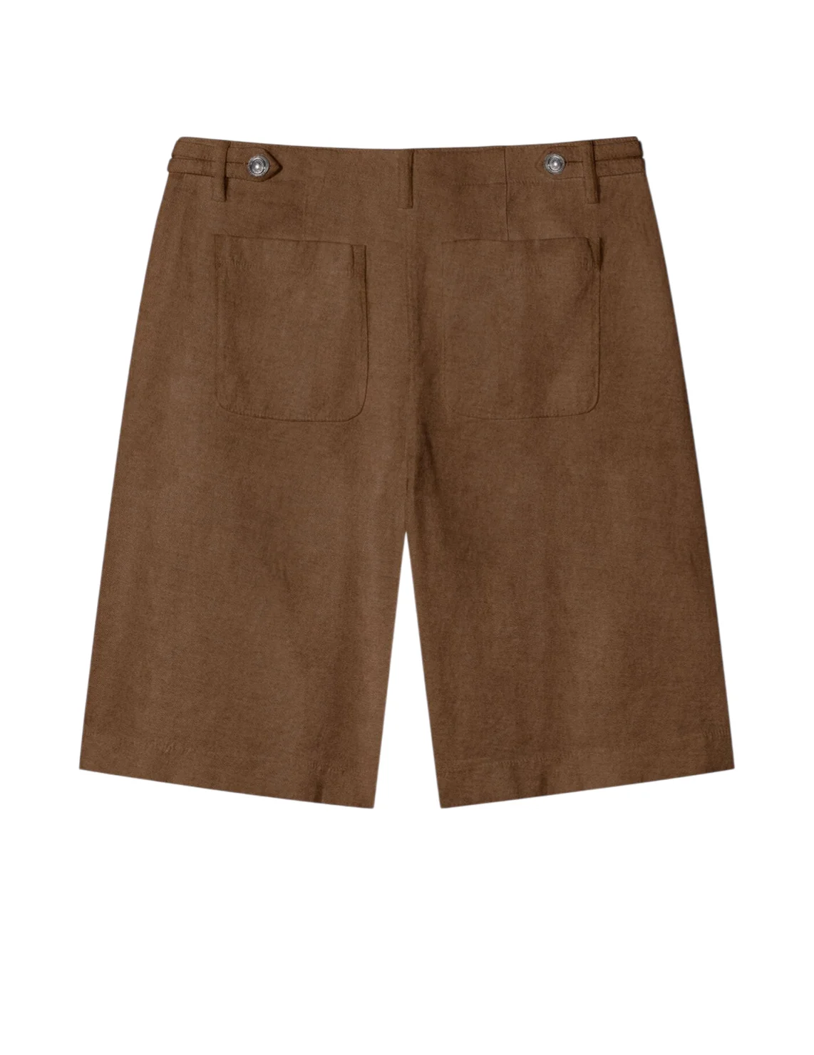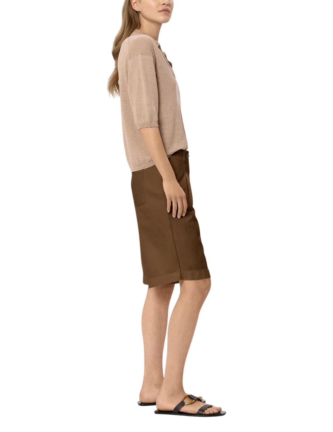 Шорты изготовлены из хлопка, льна, лиоцелла и эластана. Модель выполнена в широком крое. Имеет по два прорезных и накладных кармана, складки, шлевки для ремня. Застегивается на пуговицу и молнию.