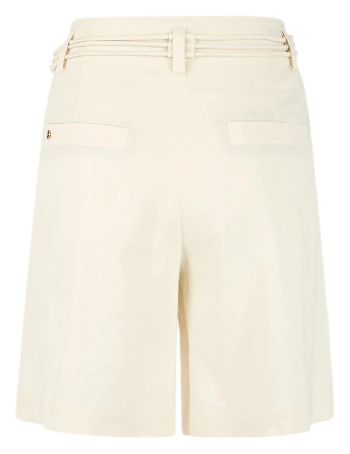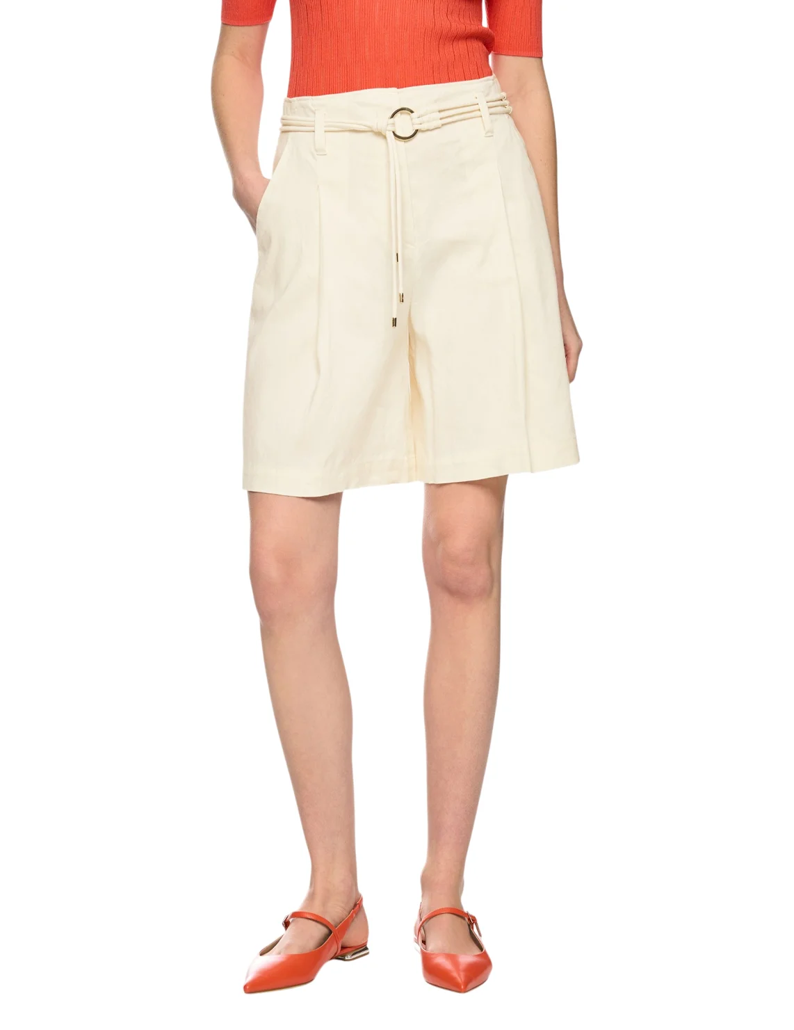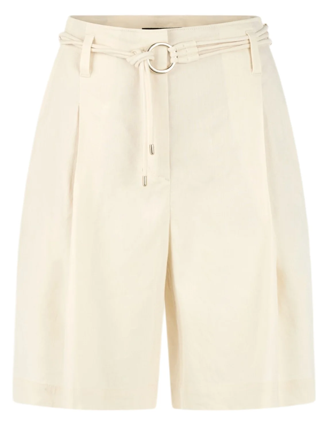 Шорты изготовлены из льна с добавлением вискозы и эластана. Выполнены в прямом крое. Имеют шлевки для ремня, пояс в тон, складки и прорезные карманы. Застёгиваются на молнию и крючок.