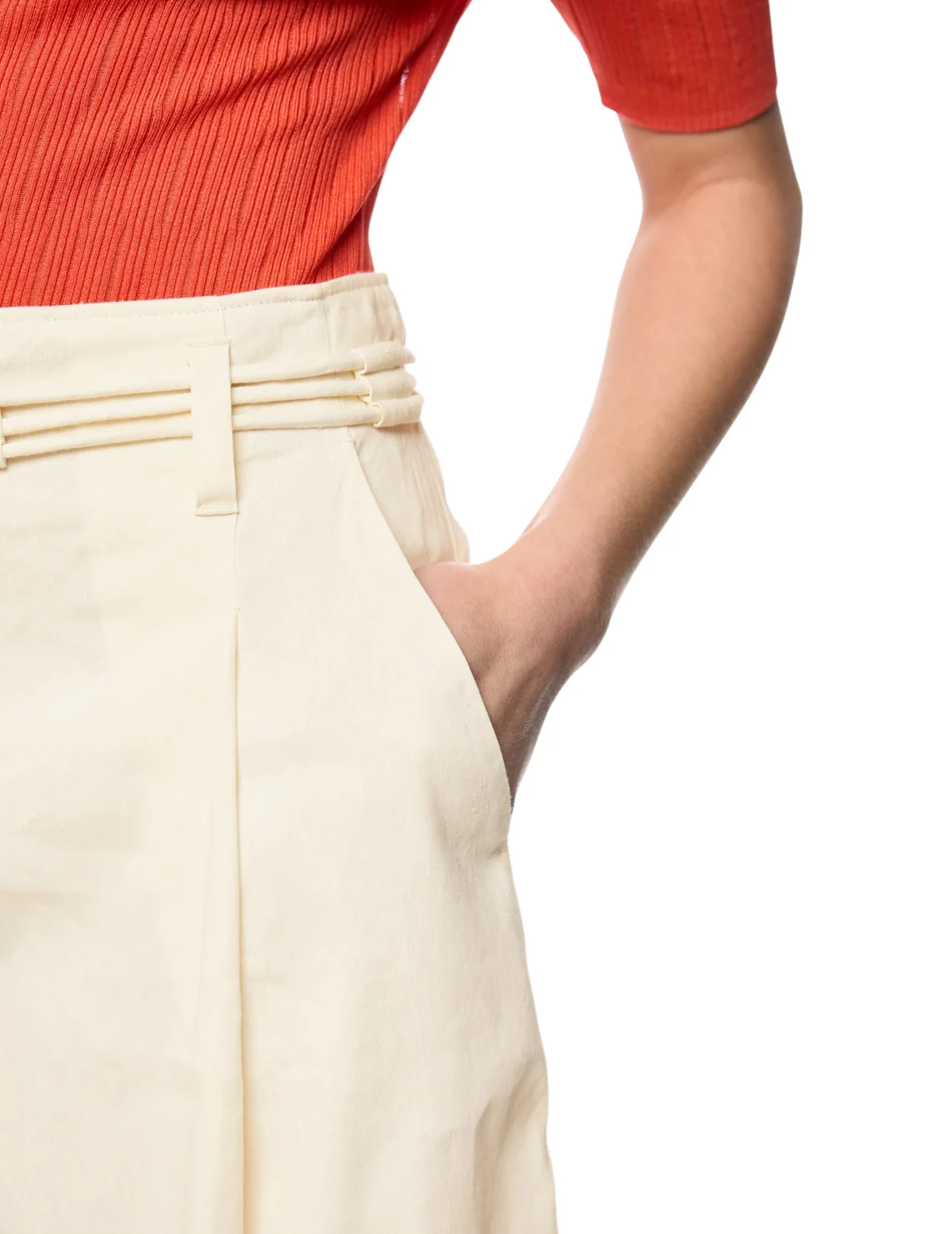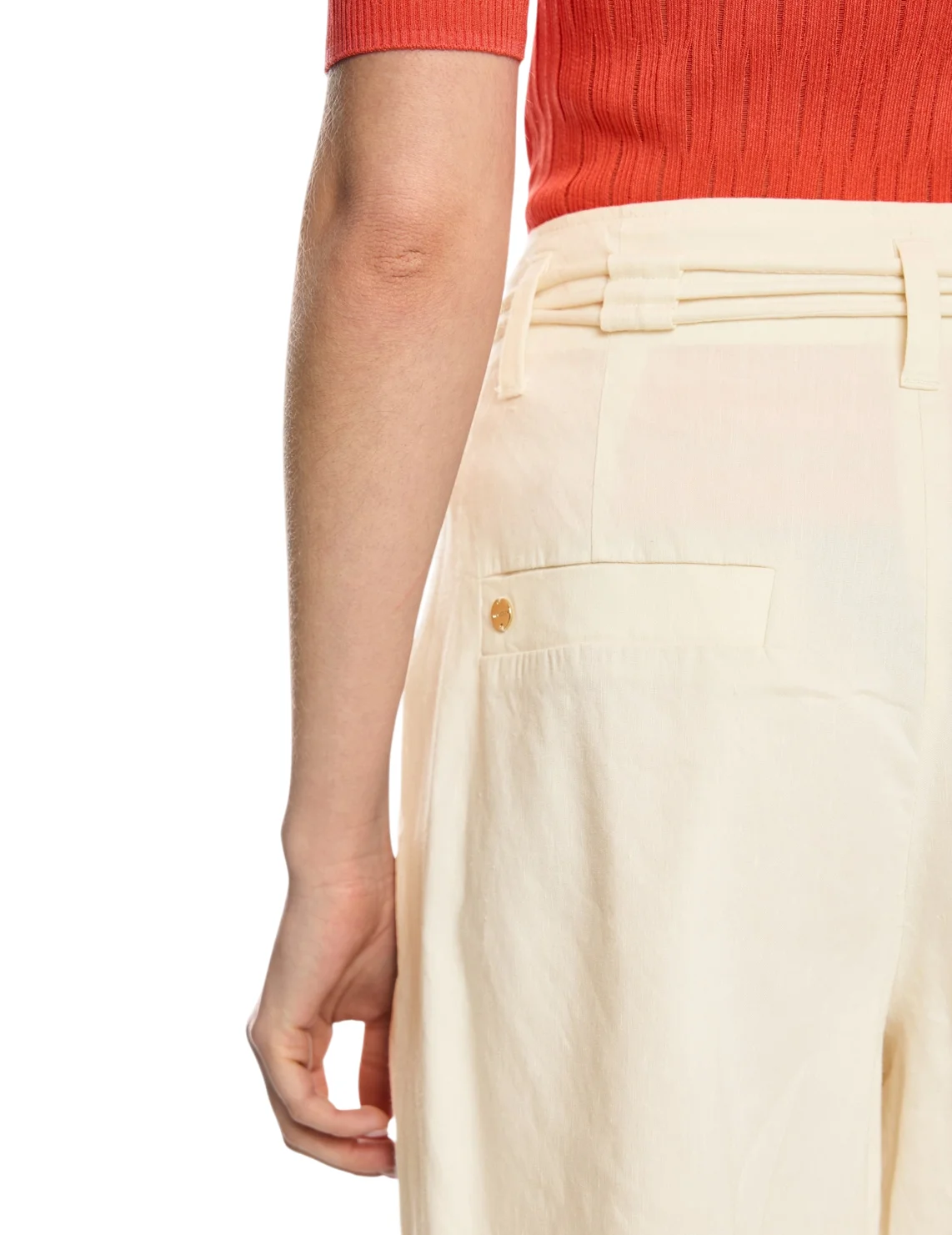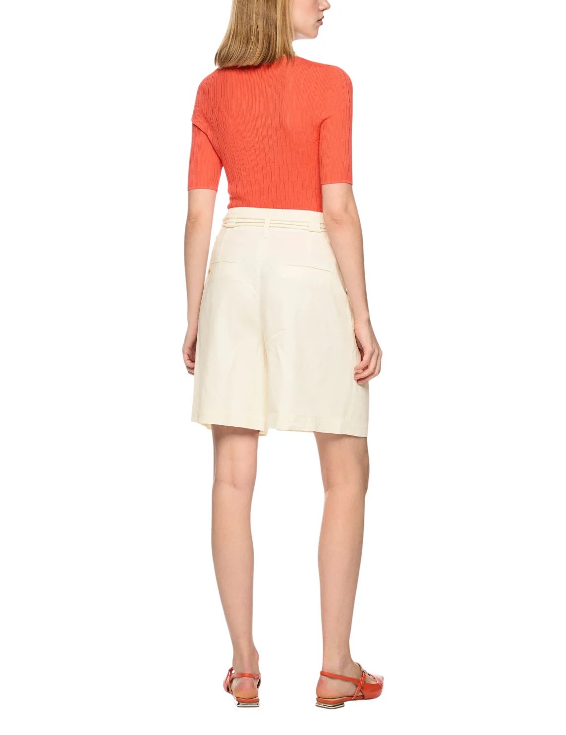 Шорты изготовлены из льна с добавлением вискозы и эластана. Выполнены в прямом крое. Имеют шлевки для ремня, пояс в тон, складки и прорезные карманы. Застёгиваются на молнию и крючок.