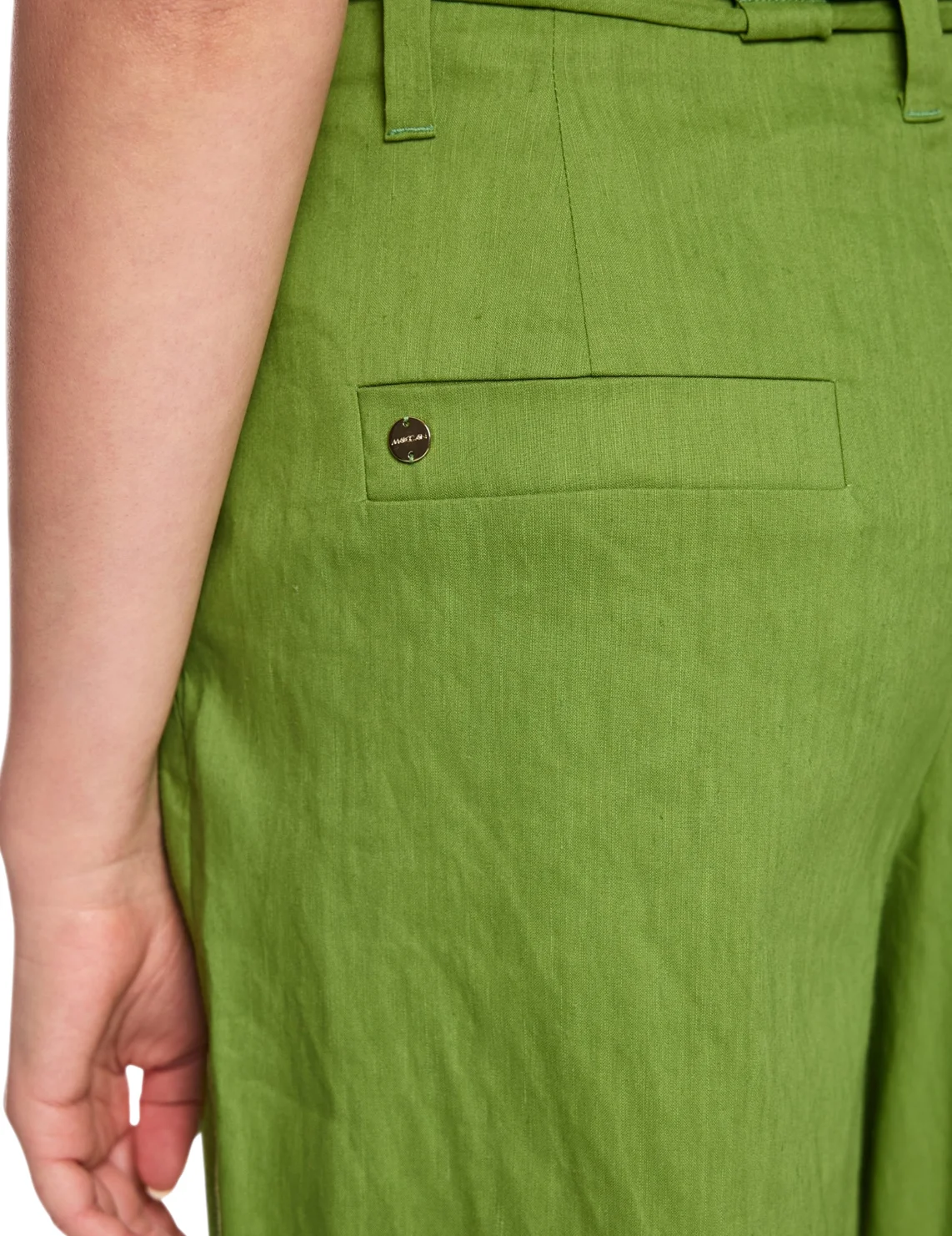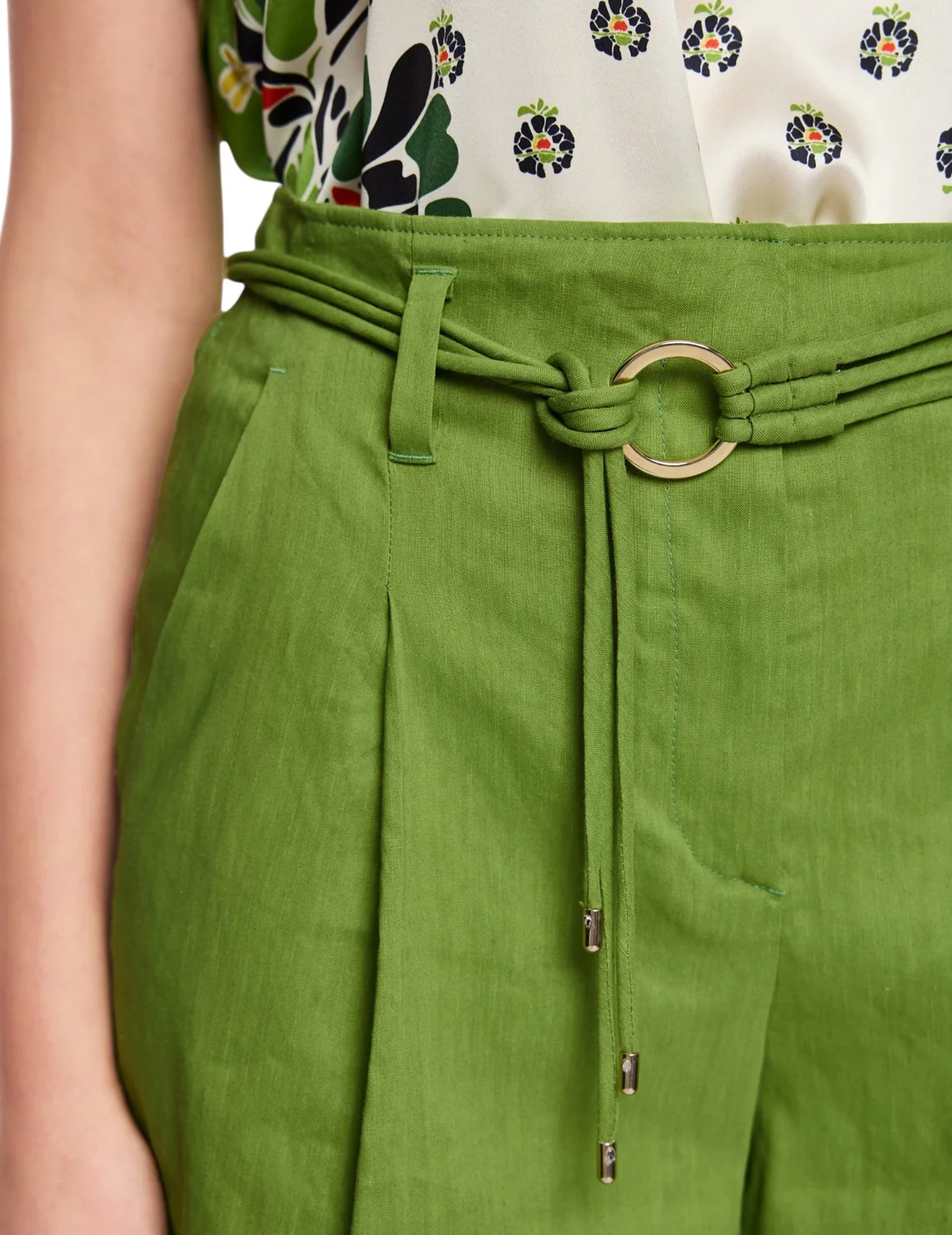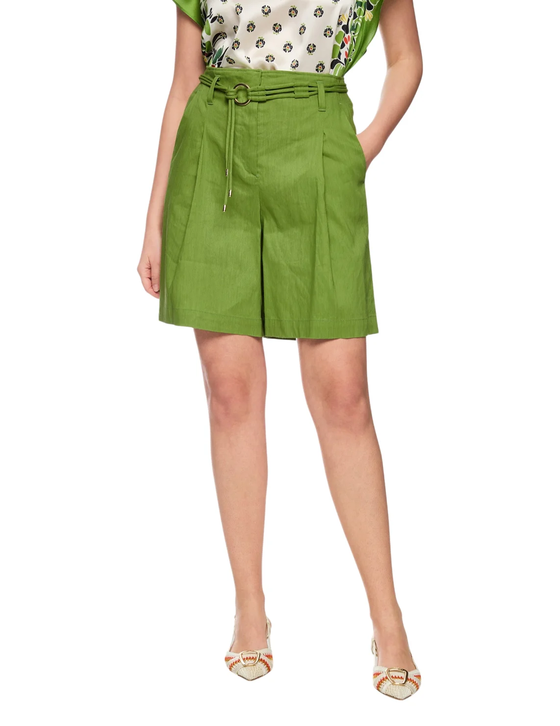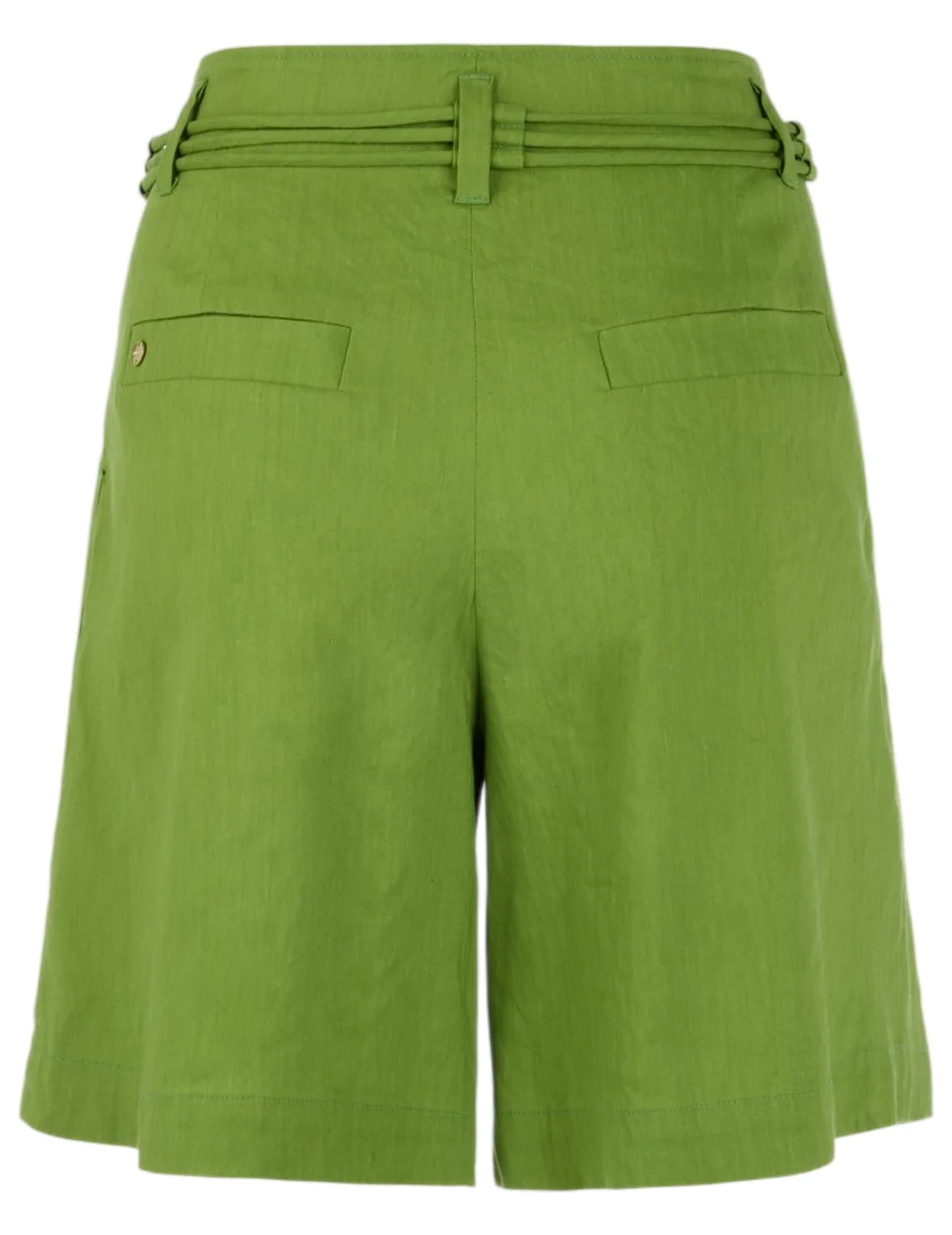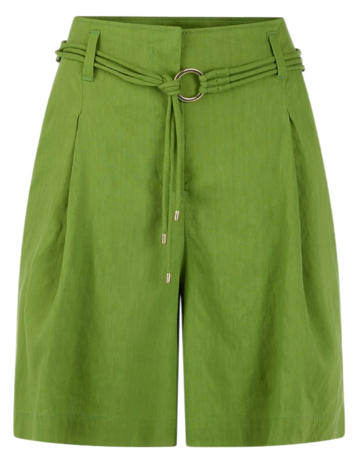 Шорты изготовлены из льна с добавлением вискозы и эластана. Выполнены в прямом крое. Имеют шлевки для ремня, пояс в тон, складки и прорезные карманы. Застёгиваются на молнию и крючок.