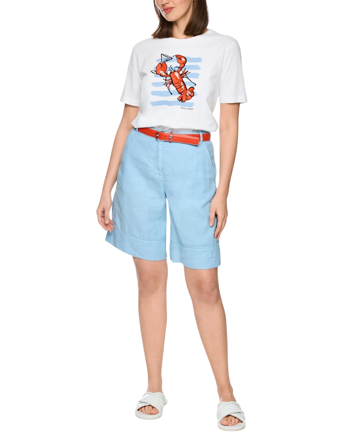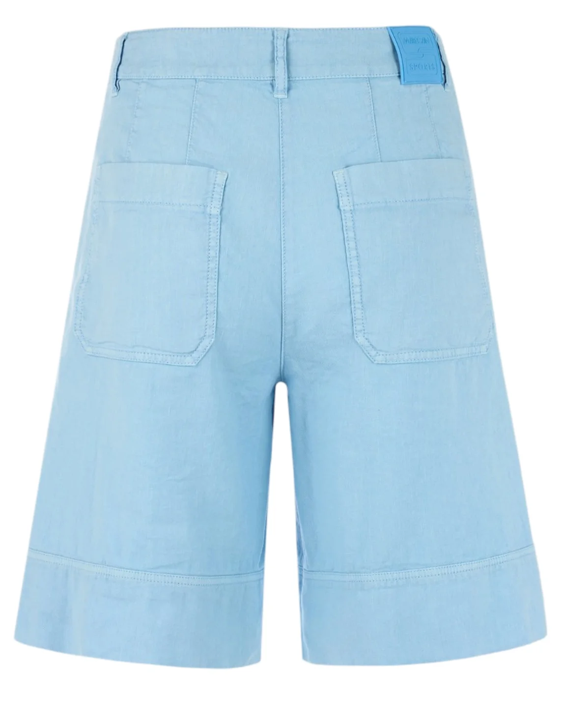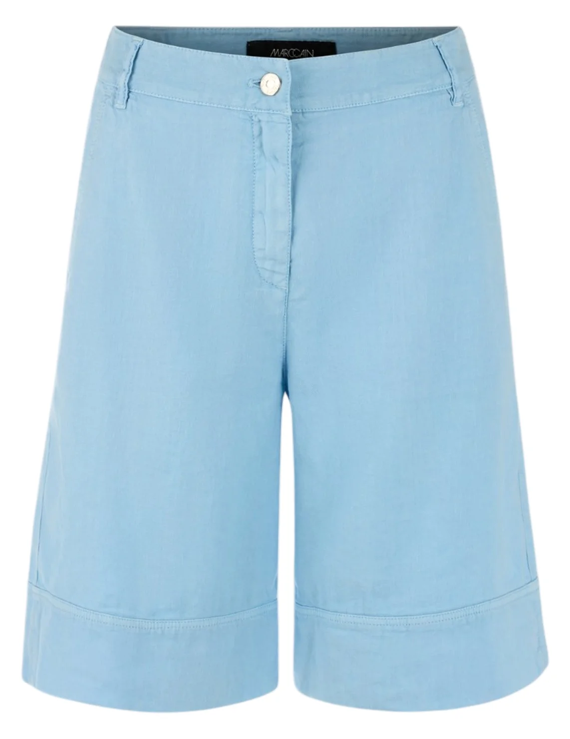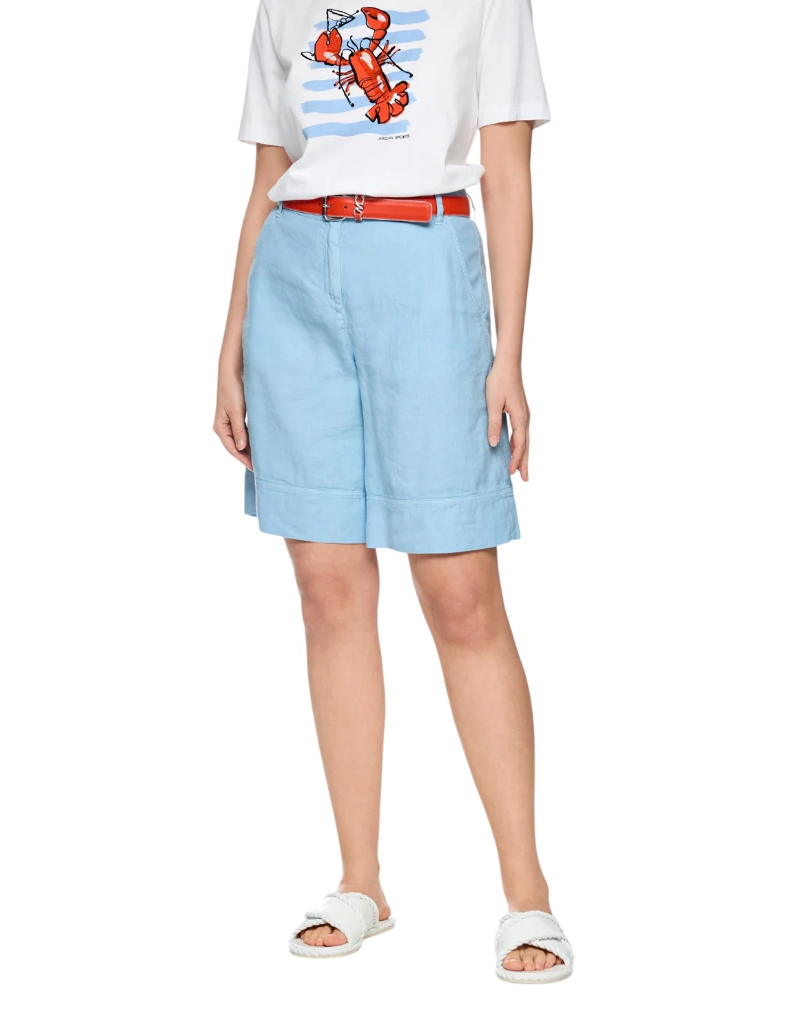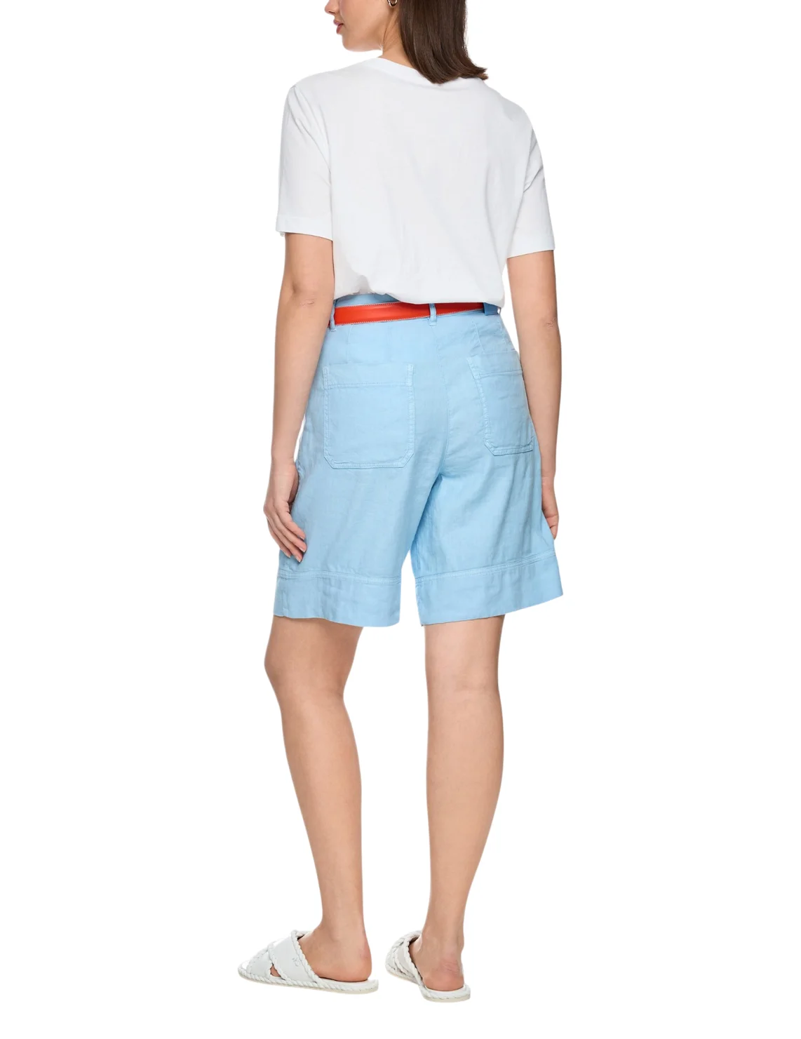 Шорты изготовлены из хлопка, льна и эластана. Модель выполнена в прямом крое. Имеет шлевки для ремня, прорезные и накладные карманы, скрытую застежку на молнии и пуговице.