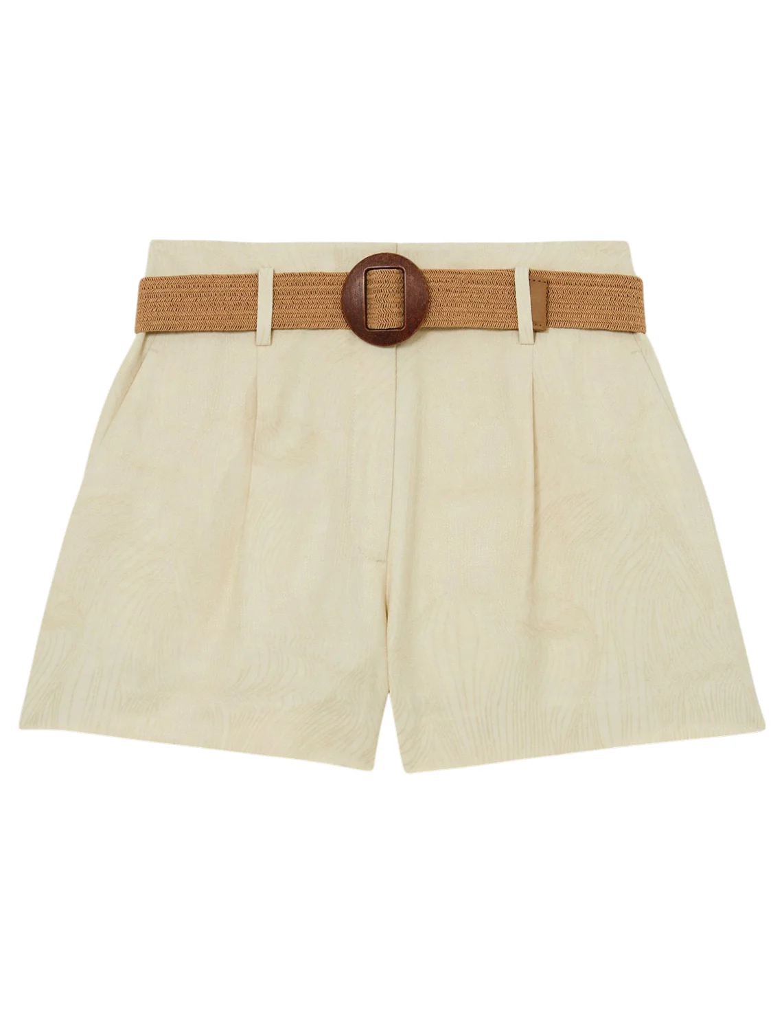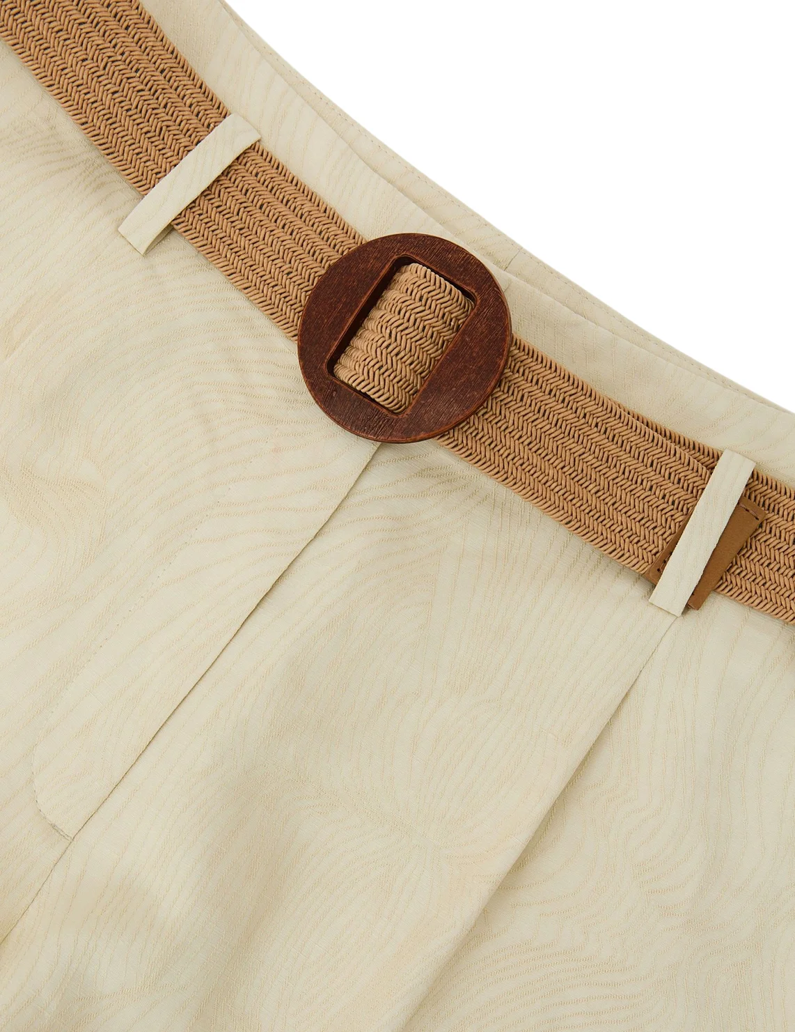 Шорты изготовлены из нейлона, вискозы и льна. Модель выполнена в свободном крое. Имеет шлёвки для ремня, плетеный пояс с эффектом соломы, скрытую застежку-молнию с крючком, прорезные боковые и задние карманы. Декорированы абстрактным принтом и складками.