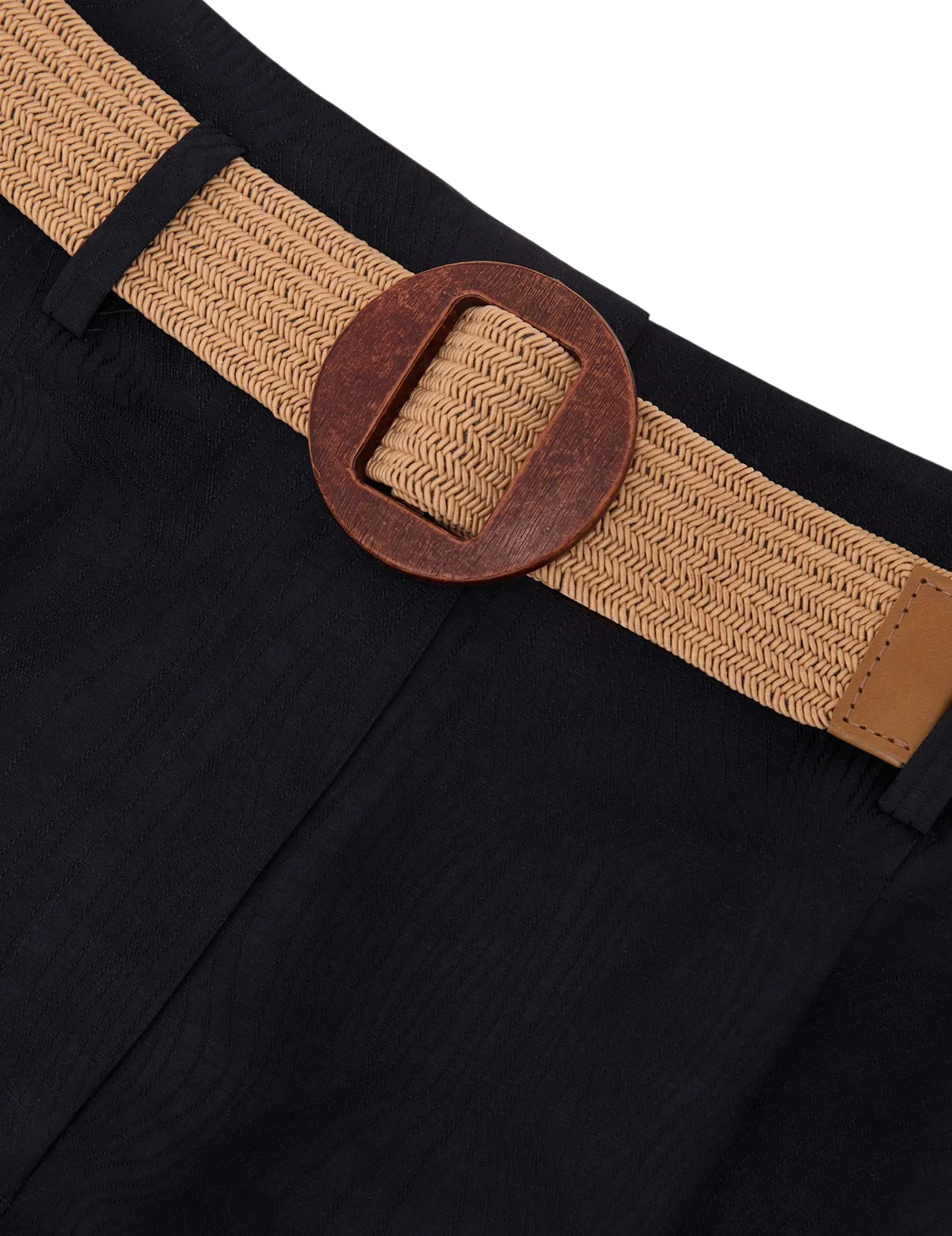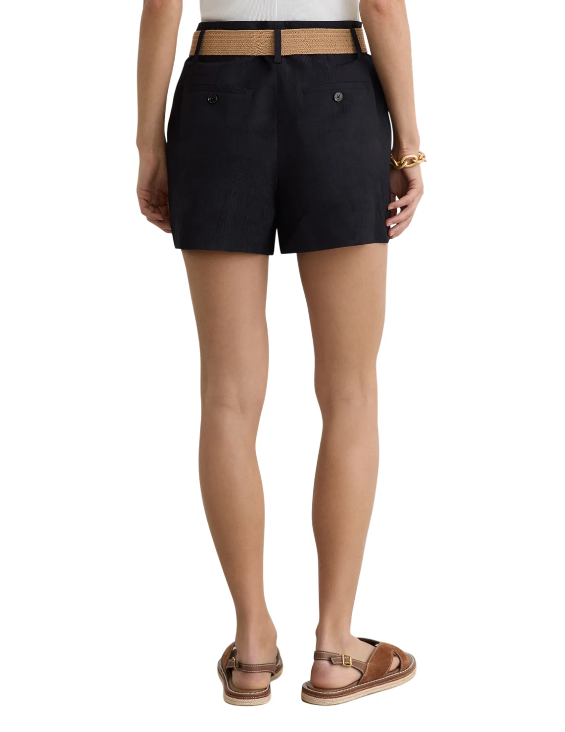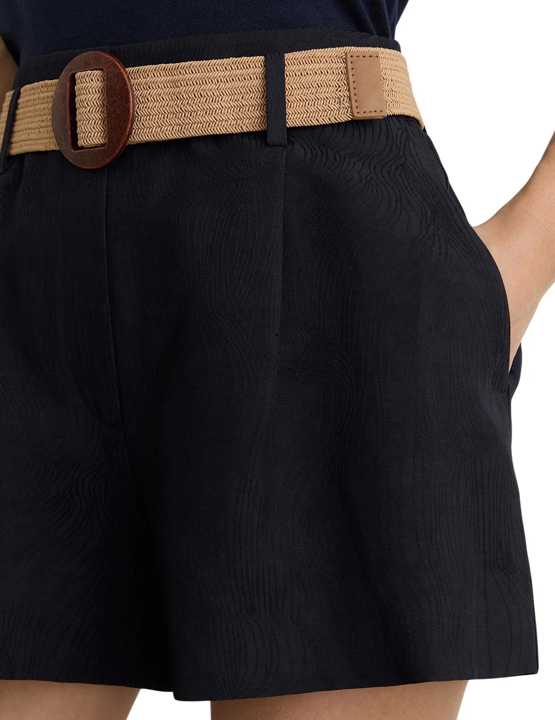 Шорты изготовлены из нейлона, вискозы и льна. Модель выполнена в свободном крое. Имеет шлёвки для ремня, плетеный пояс с эффектом соломы, скрытую застежку-молнию с крючком, прорезные боковые и задние карманы. Декорированы абстрактным принтом и складками.