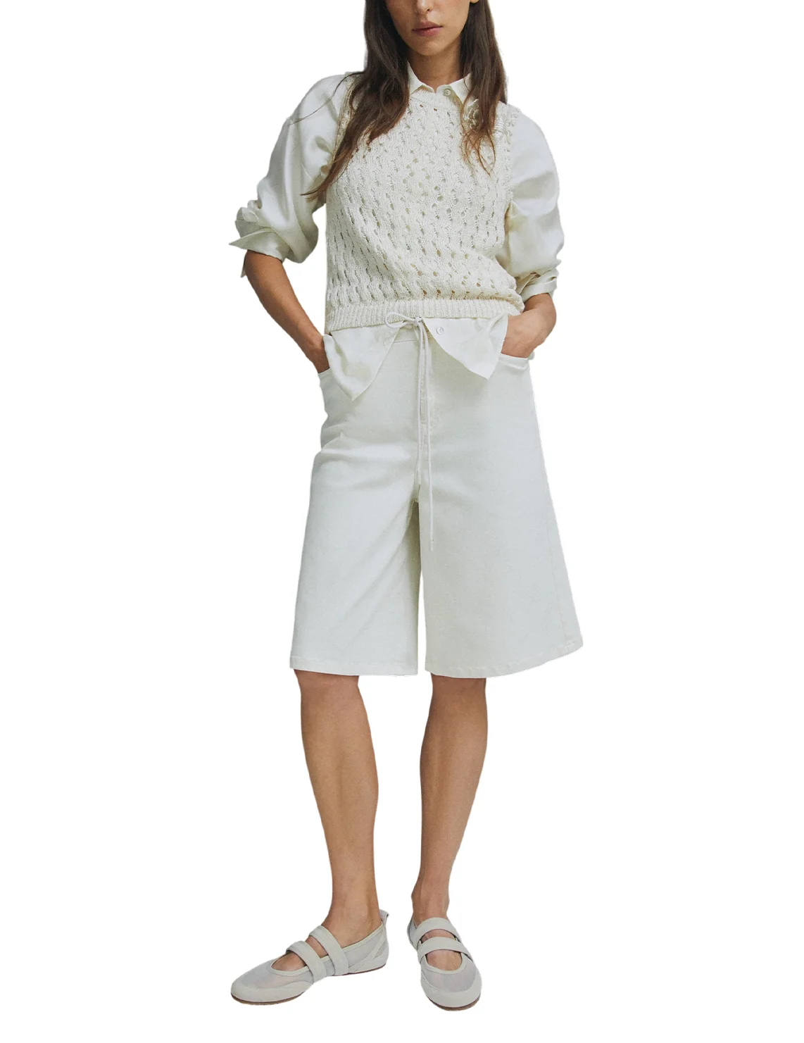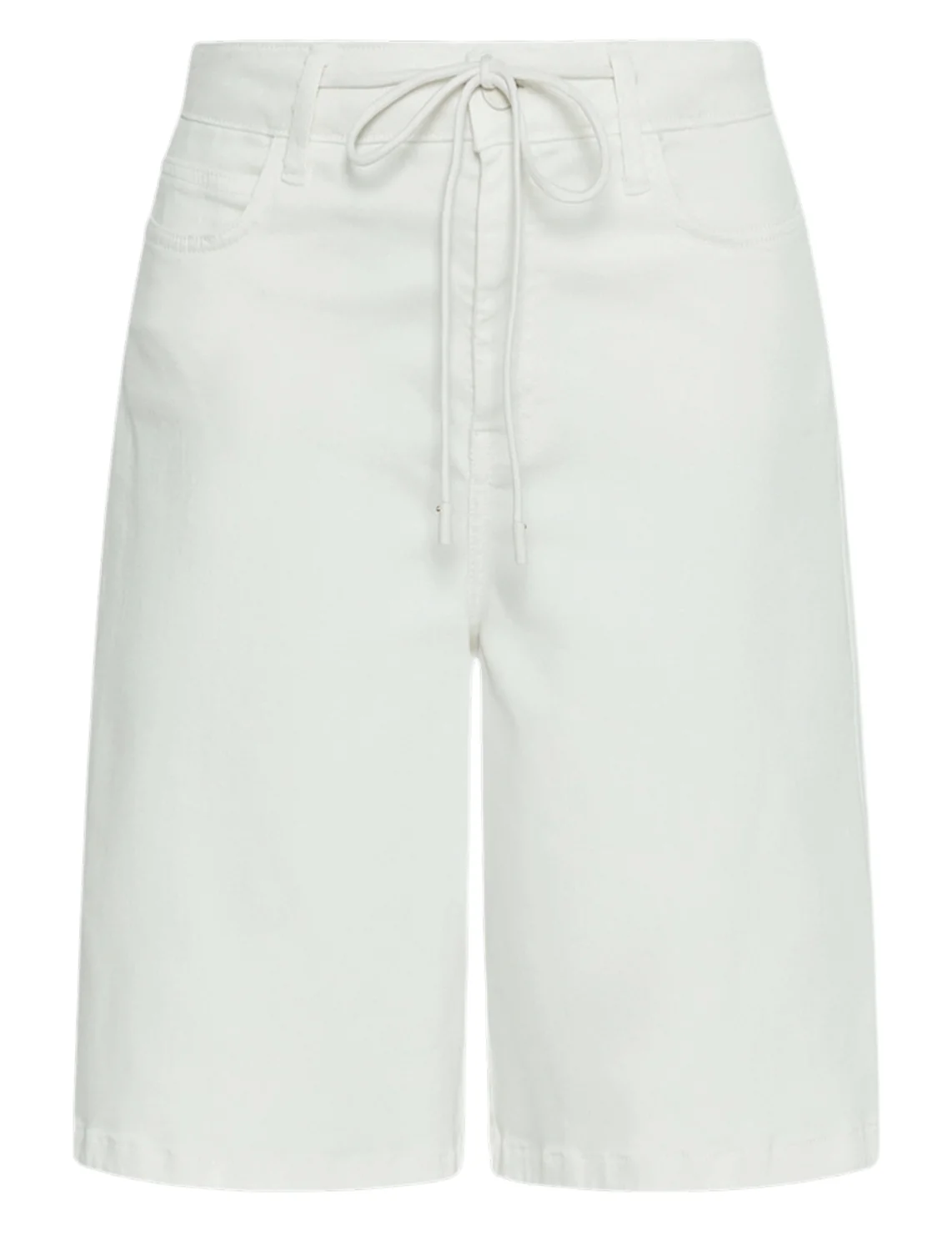 Джинсовые шорты изготовлены из лиоцелла, хлопка, полиэстера и эластана. Модель выполнена в свободном крое. Имеет шлёвки для ремня, скрытую застежку-молнию с пуговицей, кулиску и передние прорезные и задние накладные карманы.