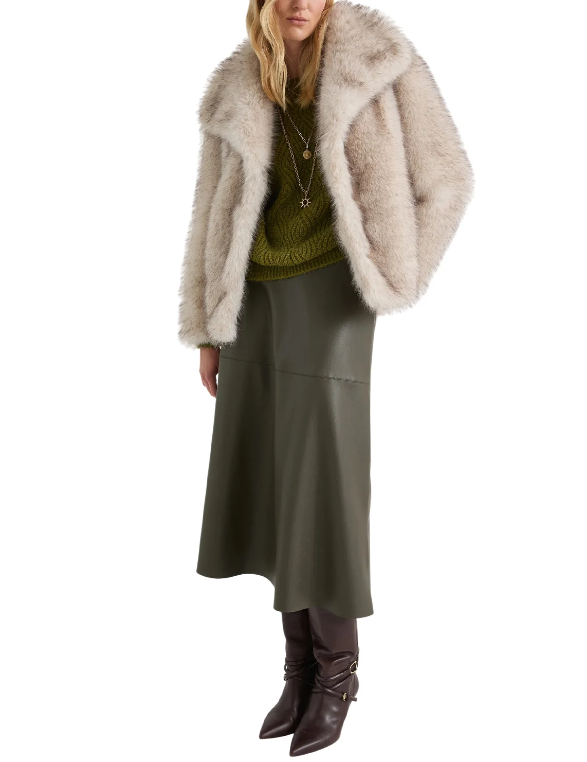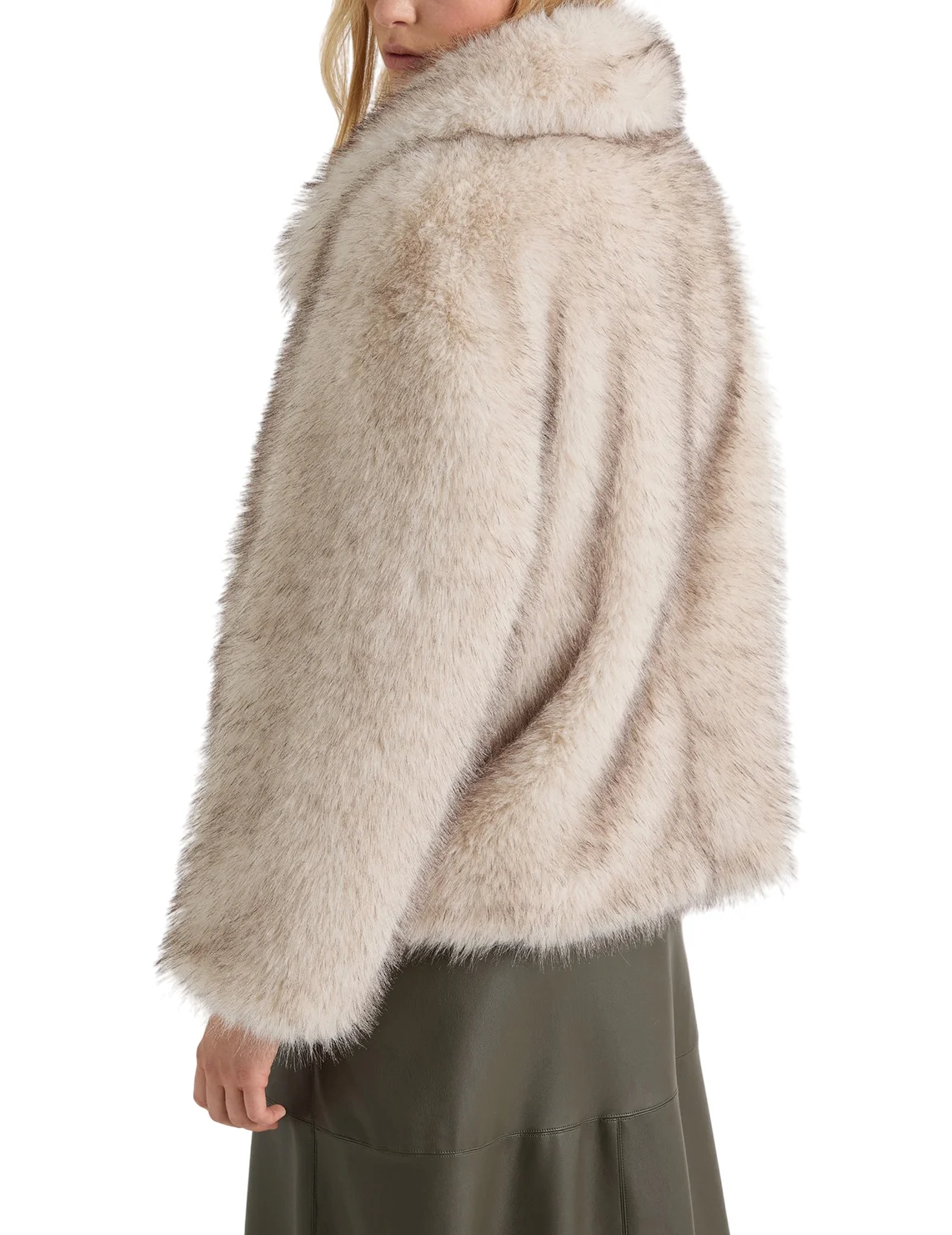 Шуба изготовлена из 100% полиэстера, подкладка из полиэстера и вискозы. Модель выполнена в свободном крое. Имеет отложной воротник, длинные рукава, скрытую застежку на кнопках и прорезные карманы.