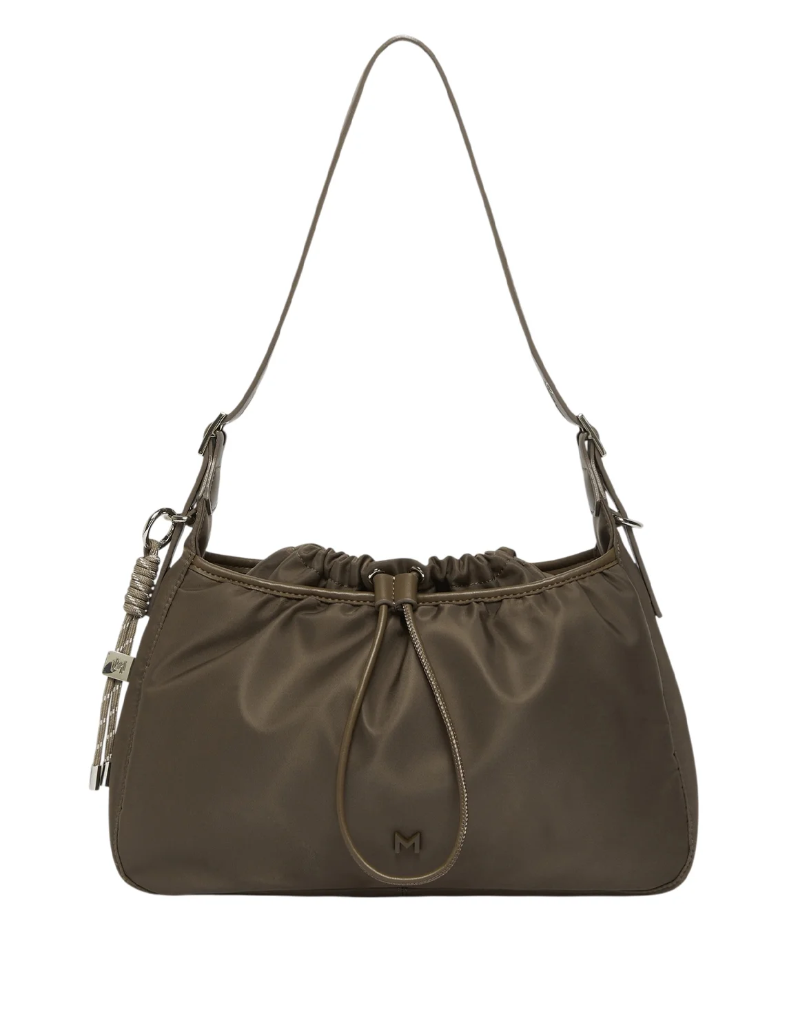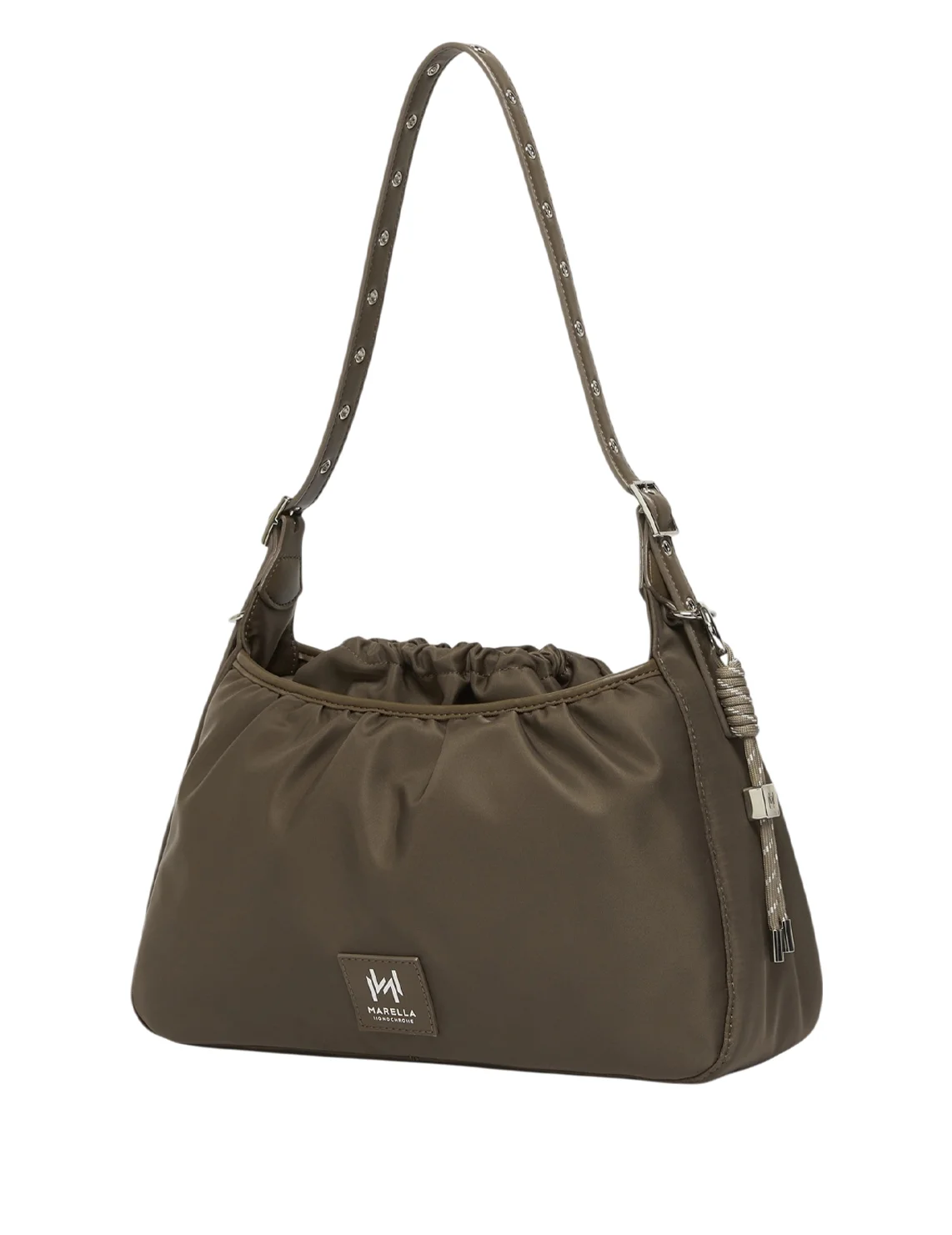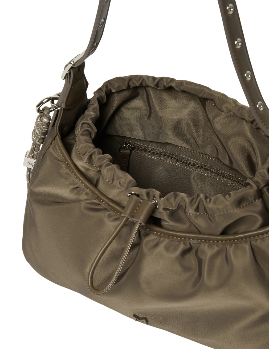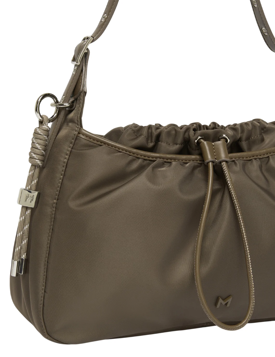 Сумка изготовлена из полиэстера. Модель имеет регулируемый плечевой ремень, застегивается на шнурок, внутренний карман на молнии. Декорирована блестящими металлическими аксессуарами с никелевым покрытием и логотипом бренда.
