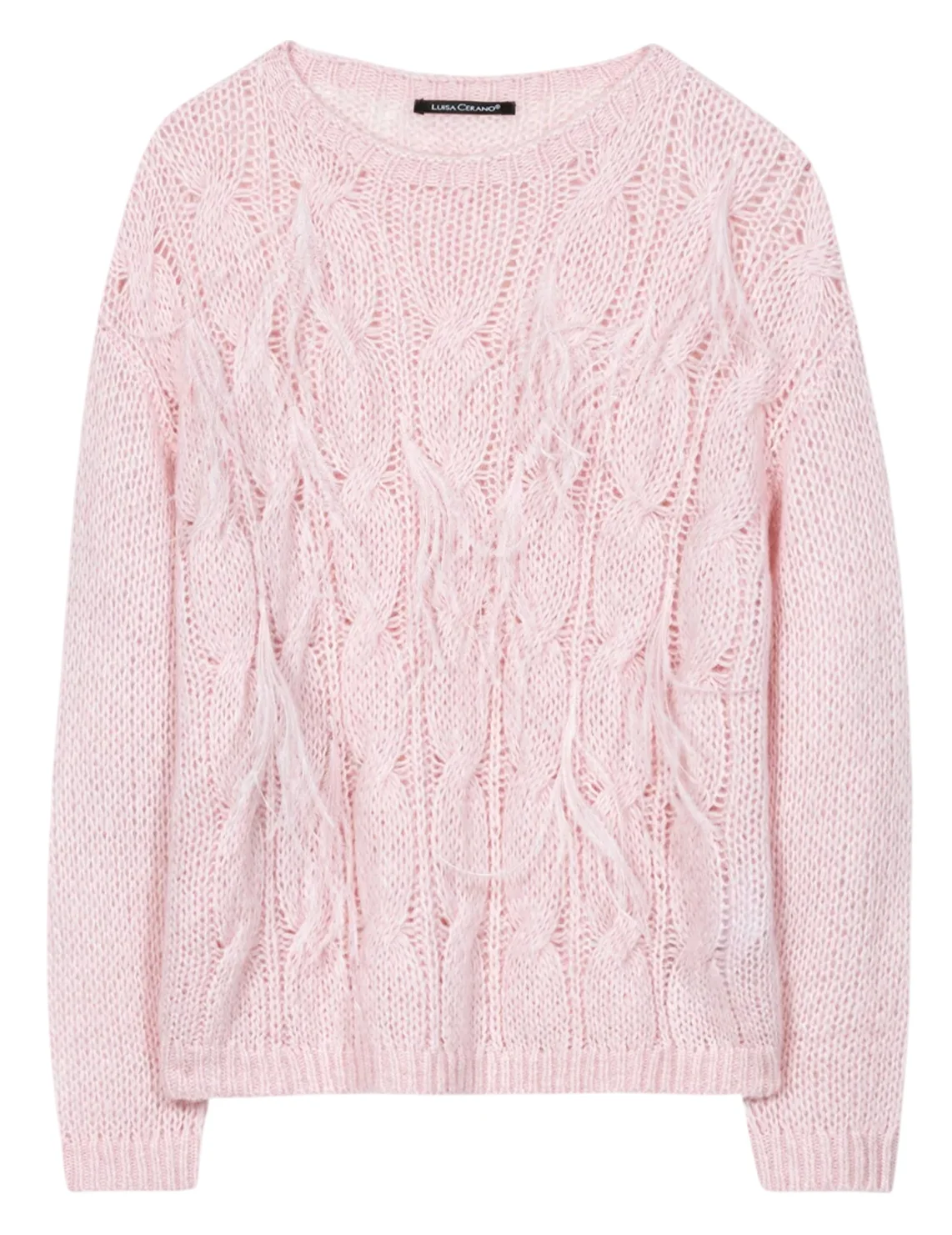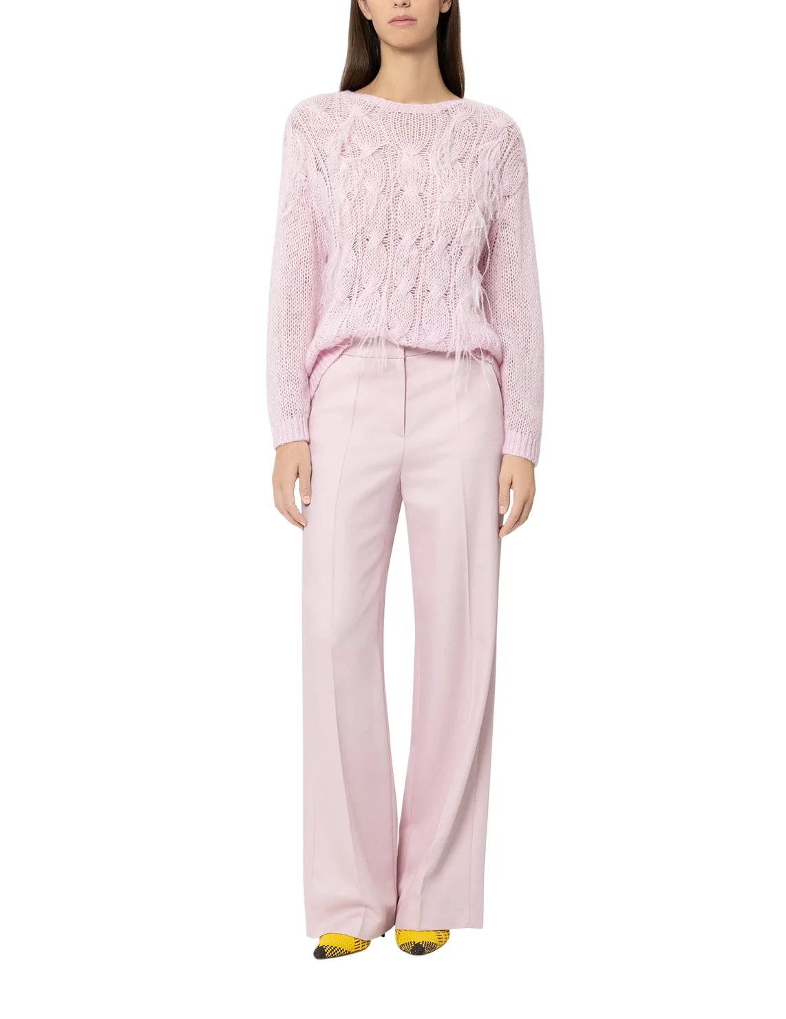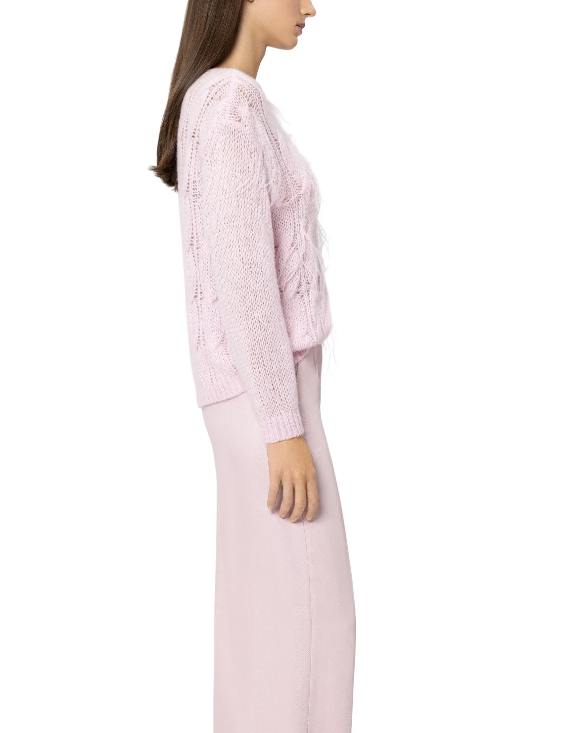 Свитер изготовлен из полиамида, альпаки, шерсти и лиоцелла. Модель выполнена в свободном крое. Имеет круглый вырез горловины, заниженную плечевую линию и длинные рукава с манжетами. Декорирован перьями.