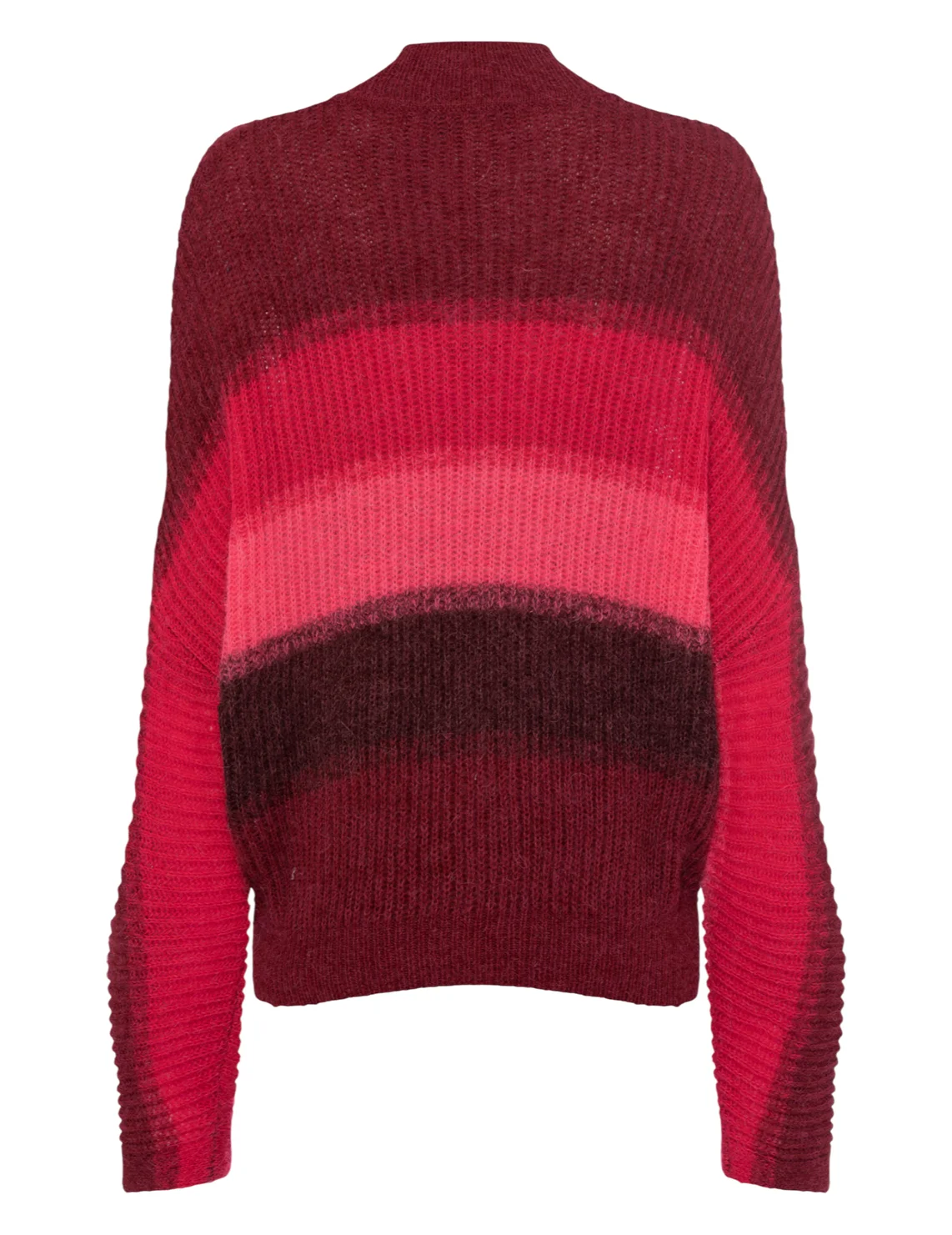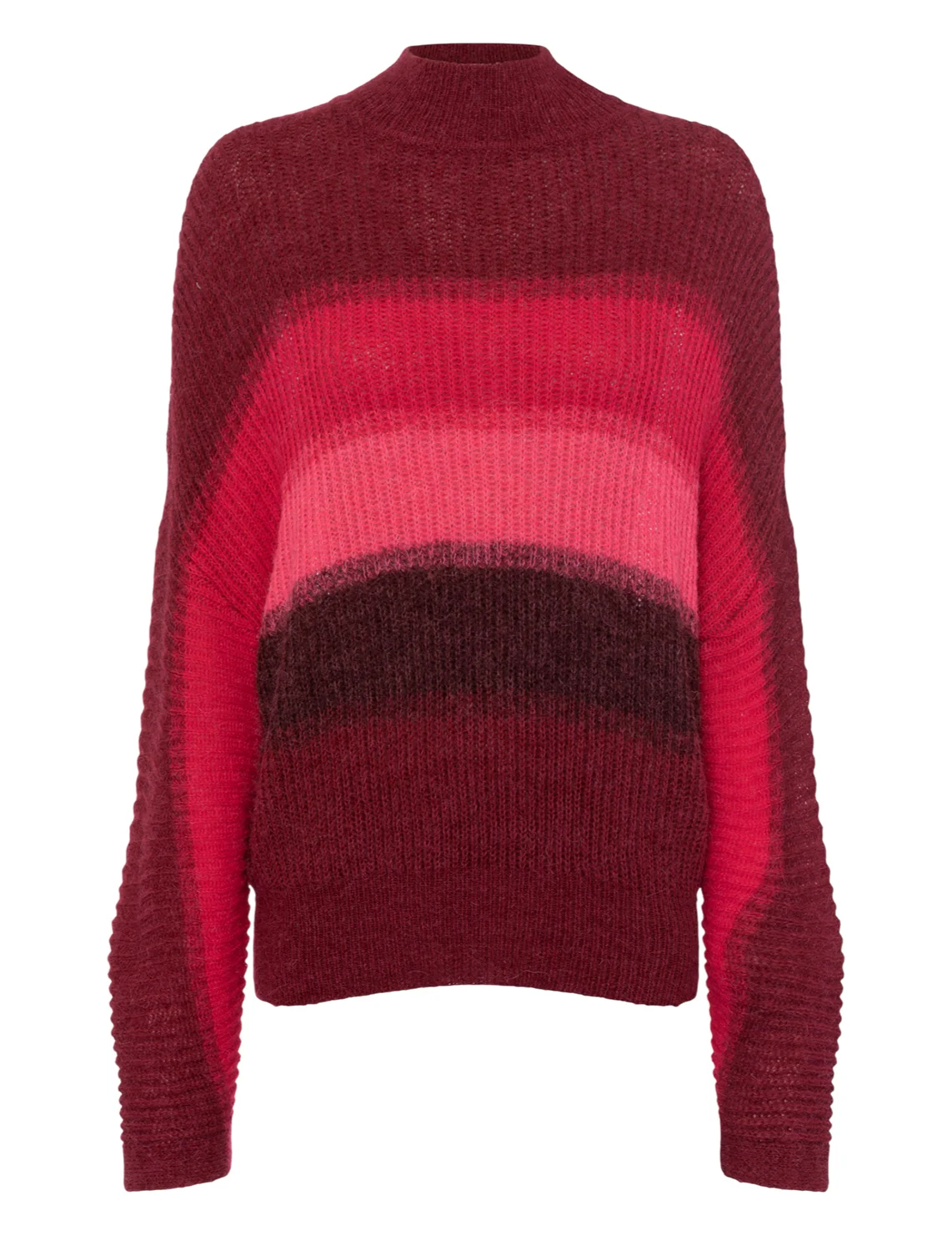 Свитер изготовлен из полиамида, полиакрила, шерсти и альпаки. Модель выполнена в свободном крое. Имеет воротник стойку и длинные рукава с манжетами. Декорирован принтом в полоску.
