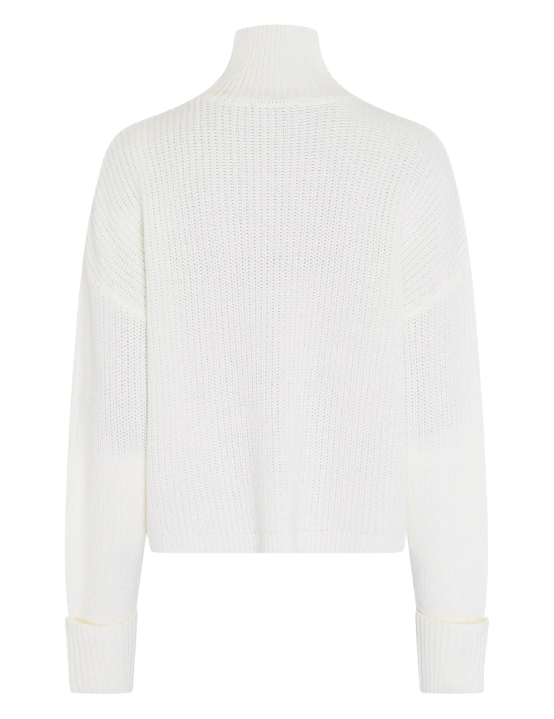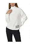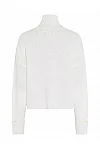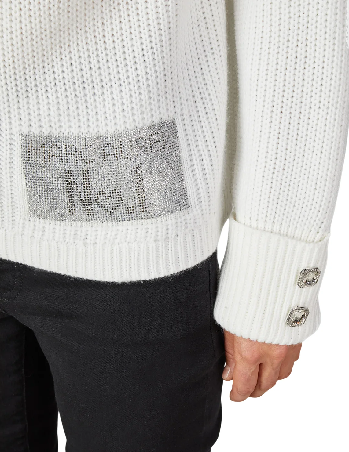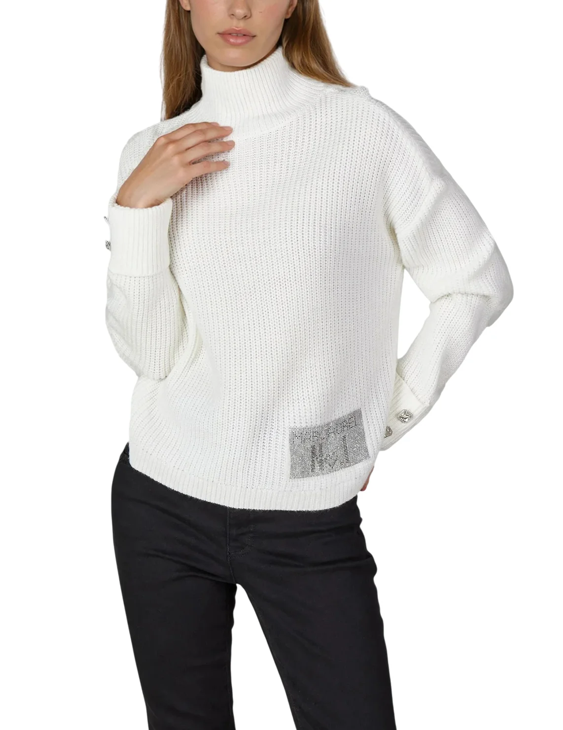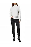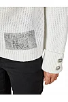 Свитер изготовлен из полиакрила, полиамида и шерсти. Модель выполнена в свободном крое. Имеет воротник-стойку, длинные рукава с отворотами на пуговицах и заниженную плечевую линию. Декорирован стразами.