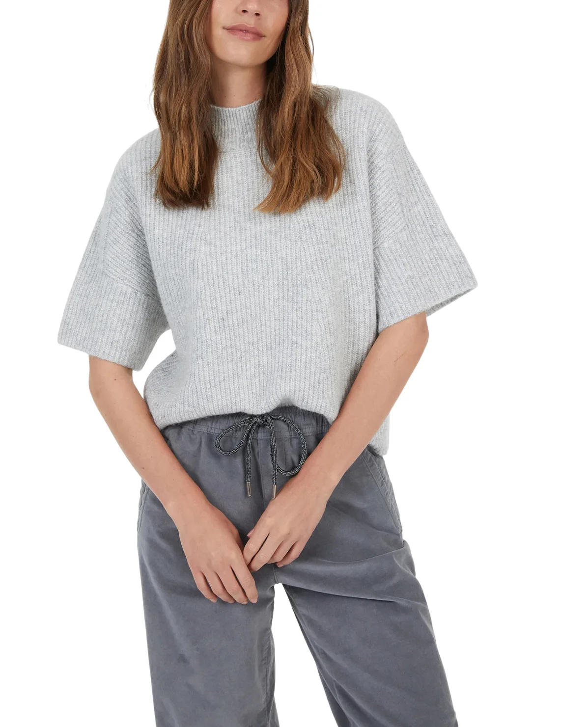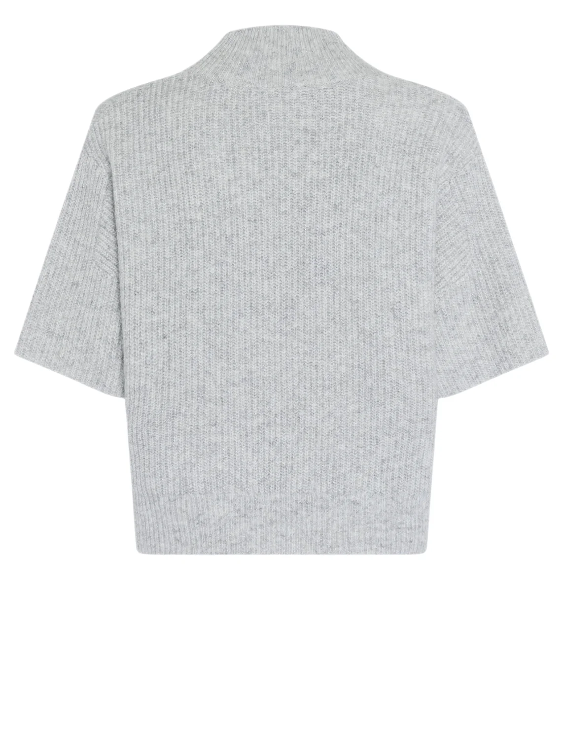 Свитер изготовлен из полиэстера, полиамида, шерсти, альпаки и эластана. Модель выполнена в свободном крое. Имеет воротник-стойку и короткие рукава.