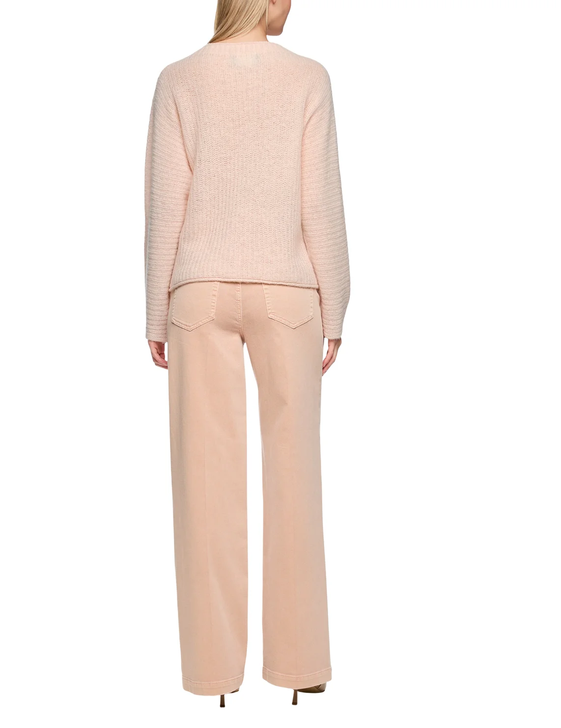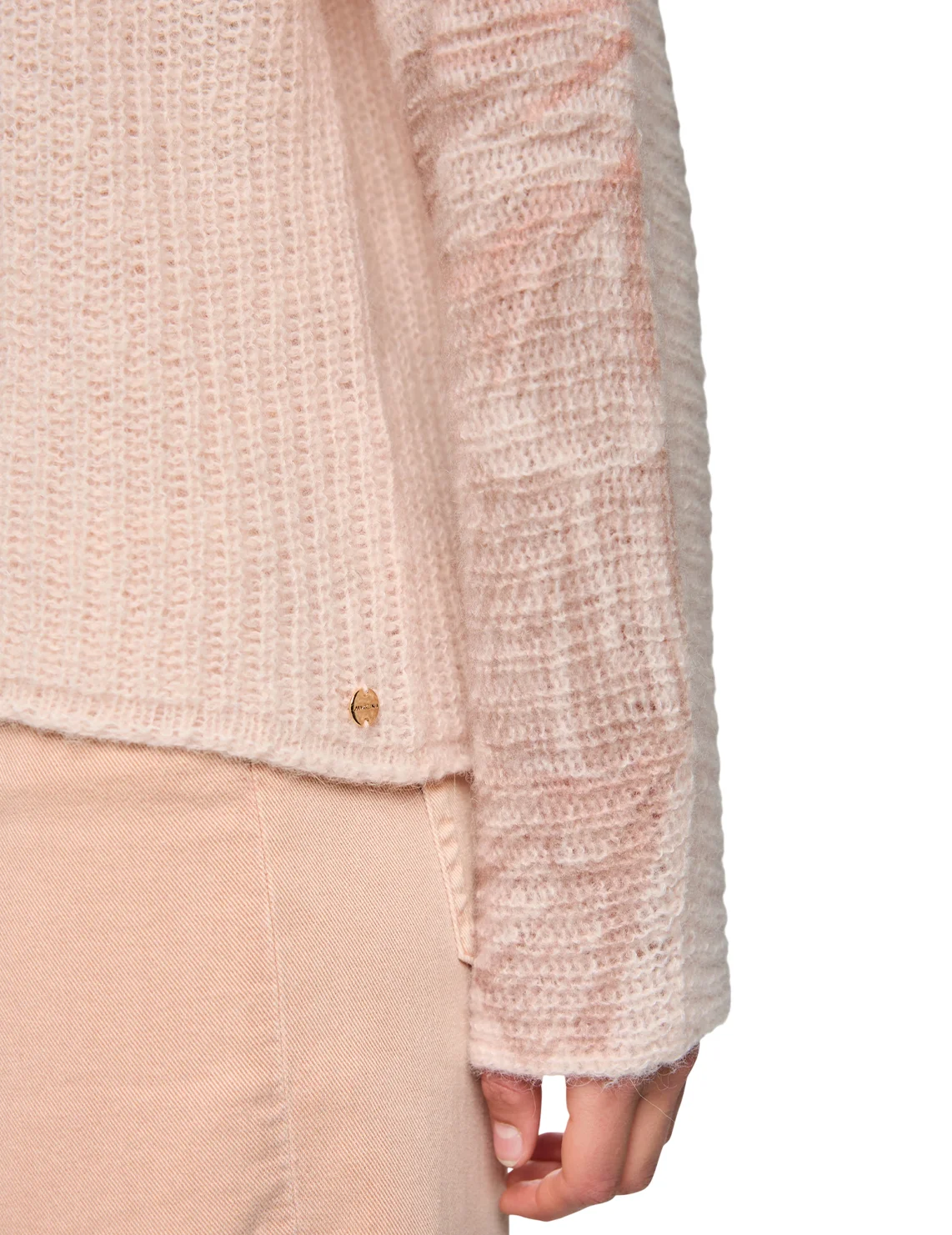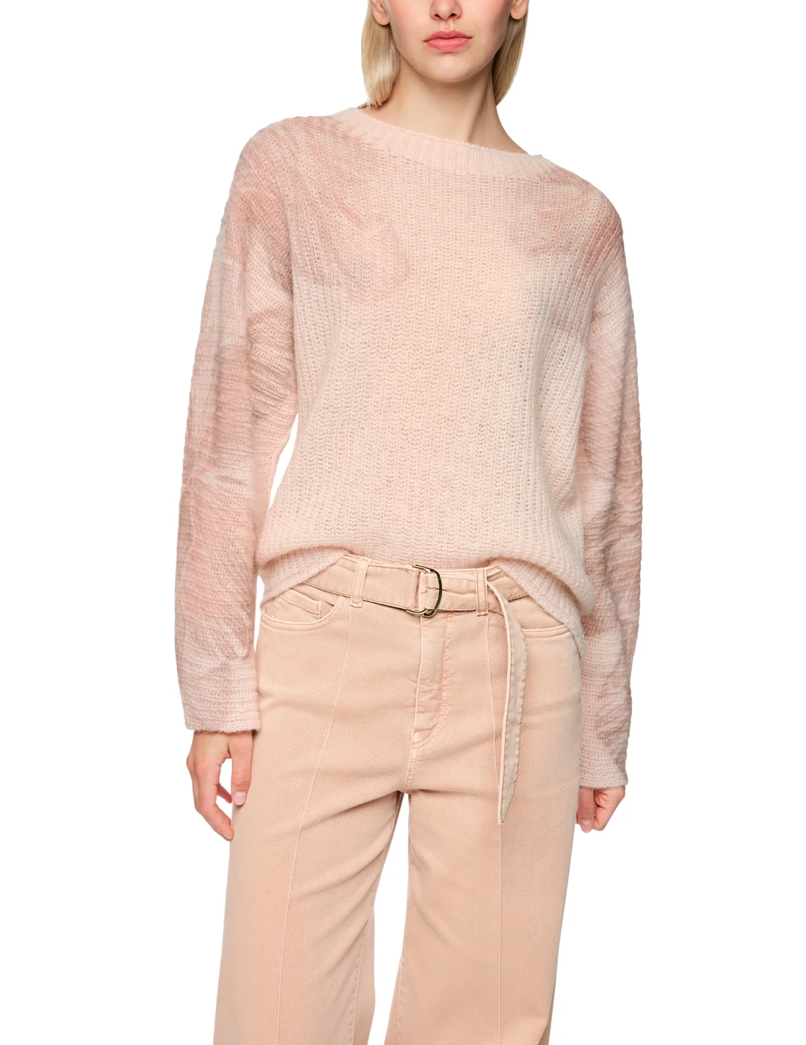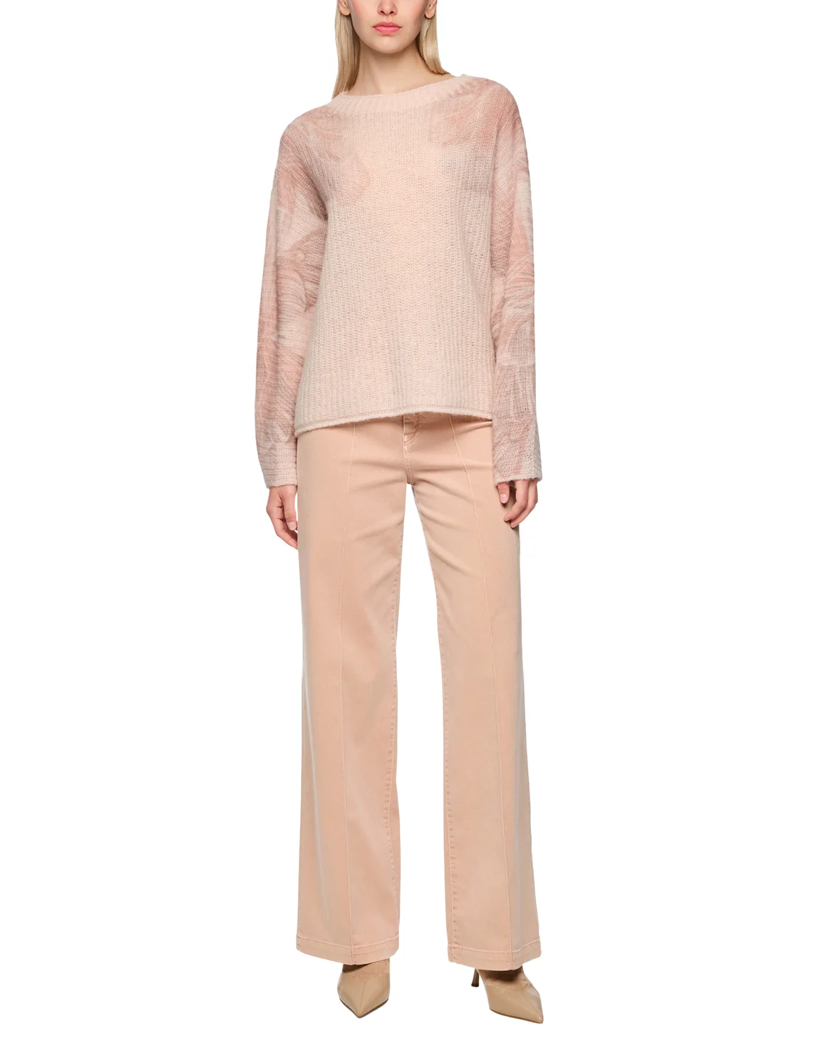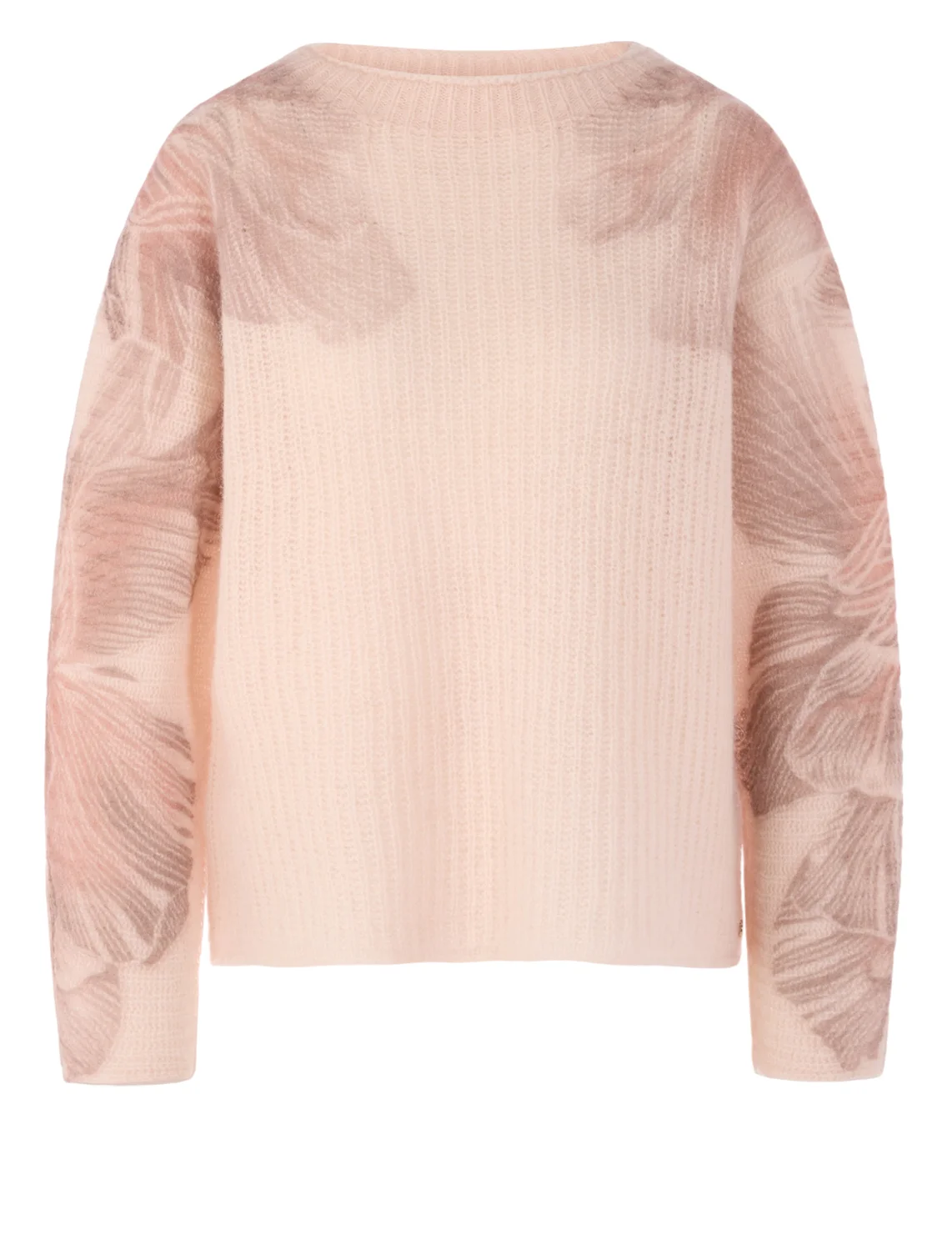 Свитер изготовлен из альпаки, полиамида и шерсти. Модель выполнена в свободном крое. Имеет круглый вырез горловины, заниженную плечевую линию и длинные рукава. Декорирован цветочным принтом.