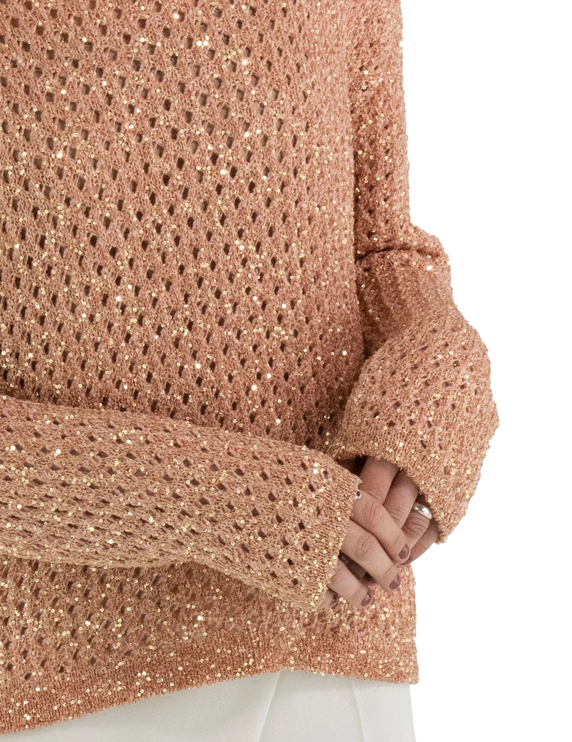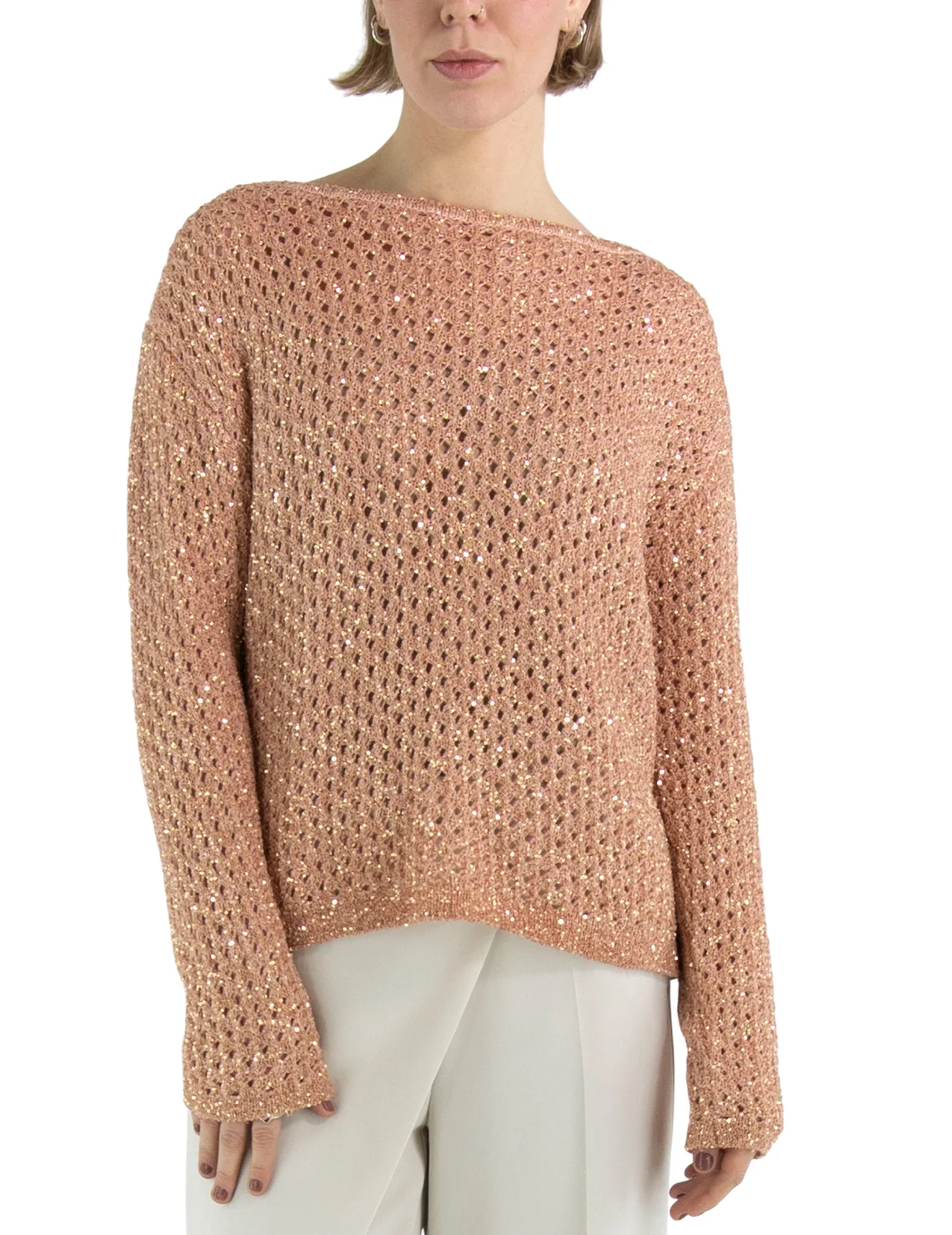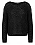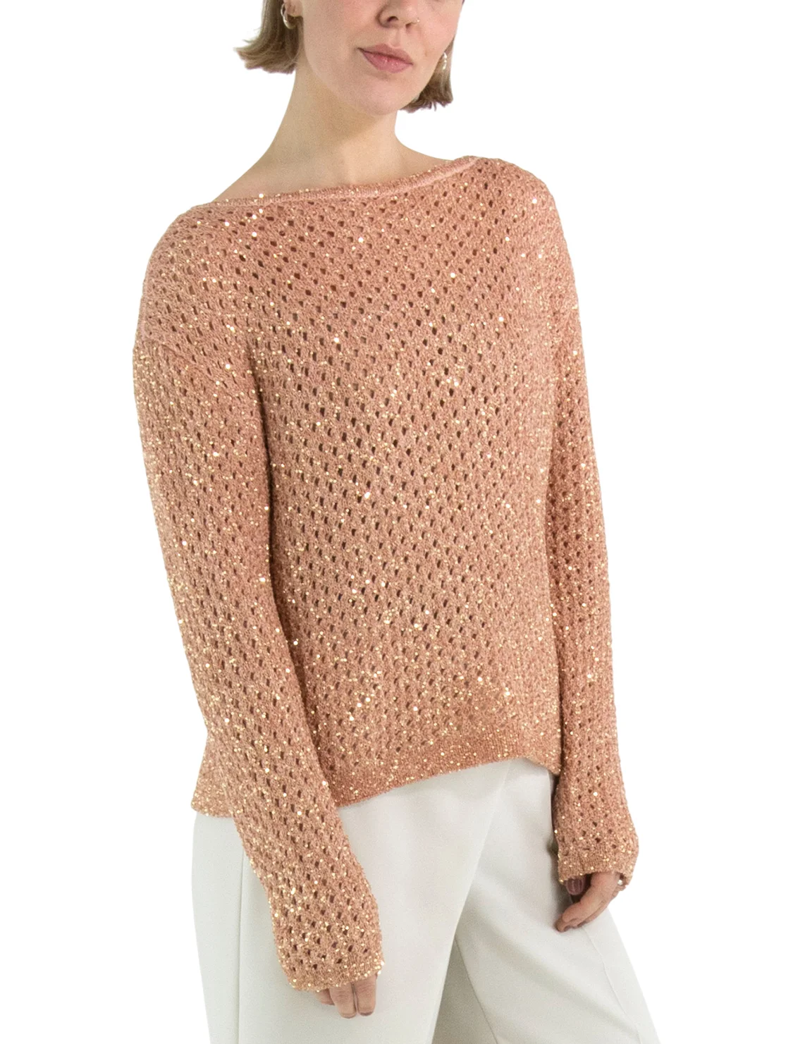 Свитер изготовлен из полиамида, полиакрила и шерсти. Модель выполнена в свободном крое. Имеет круглый вырез горловины, заниженную плечевую линию и длинные рукава. Декорирован перфорацией и пайетками.