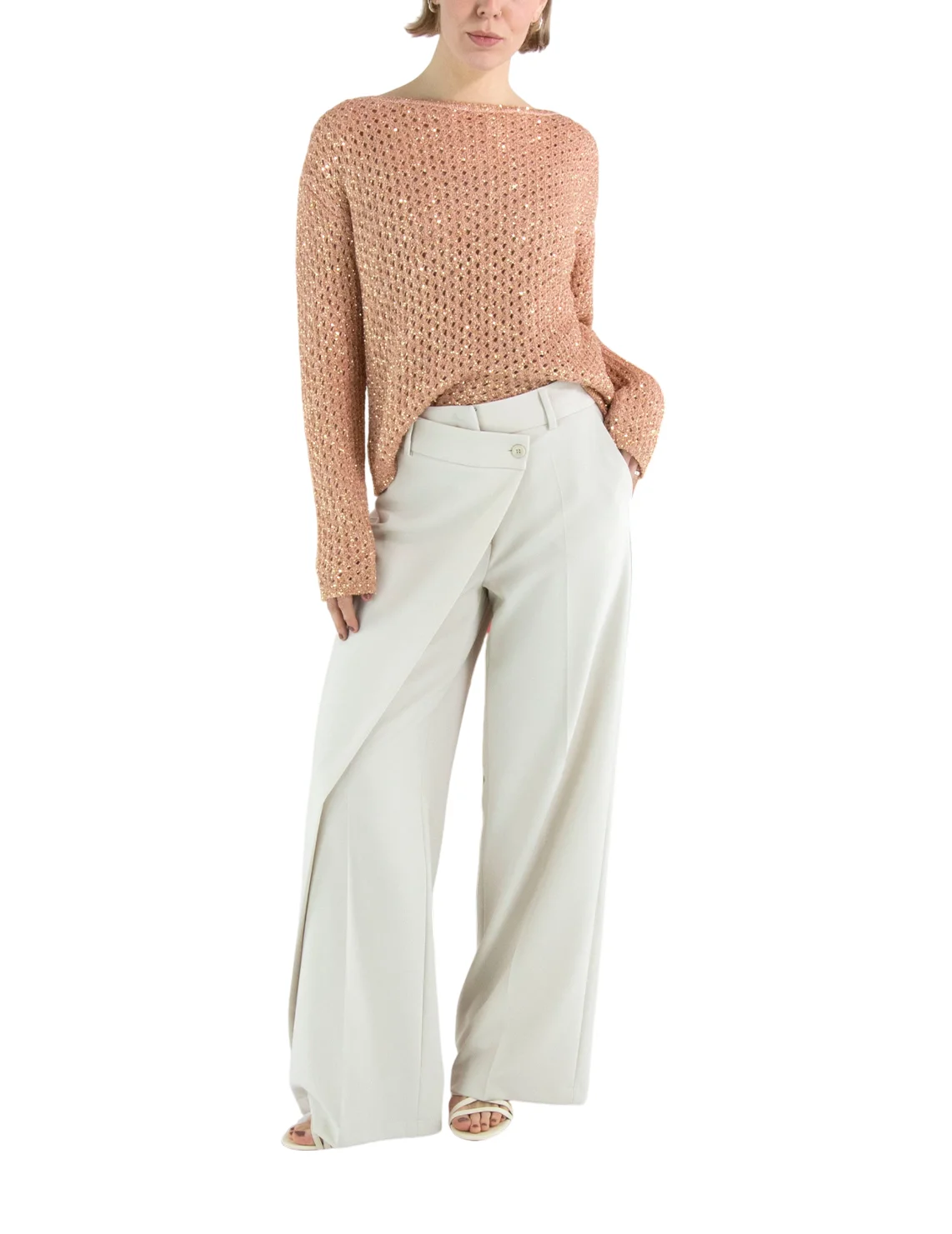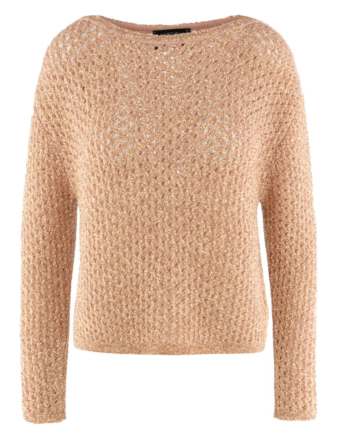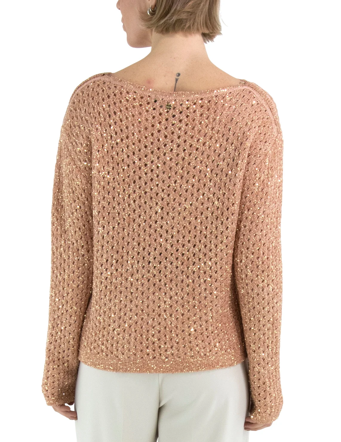 Свитер изготовлен из полиамида, полиакрила и шерсти. Модель выполнена в свободном крое. Имеет круглый вырез горловины, заниженную плечевую линию и длинные рукава. Декорирован перфорацией и пайетками.
