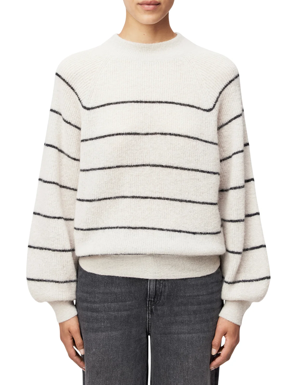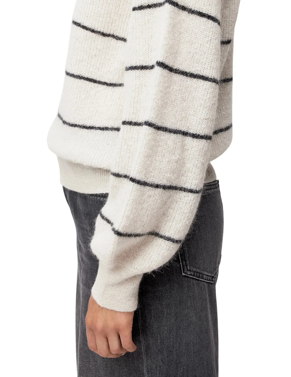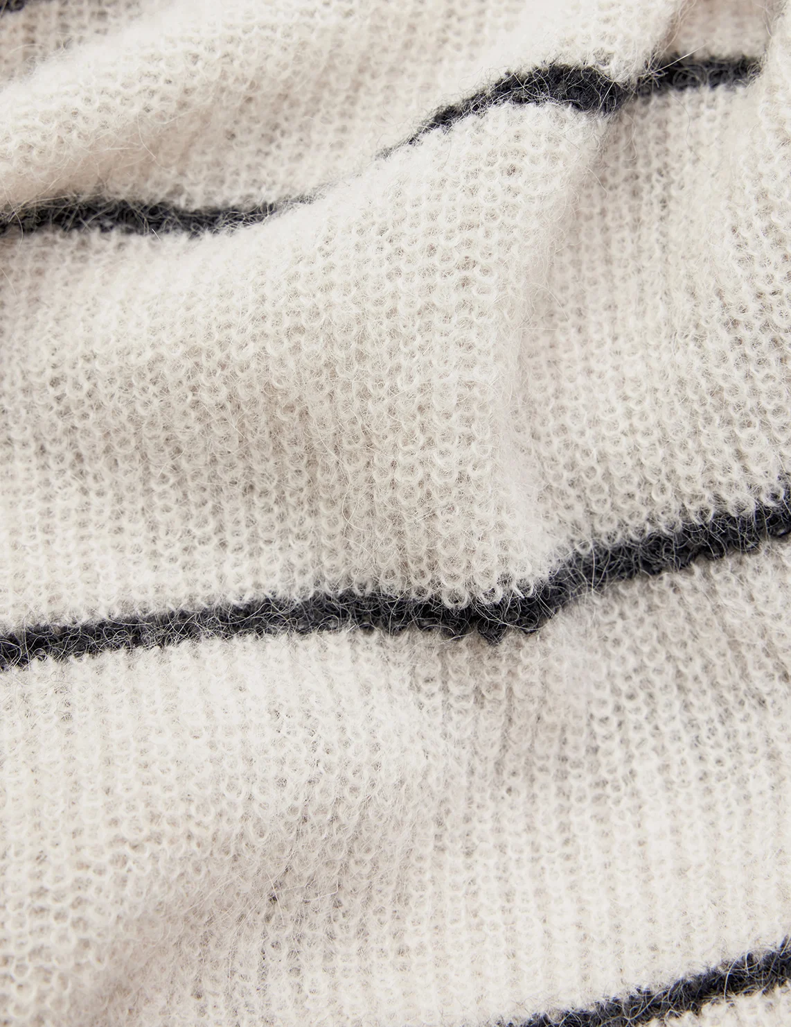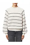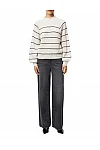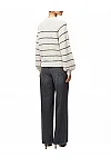 Свитер изготовлен из альпаки, полиамида и шерсти. Модель выполнена в свободном крое. Имеет воротник-стойку и длинные рукава с манжетами. Декорирован принтом в полоску.