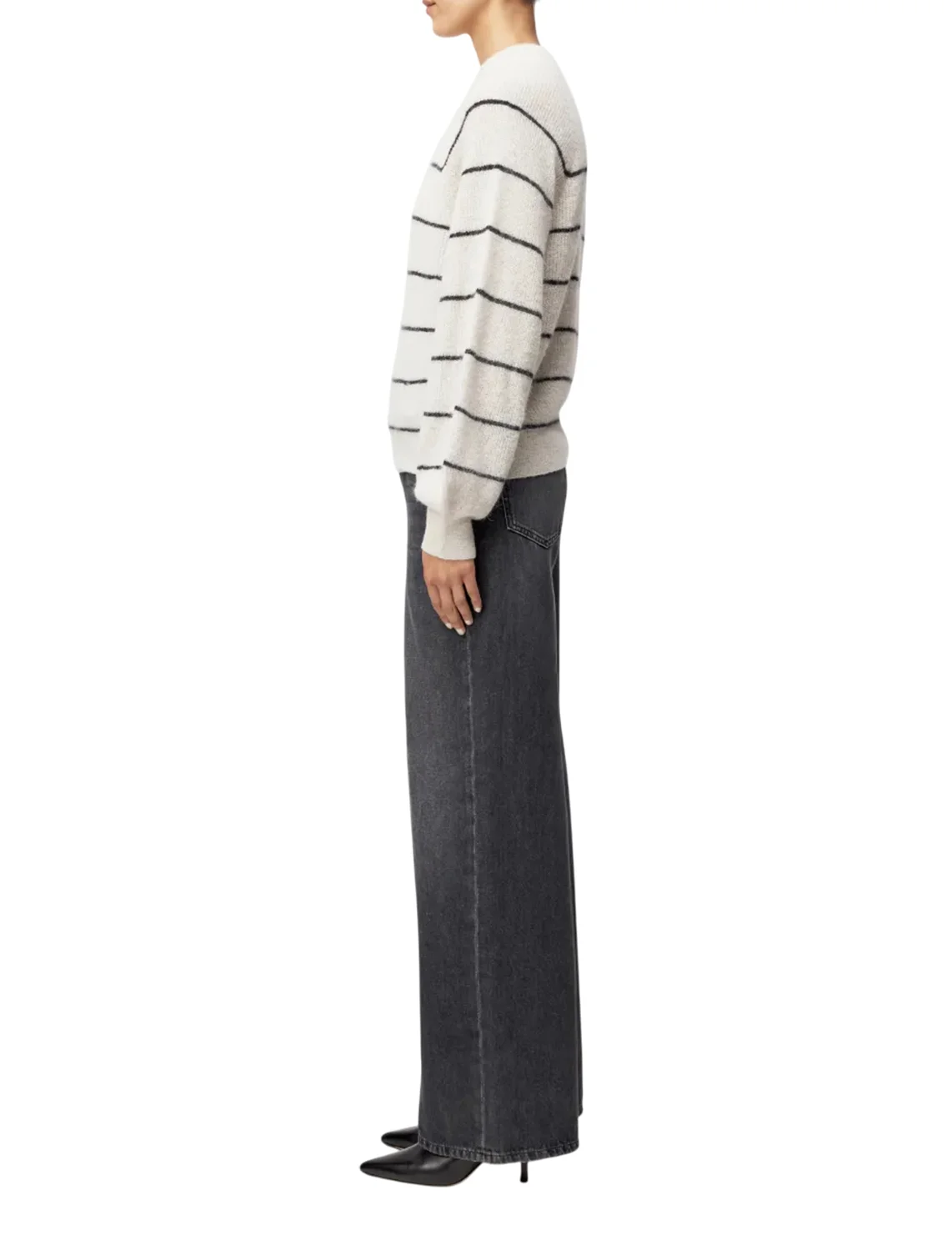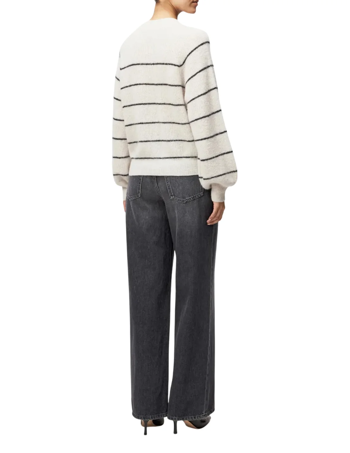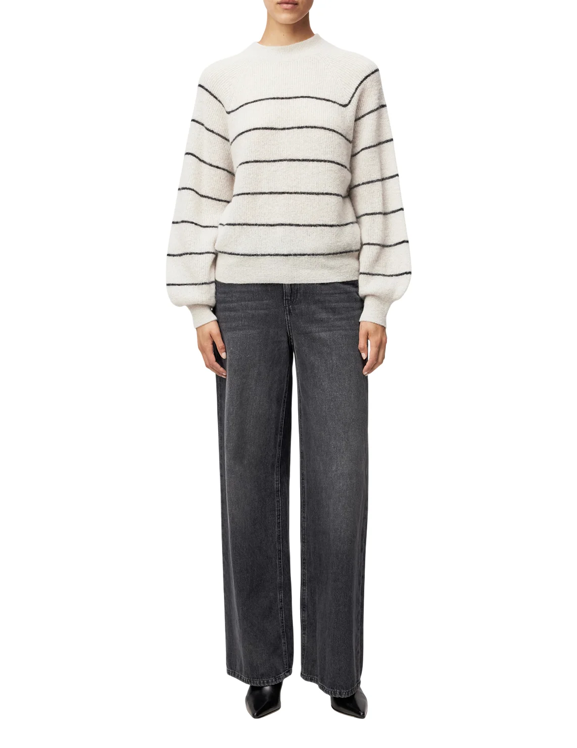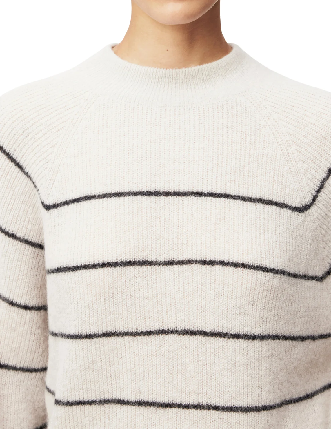 Свитер изготовлен из альпаки, полиамида и шерсти. Модель выполнена в свободном крое. Имеет воротник-стойку и длинные рукава с манжетами. Декорирован принтом в полоску.